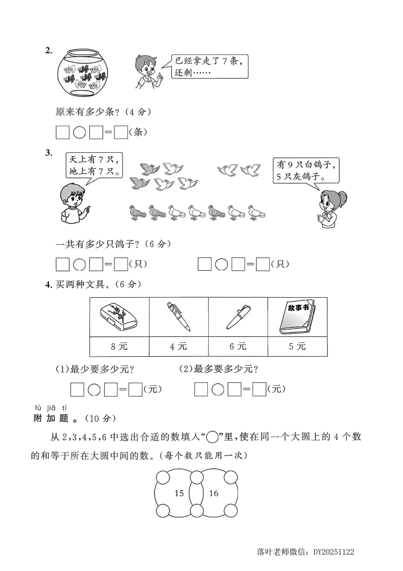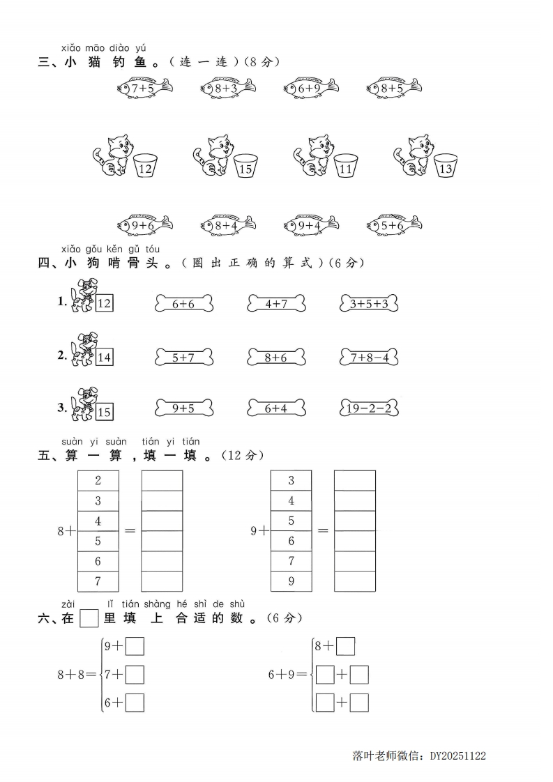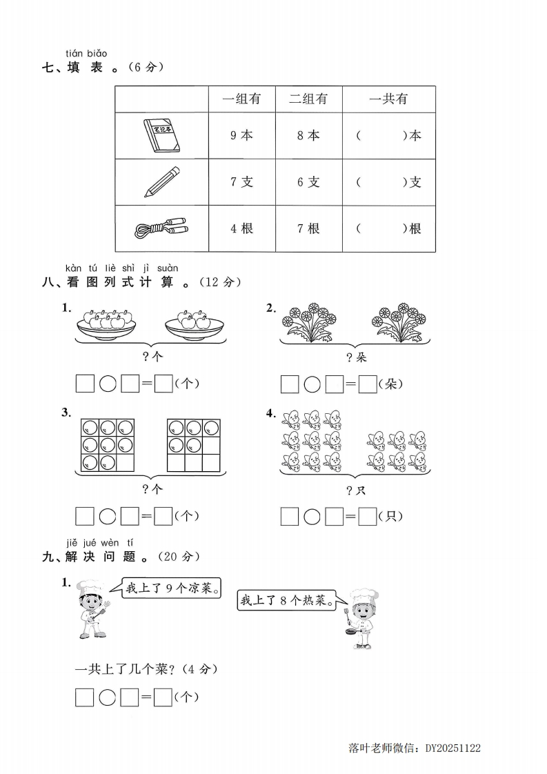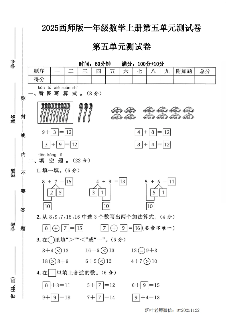 2025西师版一年级数学上册第五单元测试卷第五单元测试卷时间:60分钟满分:100分+10分题序三四五六七八九附加题总分得分kan tu xiěsuan shi一、看图写算式。(8分)弥自毁封线9+■=■□+□=□+□=内tian kong ti二、填空题。(22分)不1.填一填。(6分),+6要答2.从8,9,7,15,16中选3个数写出两个加法算式。(4分)荞题□O□-□☐O☐=☐3.在○里填“>”“<”或“=”。(6分)8+4○1316-6○1312○9+318○8+96+5○124+7○104.在里填上合适的数。(6分)8☐+3=115+☐=126+☐=159+☐=187+☐=14☐+4=13落叶老师微信:DY20251122