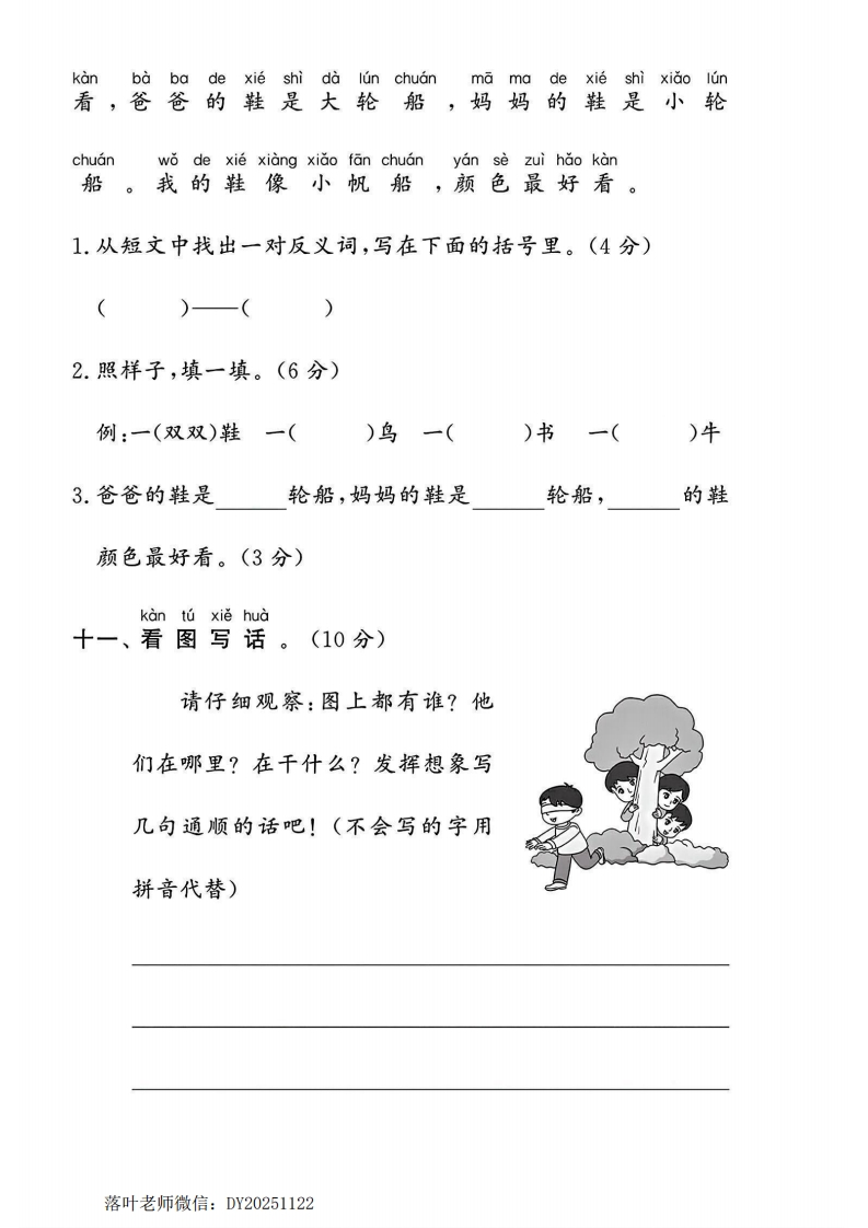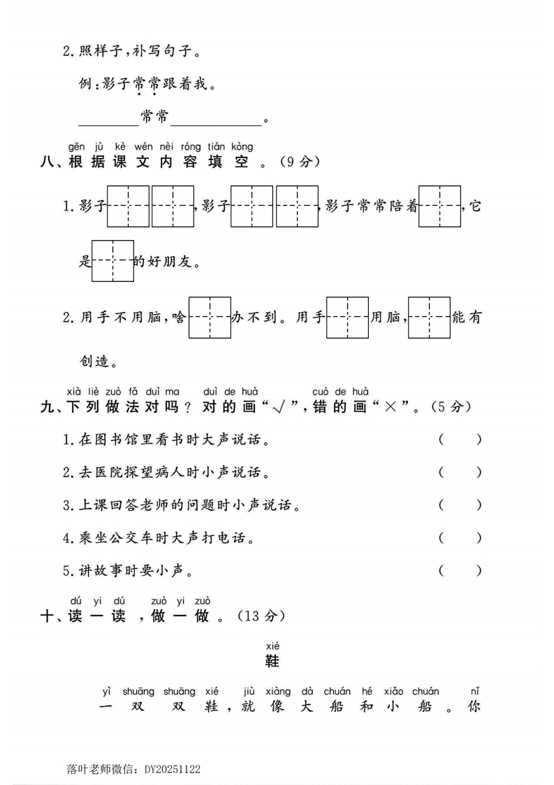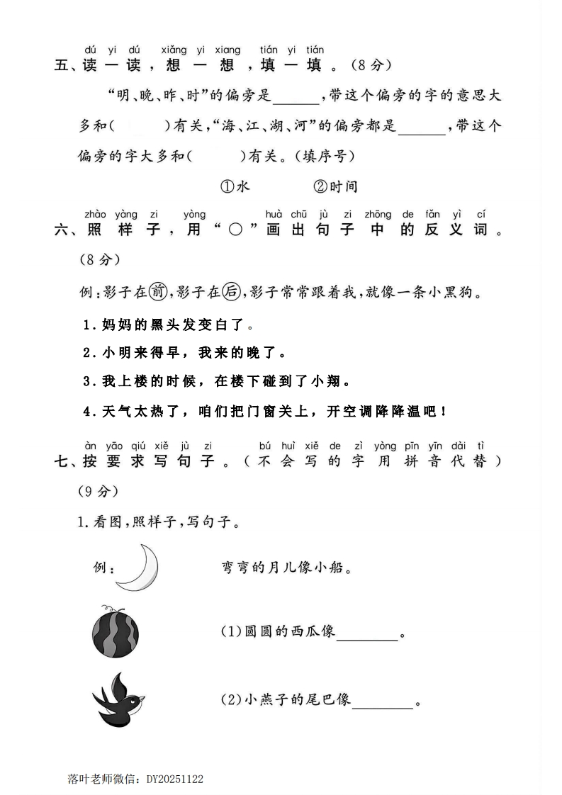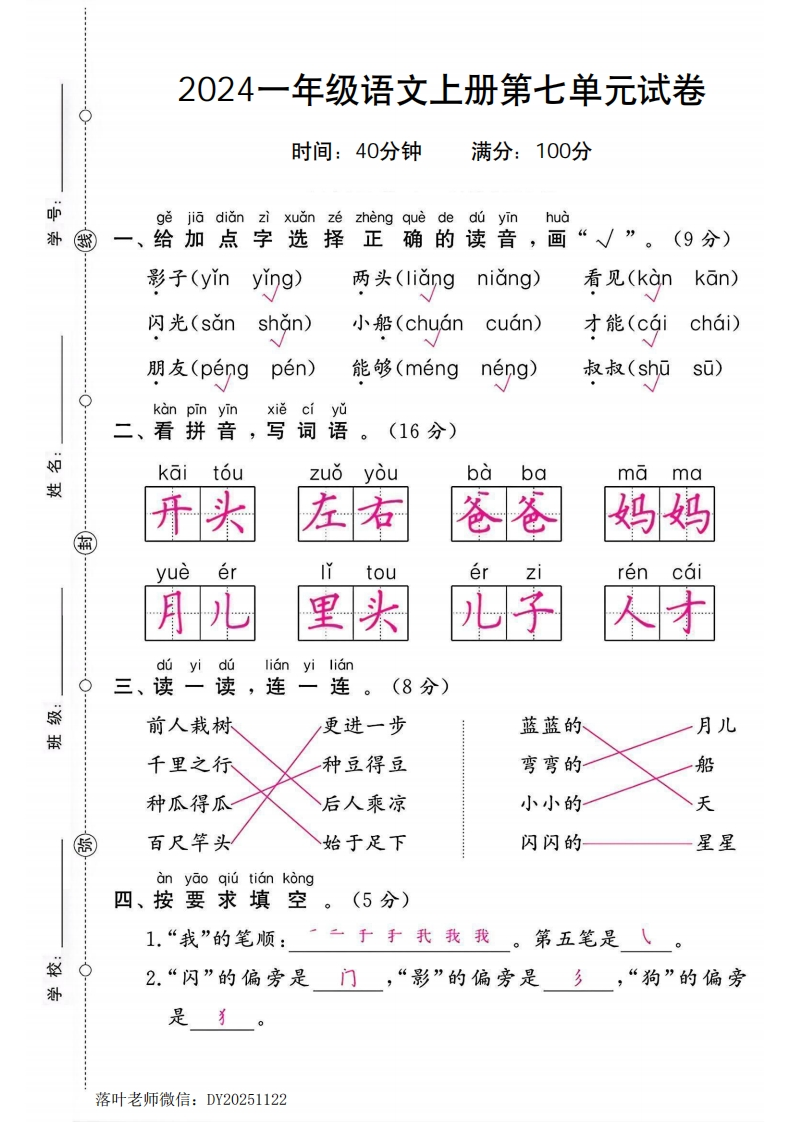 2024一年级语文上册第七单元试卷时间:40分钟满分:100分听ge jia dian zi xuan ze zheng que de du yinhua朴一、给加点字选择正确的读音,画“√”。(9分)影子(yinying)两头(Iingniang)看见(kànkan)闪光(sanshan)小船(chuancuan)才能(cichai)朋友(pengpen)能够(mengneng)叔叔(shūs0)kan pin yinxiěciyu二、看拼音,写词语。(16分)如kaitouZuǒyòubàbamama製yue_erItouerren caidu yi dulian yi lian三、读一读,连一连。(8分)杀前人栽树更进一步蓝蓝的月儿崇千里之行种豆得豆弯弯的船种瓜得瓜后人乘凉小小的天百尺竿头始于足下闪闪的星星an yao qiu tian kòng四、按要求填空。(5分)1.“我”的笔顺:。第五笔是轻2.“闪”的偏旁是,“影”的偏旁是,“狗”的偏旁洲是落叶老师微信:DY20251122