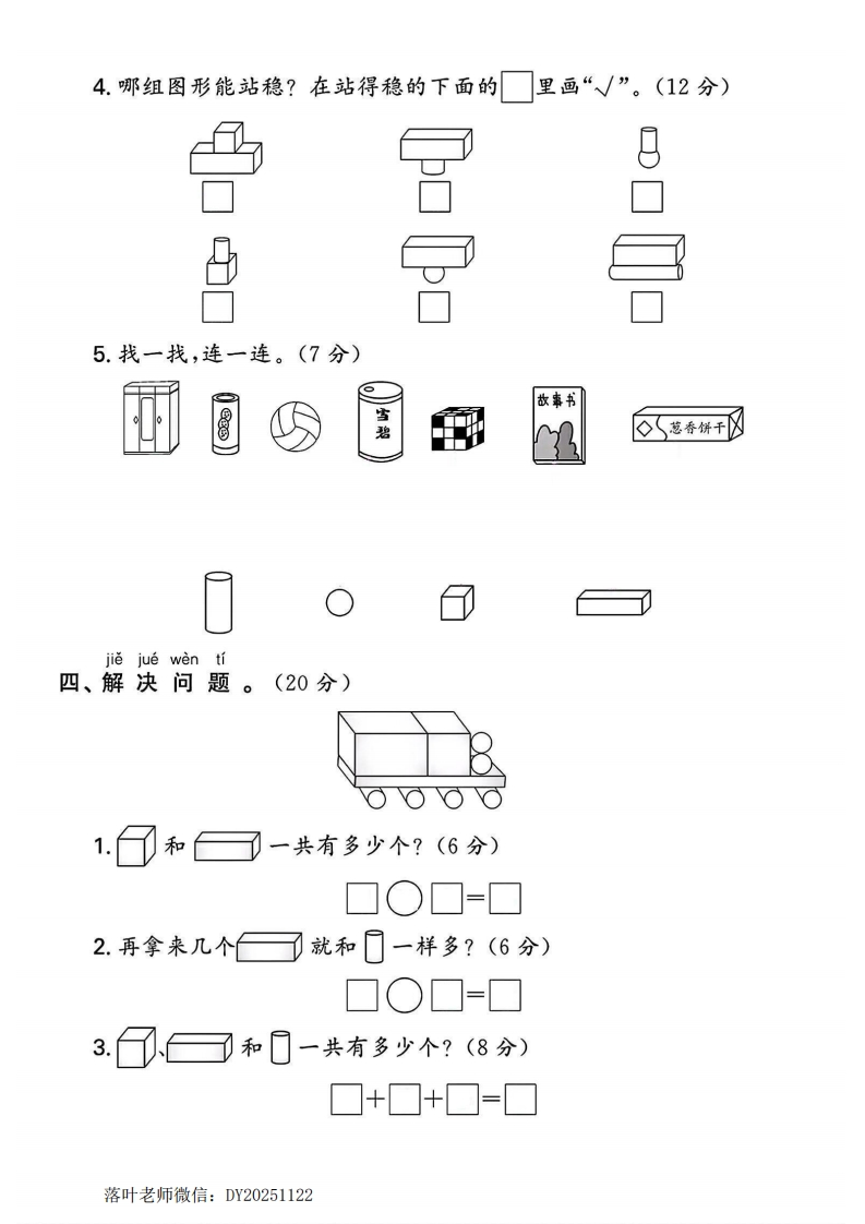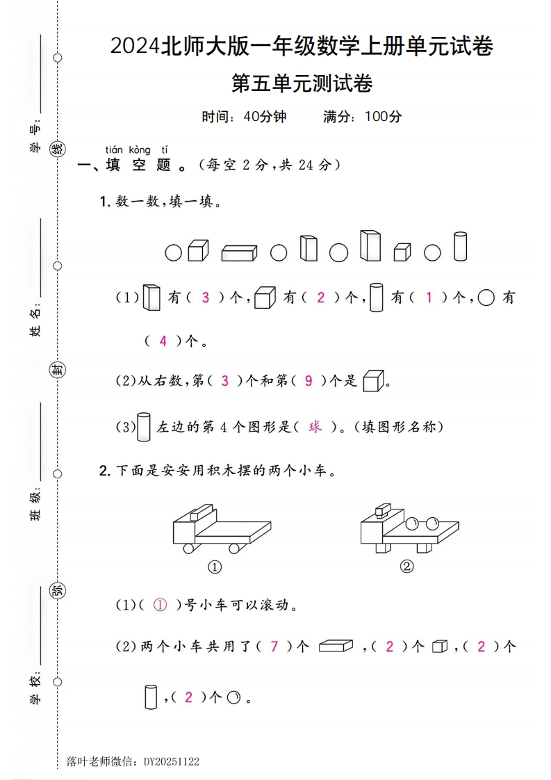 2024北师大版一年级数学上册第五单元测试卷2(小学教育)tangqi88前天发布关注私信3.03MB8页0305 第1页 / 共8页 第2页 / 共8页 第3页 / 共8页 第4页 / 共8页 第5页 / 共8页 试读已结束,还剩3页,您可下载完整版后进行离线阅读 2024北师大版一年级数学上册第五单元测试卷2(小学教育)此内容为付费资源,请付费后查看¥9.9¥19.9VIP会员免费立即购买您当前未登录!建议登陆后购买,可保存购买订单付费资源© 版权声明本站是一个信息分享及获取的平台,不确保部分用户上传资料的来源及知识产权归属,资料由老师投稿,公开渠道整理,网友上传,如果侵犯到您的权益,请联系客服删除THE END试卷资料 文本预览 2024北师大版一年级数学上册单元试卷第五单元测试卷时间:40分钟满分:100分p孙tian kong ti一、填空题。(每空2分,共24分)1.数一数,填一填。o00000o0(1)0有()个,日有()个,0有()个,0有拟)个。(2)从右数,第()个和第()个是(3)左边的第4个图形是()。(填图形名称)2.下面是安安用积木摆的两个小车。杀(1)()号小车可以滚动。(2)两个小车共用了()个子,()个⑦,()个孙0,()个0.落叶老师微信:DY20251122 查看更多 收起部分 喜欢就支持一下吧点赞5 分享QQ空间微博QQ好友海报分享复制链接收藏