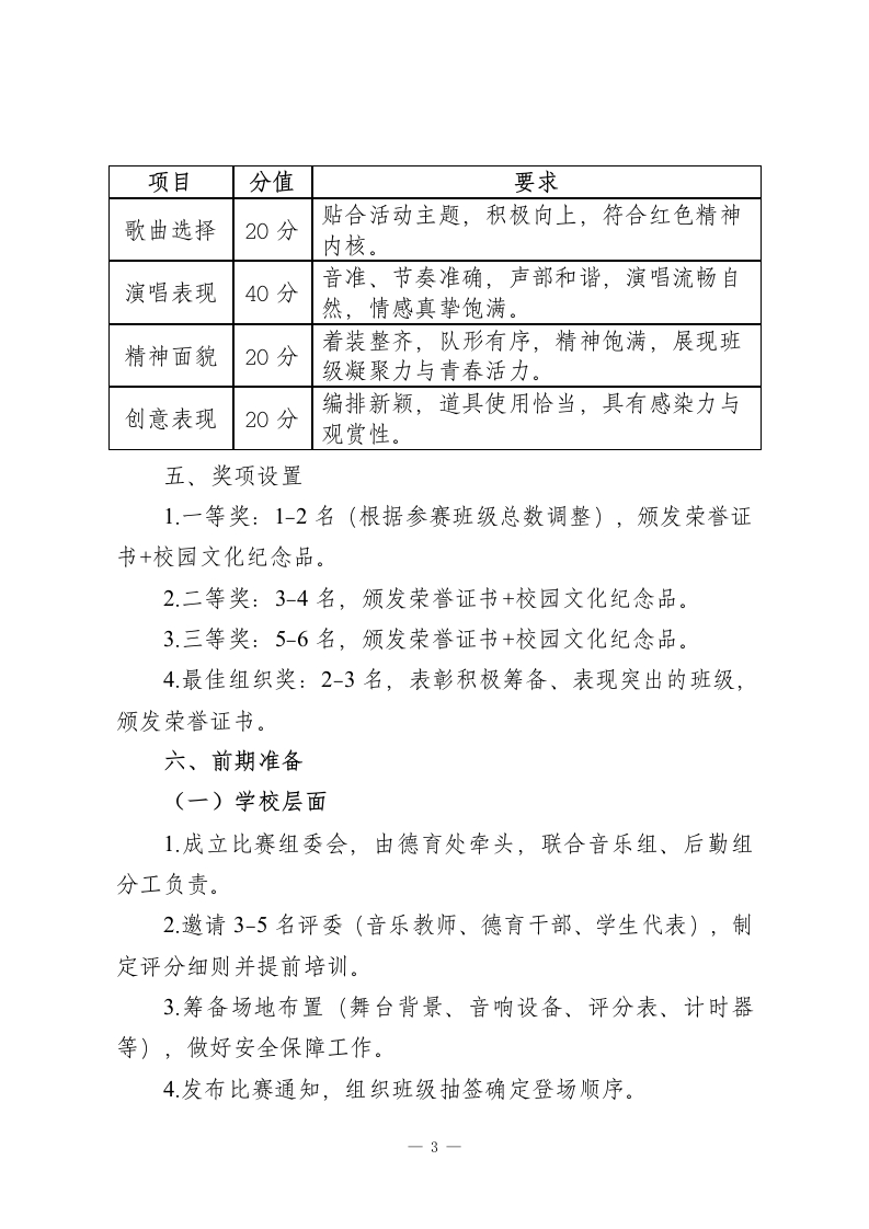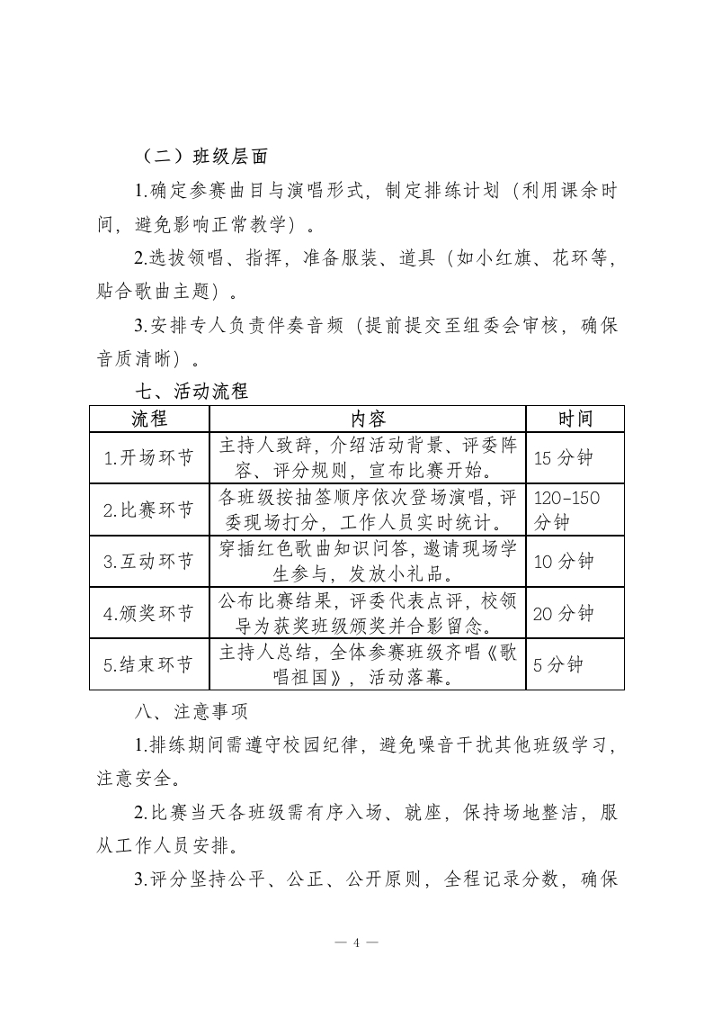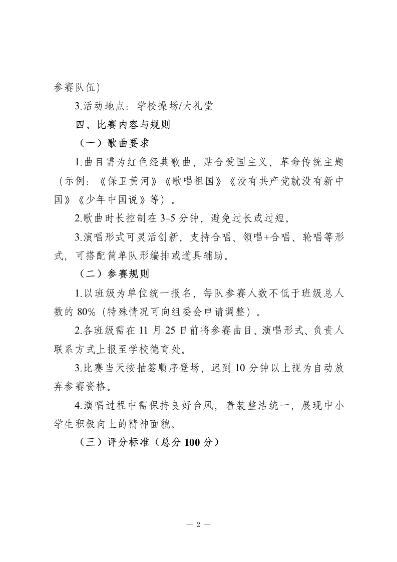 “唱红色赞歌,扬时代新风”2025年中小学“一二·九”红歌比赛活动方案一、活动背景追忆九秩峥嵘岁月,康续百年红色基因。1935年的“一二九”运动中,爱国青年以热血践行初心,用呐喊唤醒民族,其孕育的爱国精神穿越时空、历久弥新。2025年正值“一二九”运动90周年,在多元化文化环境与红色教育深化推进的当下,红歌作为革命历史的鲜活载体,承载着厚重的精神内涵。为引导中小学生传承红色基因,激发爱国热情与集体荣誉感,夯实学校德育与美育根基,特举办本次红歌比赛,让红色精神在歌声中浸润心灵、代代相传。二、活动主题唱红色赞歌,扬时代新风三、活动目的1.传承“一二·九”运动中的爱国主义精神,让学生在红色旋律中铭记历史、缅怀先烈。2.增强班级凝聚力与集体荣誉感,激发学生团队协作意识。3.丰富校园文化生活,引导学生以歌声表达对祖国的热爱与敬意。四、活动基本信息1.活动时间:2025年12月5日(周五)2.活动对象:全体学生(以班级为单位参赛,每班级1支-1