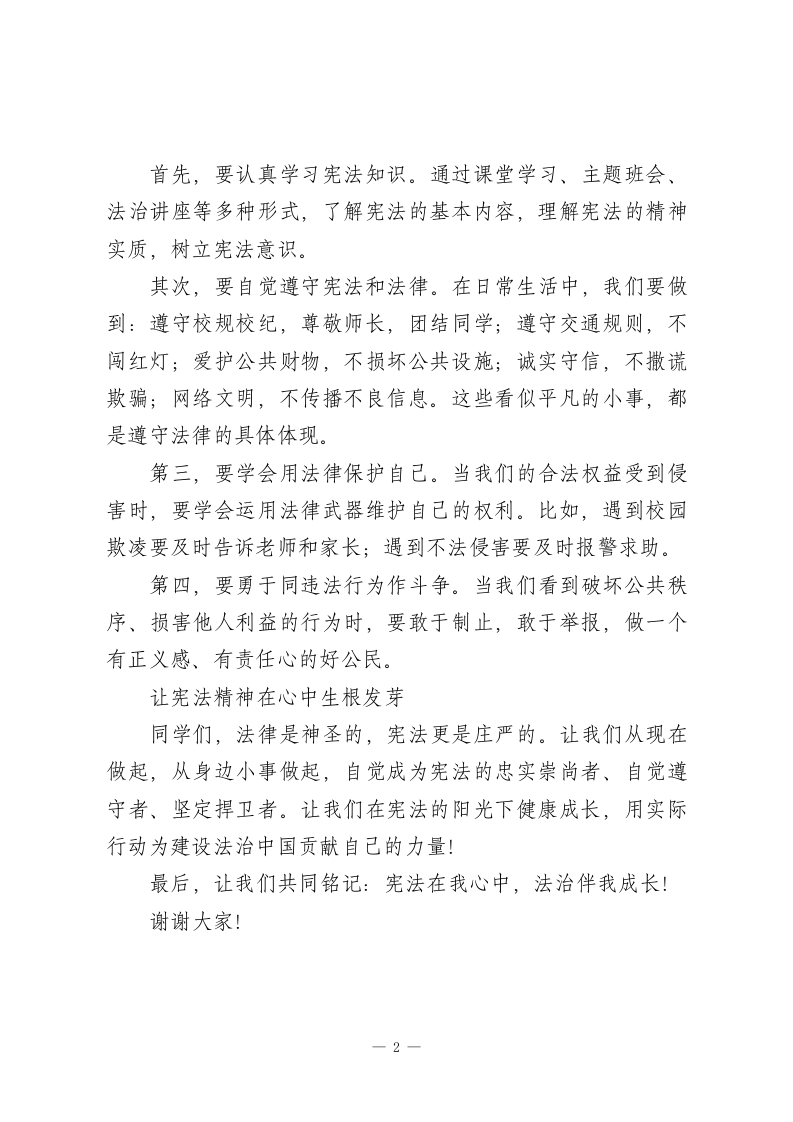 “学习宪法精神,争做守法少年”2025年12月4日国家宪法日学生国旗下讲话稿尊敬的老师们,亲爱的同学们:大家早上好!今天我国旗下讲话的主题是"学习宪法精神,争做守法少年”。2025年12月4日,是我国第12个国家宪法日,也是第8个“宪法宣传周”。同学们,你们知道什么是宪法吗?宪法是国家的根本大法,是治国安邦的总章程,具有最高的法律地位、法律权威、法律效力。它规定了国家的根本制度和根本任务,规定了公民的基本权利和义务,是我们每个公民都必须遵守的行为准则。宪法与我们的生活息息相关也许有同学会想:宪法离我们很遥远。其实不然,宪法就在我们身边,与我们的生活息息相关。从我们呱呱坠地的那一刻起,宪法就开始保护我们一一我们享有生命权、健康权;当我们背起书包走进校园,宪法赋予我们受教育的权利;当我们长大成人,宪法保障我们的劳动权、选举权和被选举权;当我们年老时,宪法规定我们享有获得物质帮助的权利…可以说,宪法伴随我们一生,保护我们一生。学习宪法,从我做起作为新时代的青少年,我们应该如何学习宪法、遵守宪法呢?一1