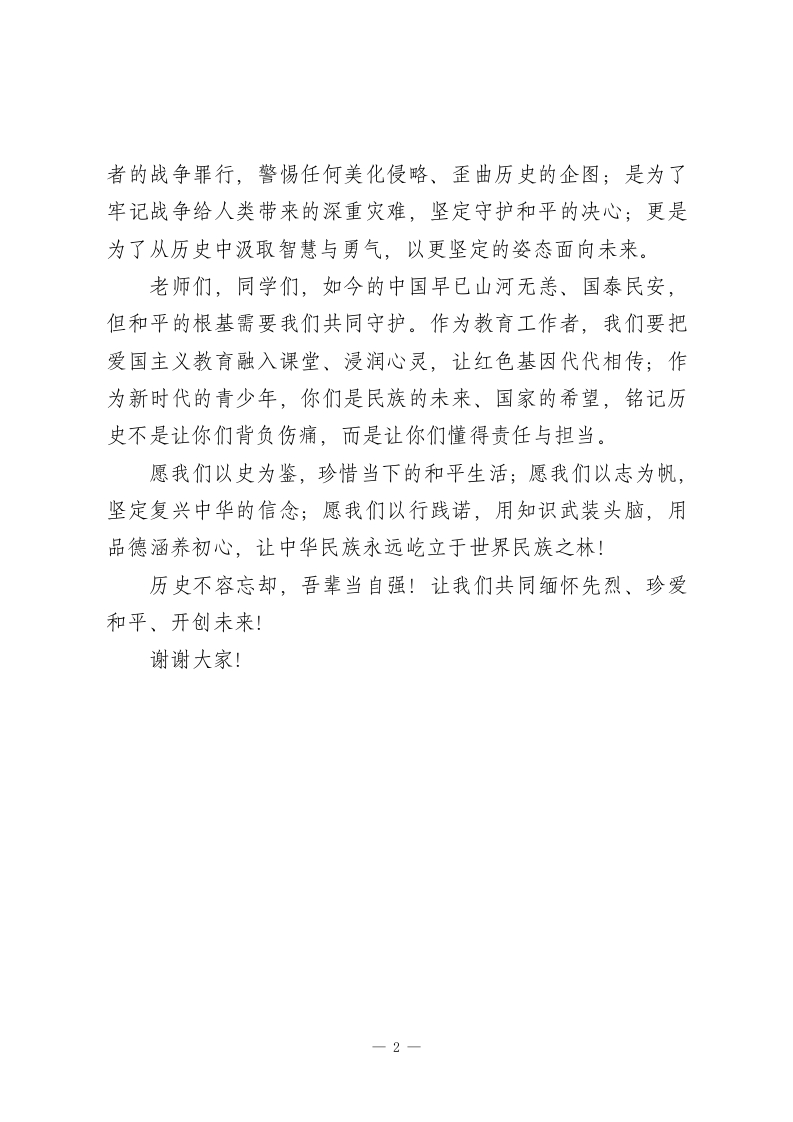 12.13国家公祭日国旗下校长讲话:历史不容忘却,吾辈当自强敬爱的老师们,亲爱的同学们:大家好!今天,我们站在庄严的五星红旗下,目光所及是飘扬的国旗,心中回响的是历史的警钟一1937年12月13日,那个寒冬彻骨的日子,侵华日军的铁蹄踏破南京城防,一场持续六周的人间惨剧就此上演。30万手无寸铁的同胞,在侵略者的屠刀下惨遭杀戮,老人、妇女、孩童无一幸免,昔日繁华的金陵古城沦为人间炼狱。这不是冰冷的数字,而是一个个鲜活的生命;这不是遥远的传说,而是中华民族永远的伤痛。这段屈辱的历史,是刻在民族骨血里的国耻,是我们永远无法磨灭的记忆。“历史是不能忘却的”,“忘记历史意味着背叛”。我们铭记这段黑暗岁月,不是为了延续仇恨,而是为了缅怀逝者、警示当下;我们回望这段苦难历程,不是为了沉溺悲痛,而是为了汲取力量、守护和平。我们不能忘记侵略者灭绝人性的暴行,不能忘记30万同胞的鲜血与呐喊,更不能忘记中华民族在绝境中不屈的抗争一一那些挺身而出的仁人志士,那些坚守阵地的普通民众,他们用生命诠释了民族的气节与担当。今天,我们重温历史,是为了沉痛悼念南京大屠杀死难者,以及所有在日本侵华战争中惨遭杀戮的同胞;是为了揭露侵略1