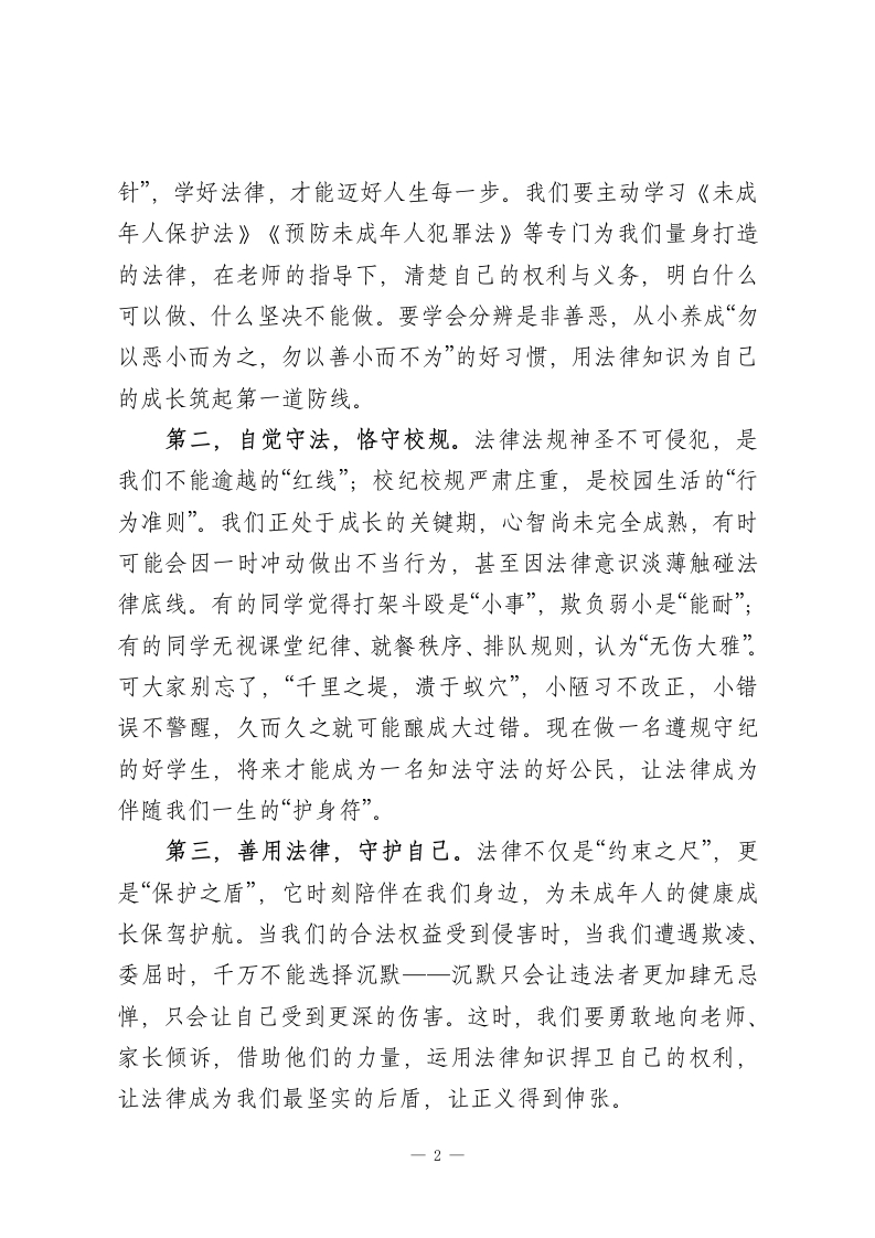 12月4日是法制宣传日,校长在国旗下讲话:守法规、正言行,与法同行尊敬的老师们,亲爱的同学们:大家好!今天,我们站在国旗下,共同迎来一个意义特殊的日子一12月4日国家宪法日暨法制宣传日。今天我演讲的题目是《守法规、正言行,与法同行》。古人云:“没有规矩,不成方圆。”这里的“规矩”,放到当下社会,便是守护我们生活有序、保障我们权益不受侵害的法律。我国是法治国家,“国有国法,家有家规”,法律如同空气与阳光,渗透在我们学习、生活的每一个角落,规范着每一个人的行为。无论是校园里的课间嬉戏,还是社会中的日常交往,法律都在默默守护着公平正义。任何触犯法律的行为,都将受到相应的追究与制裁。法律是明辨是非的“火眼金睛”,让我们看清善恶边界;纪律是指引成长的“灯塔”,时刻规范着我们的思想与言行,助力我们行稳致远。作为新时代的少先队员,作为社会的小公民,学法、懂法、知法、守法是我们的必修课,学会用法律武器保护自己,更是我们成长路上的重要本领。而作为在校学生,铭记校纪校规,用规则约束校园行为,便是我们践行法治精神的第一步。在此,我向全体少先队员发出三点倡议:第一,主动学法,明辨事理。法律知识是人生路上的“指南1