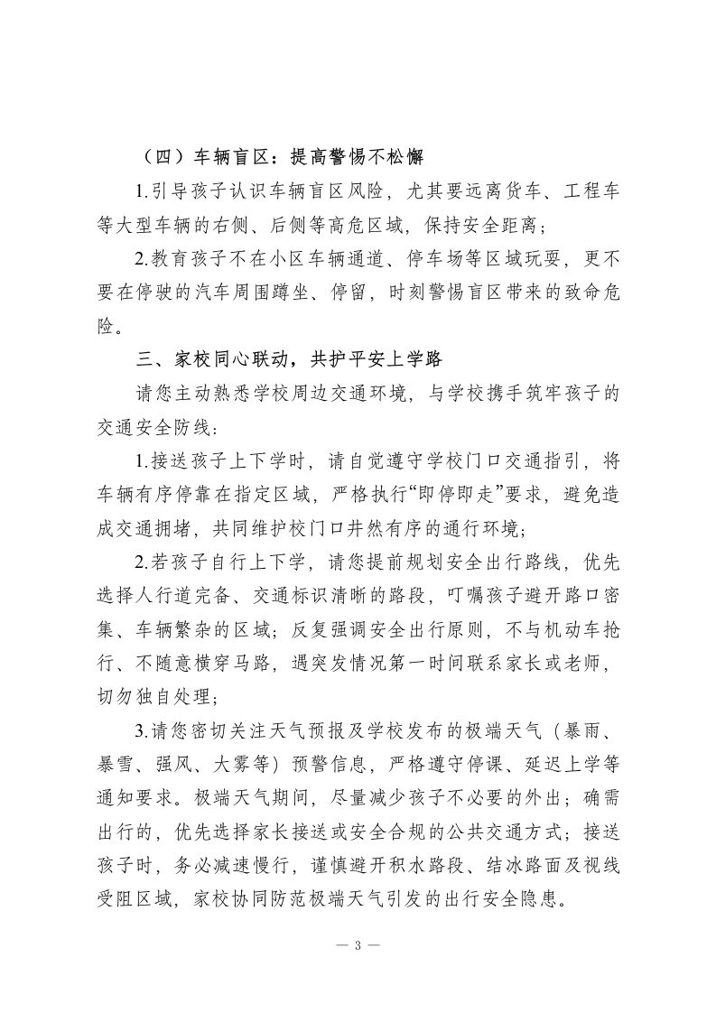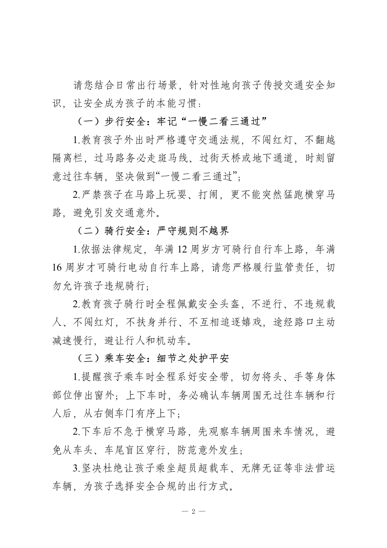 2025.12.2全国交通安全日致学生家长的一封信尊敬的家长朋友:您好!每年12月2日是“全国交通安全日”,今年我们迎来第十四个纪念日,主题为“文明交通,礼行天下”。孩子是家庭的掌心珍宝,更是祖国的明日栋梁,他们的出行安全,始终是学校与您心中最牵挂的牵挂。值此特殊节点,我们特致信与您,愿家校携手并肩,共筑交通安全“安全网”,用责任与守护,护航孩子们健康快乐成长!为切实保障学生上下学及日常出行安全,现向您发出如下倡议,期待您的全力配合:一、争当安全表率,做好孩子第一任老师家长的言行是孩子最好的教科书,您的每一次规范出行,都在无形中为孩子树立标杆。请您时刻规范自身交通行为,做好安全示范:1.驾车出行时,务必全程系好安全带,坚决杜绝超速、酒驾、疲劳驾驶等危险行为;行驶中不接打手持电话,不随意变道、加塞,以文明驾驶守护出行平安;2骑行电动自行车、摩托车时,务必规范佩戴安全头盔,严格遵守交通信号灯指示,不逆行、不违规载人载物,用实际行动为孩子传递“安全出行”的理念。二、强化安全引导,让安全意识深植童心-1
