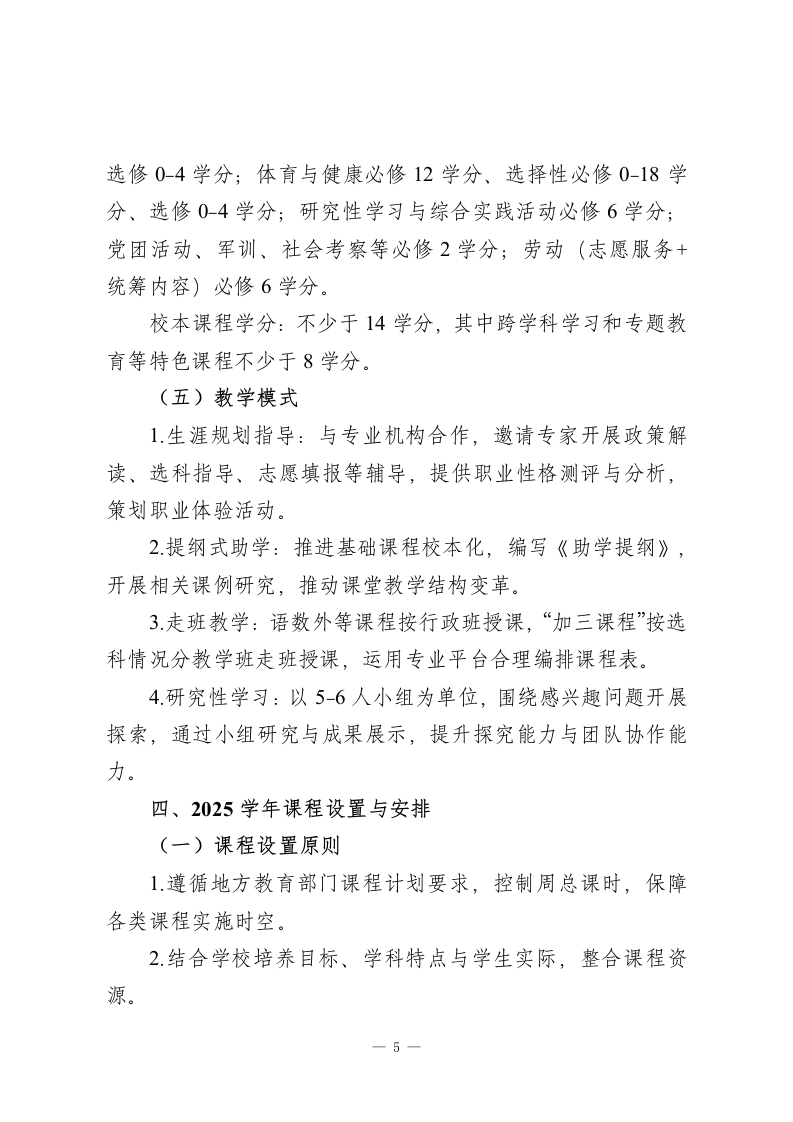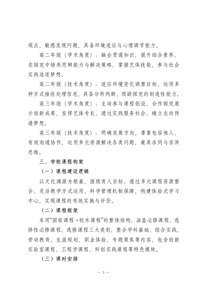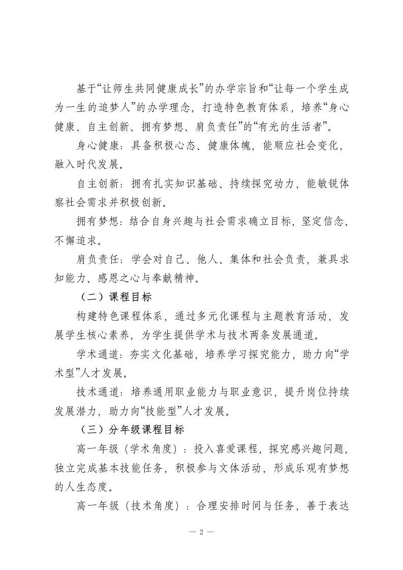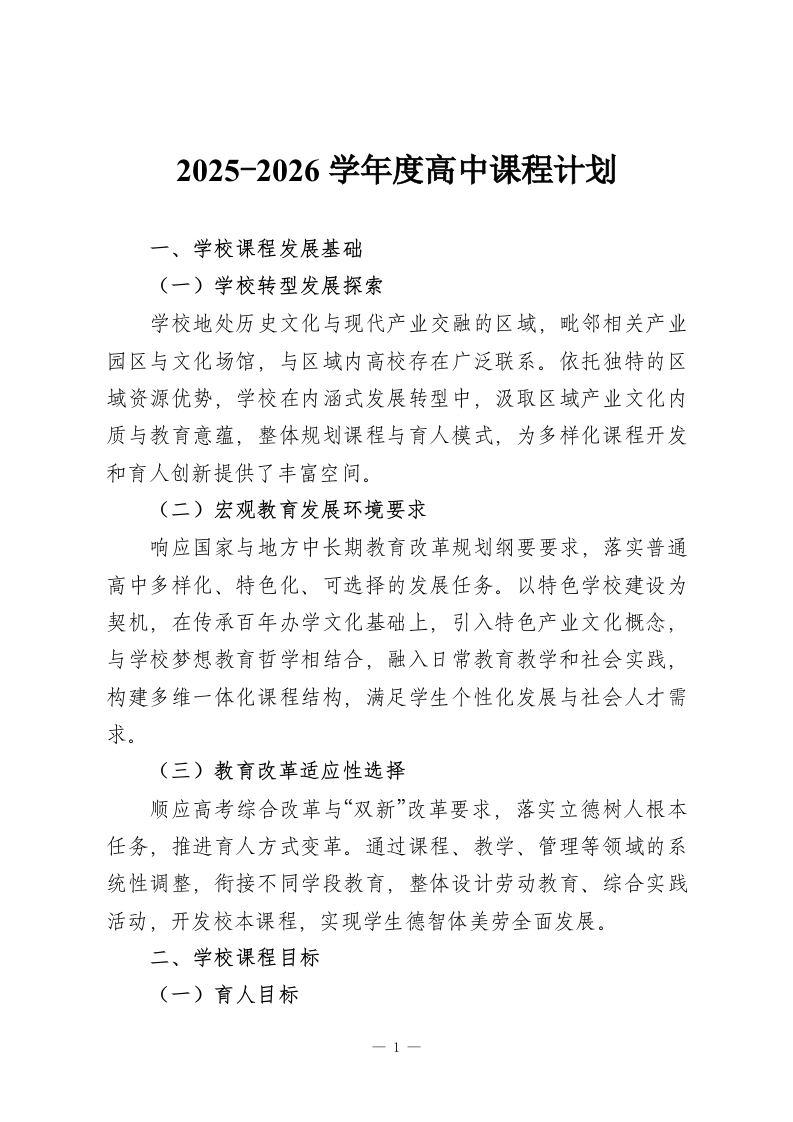 2025-2026学年度高中课程计划一、学校课程发展基础(一)学校转型发展探索学校地处历史文化与现代产业交融的区域,毗邻相关产业园区与文化场馆,与区域内高校存在广泛联系。依托独特的区域资源优势,学校在内涵式发展转型中,汲取区域产业文化内质与教育意蕴,整体规课程与育人模式,为多样化课程开发和育人创新提供了丰富空间。(二)宏观教育发展环境要求响应国家与地方中长期教育改革规划纲要要求,落实普通高中多样化、特色化、可选择的发展任务。以特色学校建设为契机,在传承百年办学文化基础上,引入特色产业文化概念,与学校梦想教育哲学相结合,融入日常教育教学和社会实践,构建多维一体化课程结构,满足学生个性化发展与社会人才需求。(三)教育改革适应性选择顺应高考综合改革与“双新”改革要求,落实立德树人根本任务,推进育人方式变革。通过课程、教学、管理等领域的系统性调整,衔接不同学段教育,整体设计劳动教育、综合实践活动,开发校本课程,实现学生德智体美劳全面发展。二、学校课程目标(一)育人目标-1-