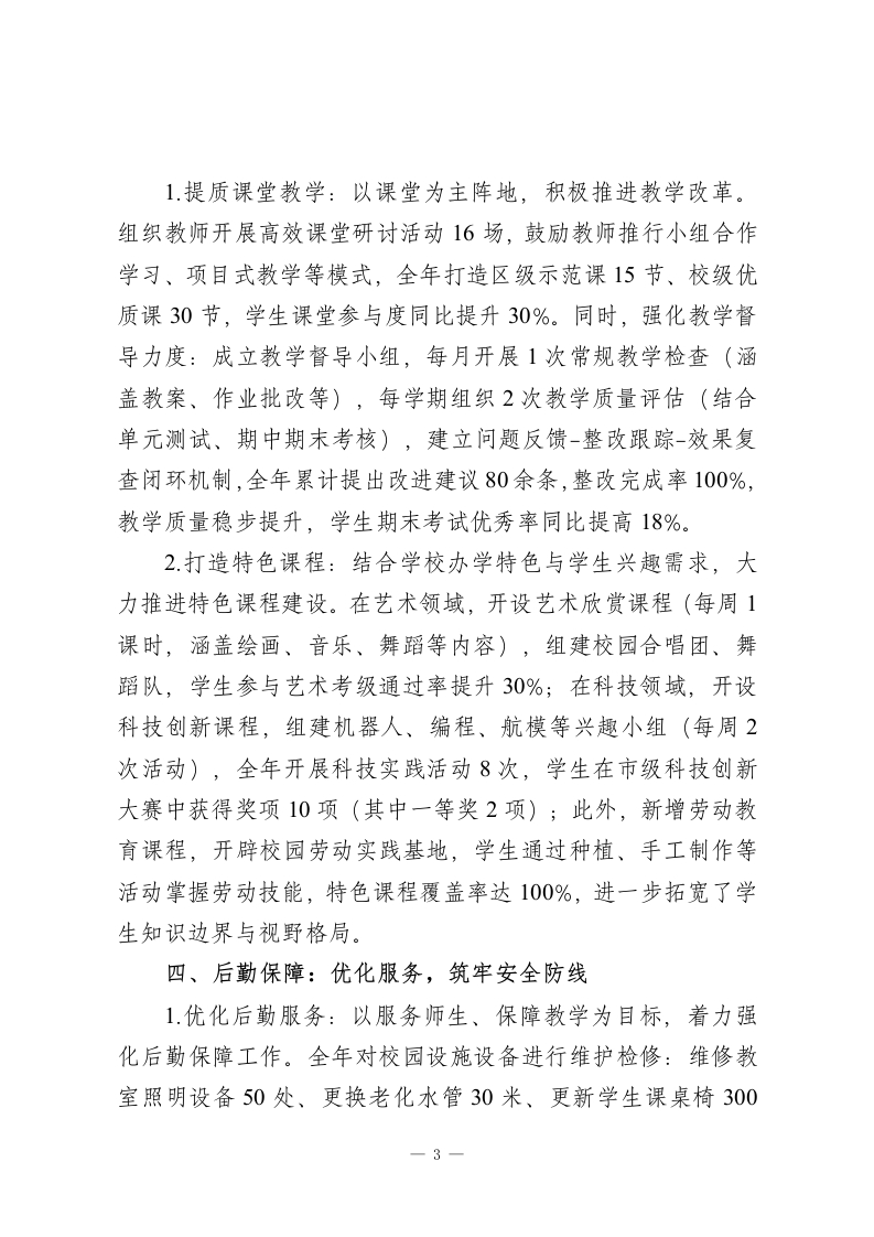 2025年度校长履职工作总结:以生为本谋发展,管理、德育、后勤多维度交出“满意卷”在过去一年,我以校长之职全面统筹学校行政管理与教育教学工作,始终秉持以生为本、以师为基的办学理念,在上级教育部门的悉心指导下,联合全体师生员工凝心聚力、真抓实干,推动学校在管理、德育、教学、后勤等多领域实现稳步发展,各项工作取得显著成效。现将2025年度个人履职情况详细总结如下:一、学校管理:夯实基础,凝聚发展合力1.健全管理体系:结合学校办学规模扩大、师资结构调整的实际情况,牵头梳理并修订《学校行政管理细则》《教师绩效考核办法》等12项制度,进一步明确各部门职责边界与工作流程,确保教学管理、行政服务等各项工作规范有序推进。同时,聚焦教师队伍建设,构建校本培训+外出研学+名师引领三维成长体系,全年组织校本培训12场(涵盖教学设计、信息技术应用等主题)、外出研学8次(赴省内优质学校交流学习),覆盖全体120名教师,教师参与区级以上教学竞赛获奖人数同比提升25%,有效提升了教师的业务素养与教育教学能力。2.丰富校园文化:以打造有温度的校园文化为目标,统筹推进校园文化建设。全年策划并开展多元化活动:春季秋季举办运动会(设置田径、球类等15个项目,师生参与率达98%),1