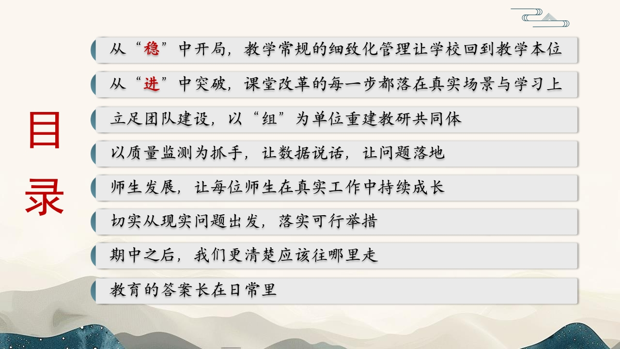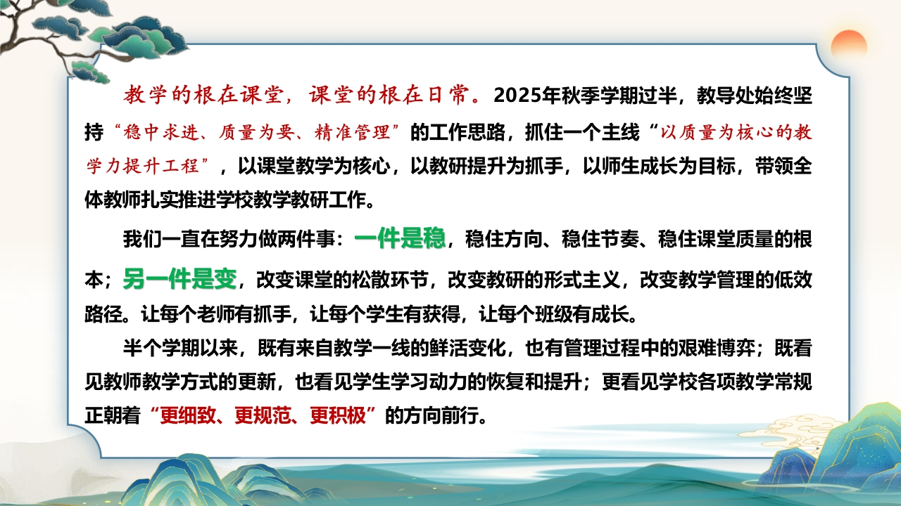2025年秋季学期教导处期中工作汇报暨经验分享:向质效要答案,在日常里见教育tangqi883天前发布关注私信6.04MB27页0415 第1页 / 共27页 第2页 / 共27页 第3页 / 共27页 第4页 / 共27页 第5页 / 共27页 试读已结束,还剩22页,您可下载完整版后进行离线阅读 2025年秋季学期教导处期中工作汇报暨经验分享:向质效要答案,在日常里见教育此内容为付费资源,请付费后查看¥9.9¥19.9VIP会员免费立即购买您当前未登录!建议登陆后购买,可保存购买订单付费资源© 版权声明本站是一个信息分享及获取的平台,不确保部分用户上传资料的来源及知识产权归属,资料由老师投稿,公开渠道整理,网友上传,如果侵犯到您的权益,请联系客服删除THE END学校教务德育资料教研资料校长资料 文本预览 向质效要答案在日常里见教育2025年秋季期中教导处工作汇报暨经验分享汇报:XXX老师时间:2025年12月 查看更多 收起部分 喜欢就支持一下吧点赞5 分享QQ空间微博QQ好友海报分享复制链接收藏