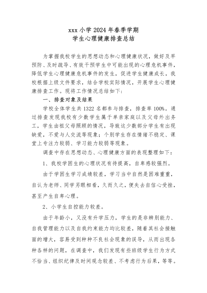 xxx小学2024年春季学期学生心理健康排查总结为掌握我校学生的思想动态和心理健康状况,做好及早预防、及时疏导、有效干预学生中可能出现的心理危机事件,降低学生心理健康危机事件的发生,促进学生健康成长,我校根据上级文件要求,结合学校实际情况,开展学生心理健康排查工作。现将工作情况总结如下:一、排查对象及结果学校全体学生共1322名都参与排查,排查率100%。通过排查发现我校有少数学生属于单亲家庭以及父母外出务工,学生由祖父母照顾的情况,导致这少数部分学生有出现缺爱,不爱与人交流等现象;个别学生存在情绪不稳定、课堂上专注力较弱、学习能力较弱等现象。调查中存在思想动态、心理健康方面的表现整理如下:1、我校学困生的心理状况有待提高,自卑感较强烈。由于学困生学习成绩较差,学习当中自然是困难重重,自认为老师、同学另眼相看,久而久之,便失去自信心受挫,甚至产生自卑心理。2、小学生自控能力较差。由于年龄小,又没有升学压力,学生的是非辨别能力、自我管理能力以及自我约束能力均比较差,随着其社会接触面的增大,容易受到种种不良社会现象的误导,从而出现各种各样的问题,在调查中,我们发现有些班级学生行为方式不恰当、组织纪律及时间观念较差、不考虑行为后果,等等。