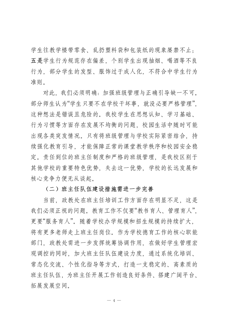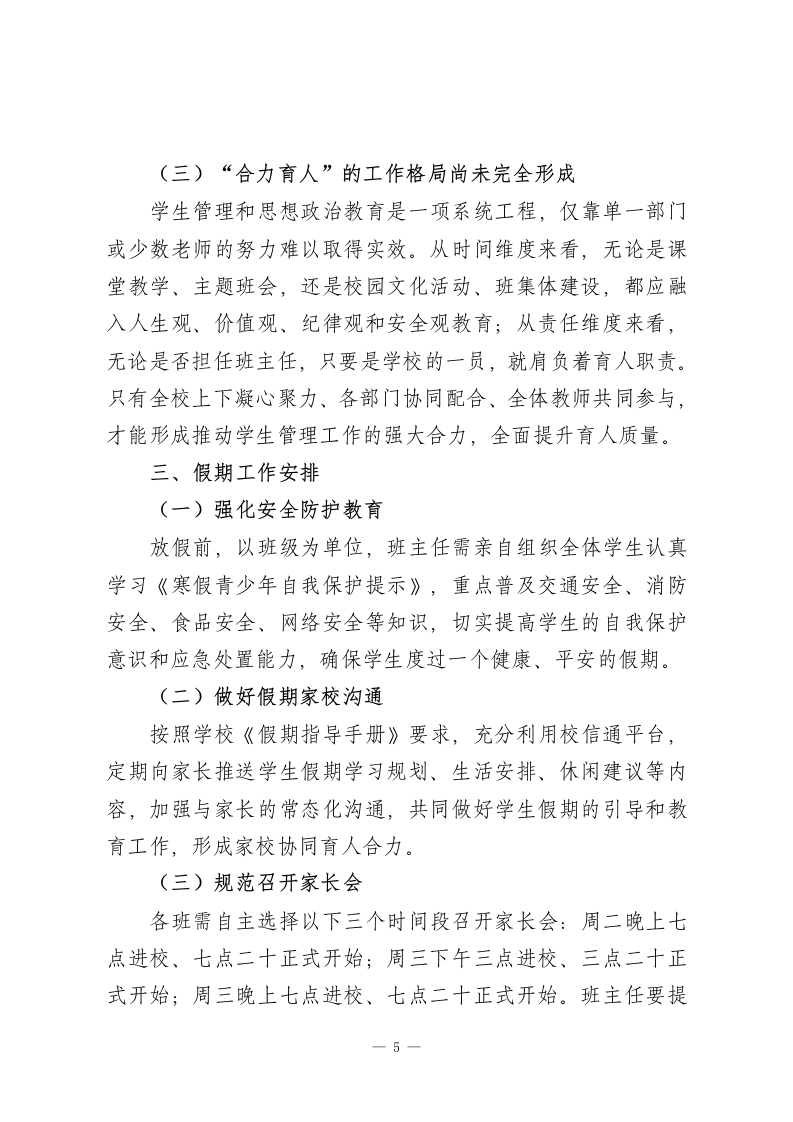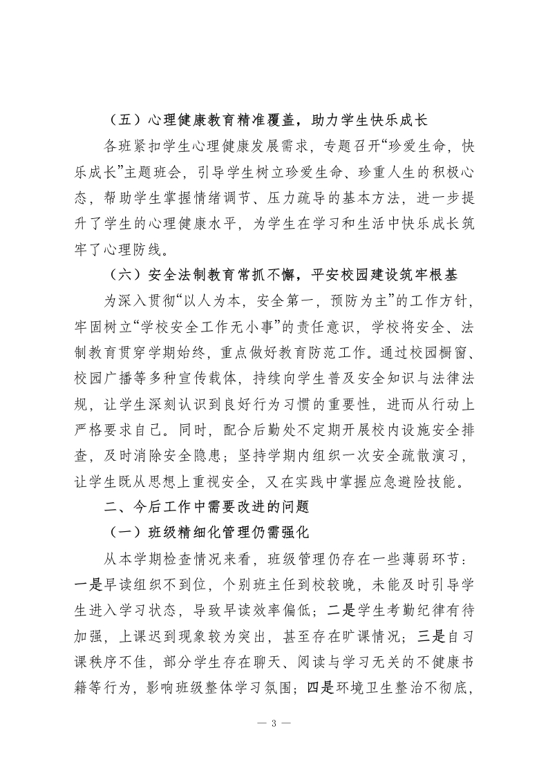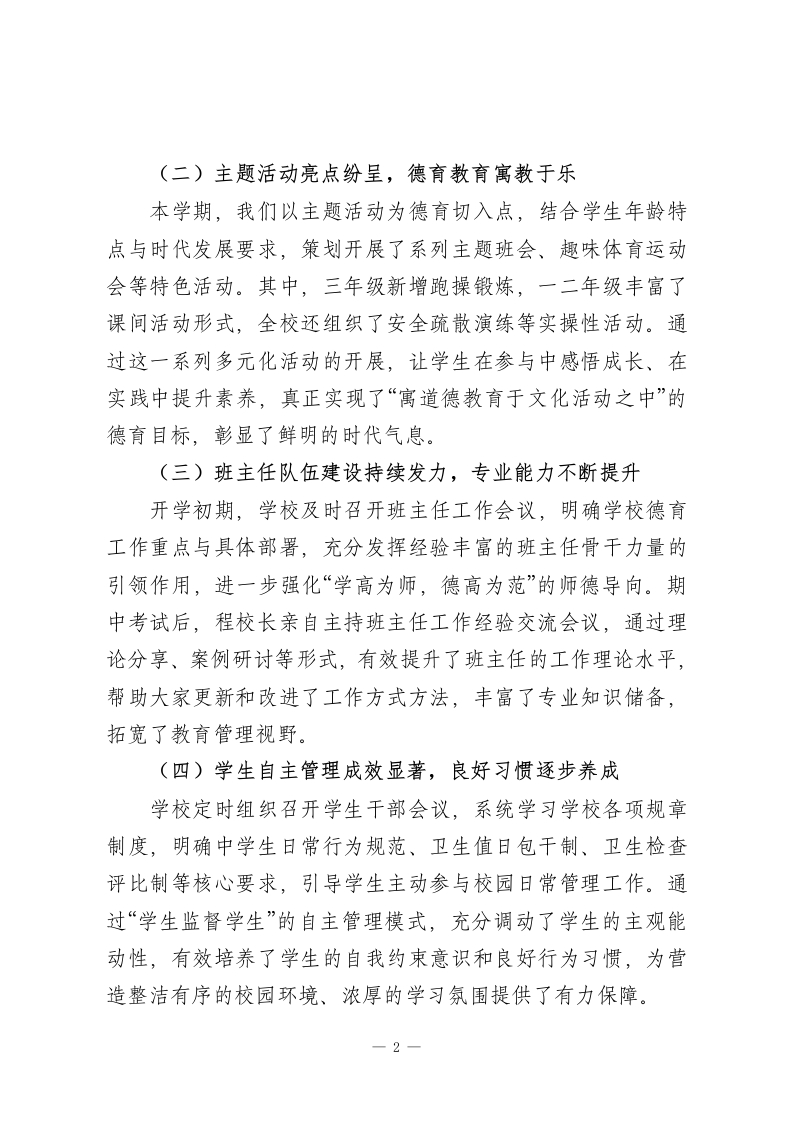 2025秋季学期班主任工作总结暨后续工作部署会校长讲话尊敬的各位老师:大家下午好!2025秋季学期,政教处在学校统一安排部署下,紧紧围绕学校中心工作,以创建平安校园为动力,以提高学生文明素质为重点,以科学发展观为指导,坚持以德治校,注重养成教育,以“先让学生学会做人”为落脚点,把学生素质的可持续发展作为德育核心追求,精心组织开展了一系列丰富多彩的德育活动,全面提升了学校德育工作水平和学生思想道德素质。下面,我对本学期班主任工作进行总结,并明确后续工作方向与假期安排。一、2025秋季学期班主任工作简要回顾(一)常规管理扎实落地,班级建设稳步推进各班严格对照学生管理考评细则,将行为规范教育贯穿日常教学全过程。各位班主任始终坚守岗位,早来晚归,主动深入学生群体,加强与学生的沟通交流,全面了解学生的学习状态与生活需求。在完成备课、上课、批改作业、课后辅导等教学核心任务的同时,大家毫无怨言地投入大量精力到班级管理中,为学校德育工作的有序开展筑牢了基础。在此,我代表学校向各位班主任致以诚挚的感谢,感谢大家一学期来对政教处工作的全力支持与辛勤付出!1