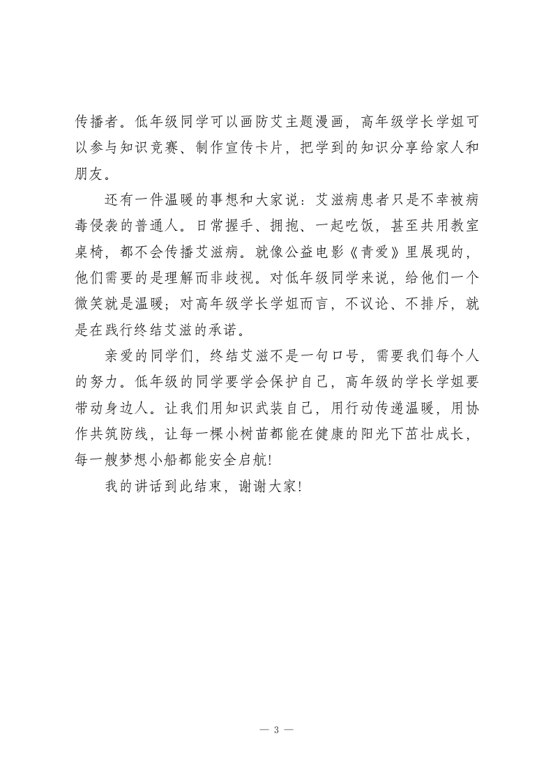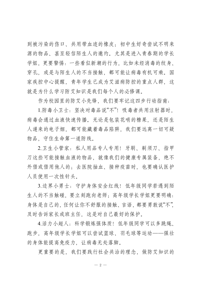 2025世界艾滋病日,校长在国旗下讲话:珍爱生命,守护健康一一共筑无艾校园尊敬的各位老师,亲爱的同学们:大家上午好!今天是2025年12月1日,我们将共同迎来第38个世界艾滋病日。今年我国的宣传主题是“社会共治,守正创新,终结艾滋”一无论是刚戴上红领巾的小队员,还是即将迈入青春期的学长学姐,我们都是防艾行动中不可或缺的一份子。今天,就让我们一起走进防艾课堂,主题是《珍爱生命,守护健康一一共筑无艾校园》。生命是什么?对低年级的同学来说,是春日里冒芽的小树苗,努力伸展枝丫;对高年级的学长学姐而言,是即将启航的小船,带着梦想驶向远方。可在生命的旅程中,藏着一种隐形的健康威胁一艾滋病病毒(HV),它像不散的乌云,会悄悄削弱我们身体的防御部队一免疫系统。艾滋病由HV病毒引起,这种病毒最狡猾的地方,在于它专门破坏免疫系统,就像毁掉城堡的卫兵,让感冒、肺炎等疾病轻易入侵。自1981年首次被发现以来,全球已有数千万人因艾滋病失去生命。但大家不用恐慌:它的传播途径很明确,主要通过血液、母婴和不当性接触三种方式,就像路边需要警惕的区域,只要我们知道如何避开,就能安全通行。对我们来说,危险可能藏在这些地方:小学生不小心接触1