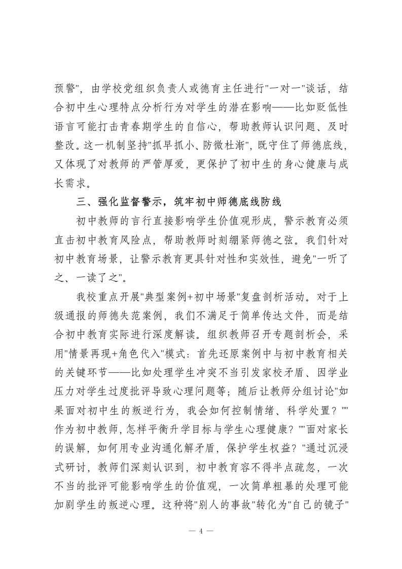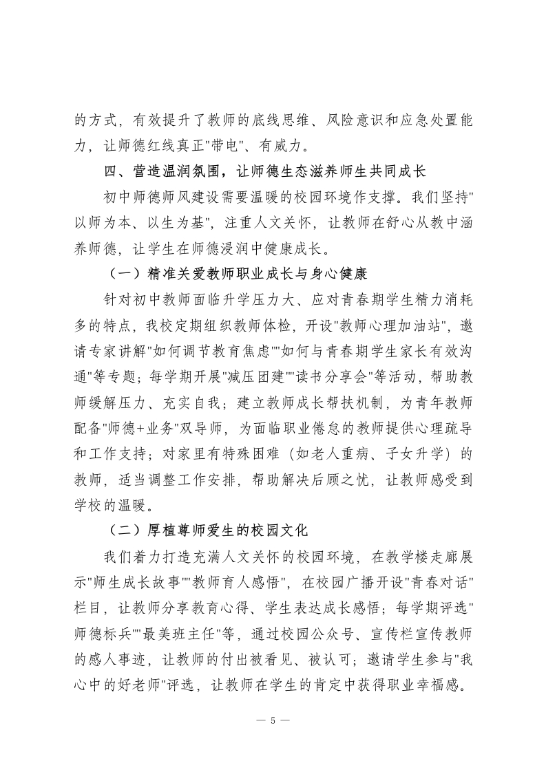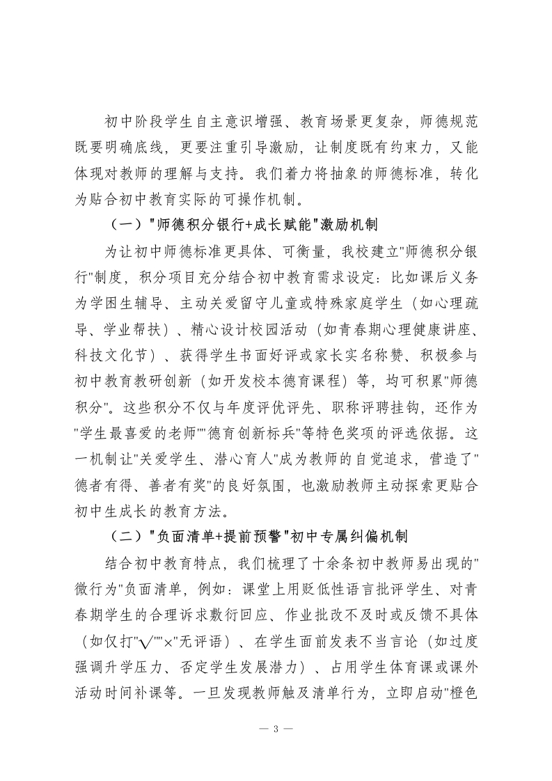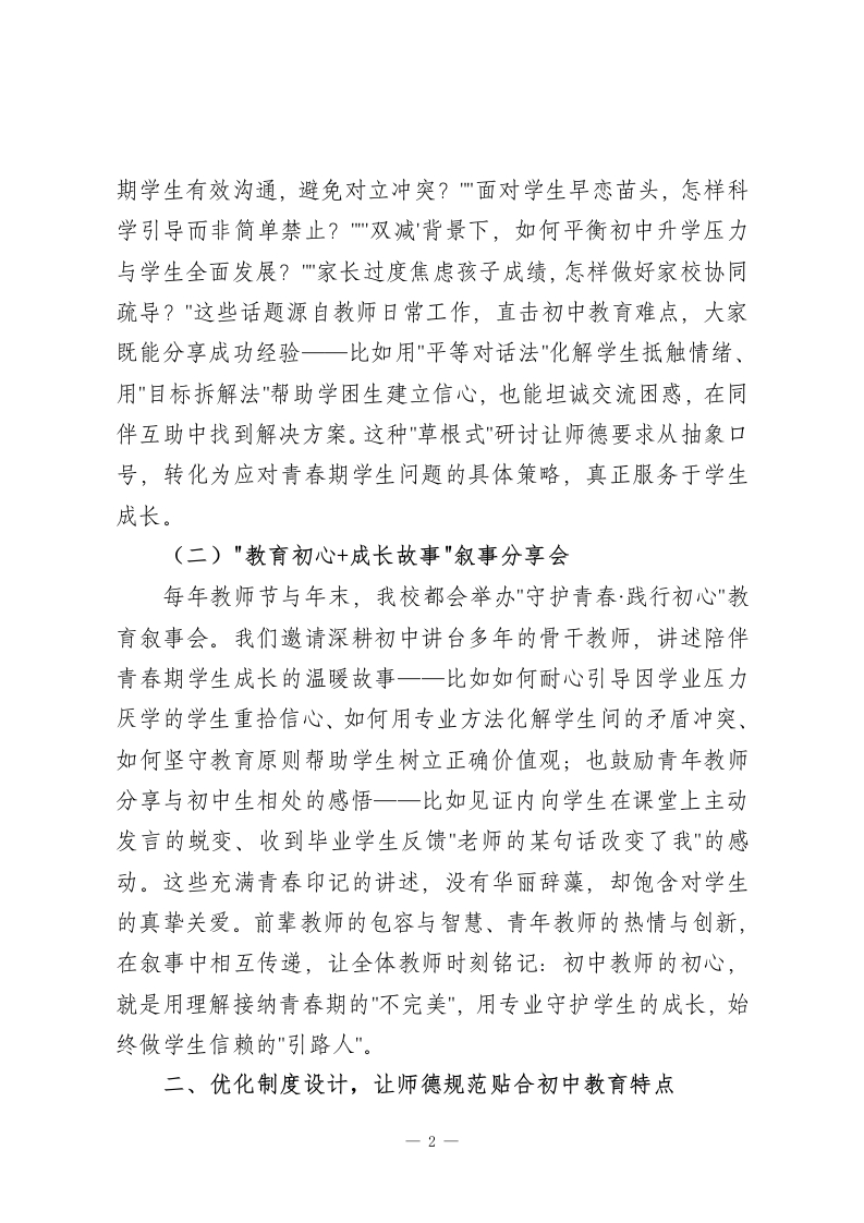 XX初中2025年师德师风建设工作总结汇报尊敬的各位领导、各位同仁:大家好!非常荣幸能在此次全区师德师风建设培训大会上,与各位交流XX初中在师德师风建设中的实践探索与思考。初中阶段是学生价值观形成、身心快速成长的"拔节孕穗期",教师不仅是知识的传授者,更是学生品格塑造的引路人、成长困惑的倾听者。基于这一认知,我校始终坚持"立足初中学情、聚焦成长需求、追求温润实效"的师德建设理念,着力破解"形式化、空泛化"难题,让师德师风建设真正融入教育教学日常、触及教师心灵深处。现将我校2025年师德师风建设工作具体做法汇报如下,恳请各位批评指正。一、创新学习载体,让师德理念扎根初中教育实践初中教师面临的是青春期学生的特殊需求,传统"读文件、学理论"的师德学习模式难以引发共鸣。我们坚持“从学情出发、从问题入手”,让师德学习与初中教育场景深度绑定,让教师在解决实际困惑中深化认知、提升素养。(一)"微论坛+青春期教育"嵌入式教研我们打破集中学习的传统模式,将师德教育拆解为"小切口、实问题",在每周学科教研组活动中开辟15分钟“师德微论坛”,主题紧密围绕初中教育高频痛点设计。例如:"如何与叛逆—1