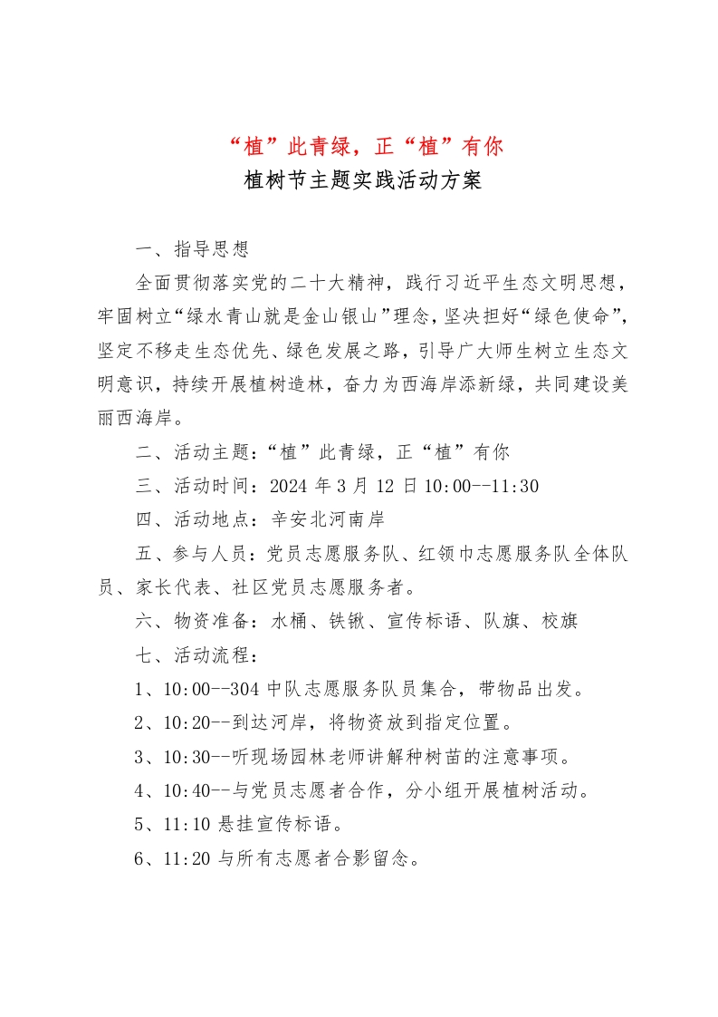 “植”此青绿,正“植”有你植树节主题实践活动方案一、指导思想全面贯彻落实党的二十大精神,践行习近平生态文明思想,牢固树立“绿水青山就是金山银山”理念,坚决担好“绿色使命”,坚定不移走生态优先、绿色发展之路,引导广大师生树立生态文明意识,持续开展植树造林,奋力为西海岸添新绿,共同建设美丽西海岸。二、活动主题:“植”此青绿,正“植”有你三、活动时间:2024年3月12日10:00--11:30四、活动地点:辛安北河南岸五、参与人员:党员志愿服务队、红领巾志愿服务队全体队员、家长代表、社区党员志愿服务者。六、物资准备:水桶、铁锹、宣传标语、队旗、校旗七、活动流程:1、10:00--304中队志愿服务队员集合,带物品出发。2、10:20--到达河岸,将物资放到指定位置。3、10:30--听现场园林老师讲解种树苗的注意事项。4、10:40--与党员志愿者合作,分小组开展植树活动。5、11:10悬挂宣传标语。6、11:20与所有志愿者合影留念。