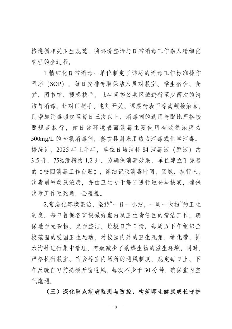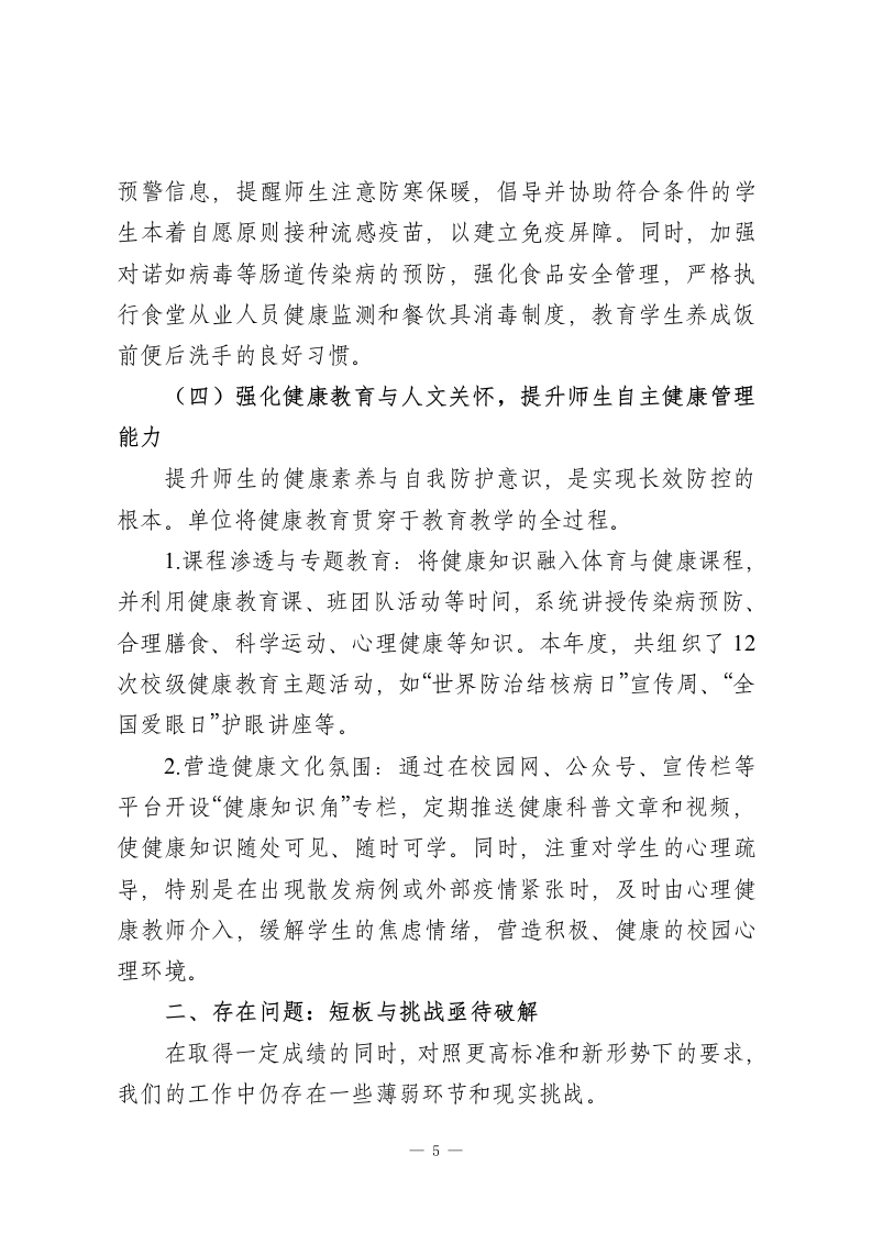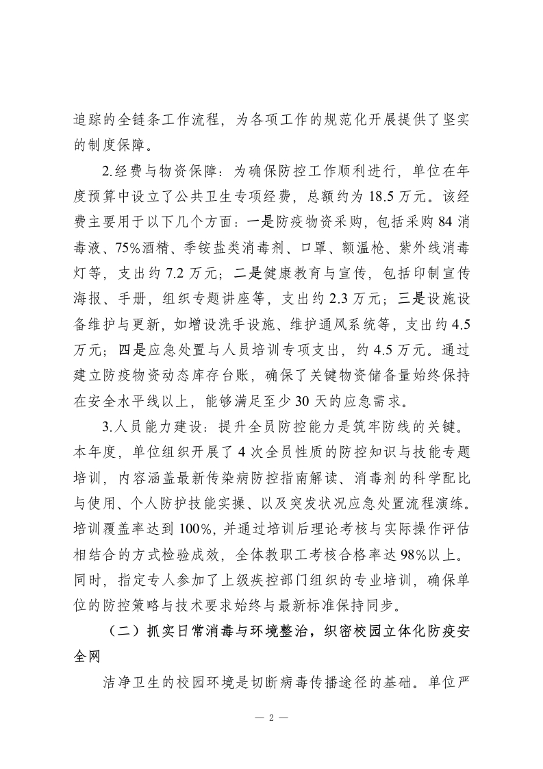 XX单位2025年度校园健康与疾病防控工作情况报告为系统总结本年度校园健康与疾病防控工作成效,审视存在问题,明确未来方向,以期持续巩固校园公共卫生安全防线,保障全体师生身心健康。一、基本情况:多措并举,筑牢校园健康安全屏障2025年以来,我单位始终将师生生命安全和身体健康置于首位,秉持“预防为主、防治结合”的原则,建立并完善了一套系统化、常态化的校园健康与疾病防控工作体系。通过深化组织领导、细化日常管理、强化健康教育、优化环境保障,有效应对了季节性流感、肺结核等重点传染病的潜在威胁,校园整体保持了安全、稳定、有序的良好态势。(一)强化顶层设计与组织领导,构建高效协同的防控工作网络健全的组织领导是高效落实防控工作的前提。年初,单位成立了由主要领导担任组长的校园公共卫生安全工作领导小组,下设办公室,明确了各部门、各年级在防控工作中的具体职责,形成了“统一领导、分工负责、协同联动”的工作格局。1.制度体系建设:本年度,单位修订并完善了《XX单位突发公共卫生事件应急预案》《XX单位传染病晨午检及因病缺動追踪登记制度》《XX单位校园环境卫生与消毒管理规定》等一系列制度文件。这些制度明确了从信息上报、应急处置到后期-1