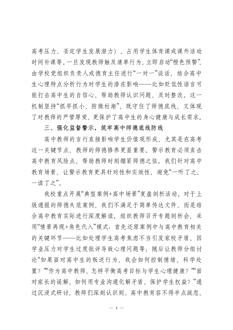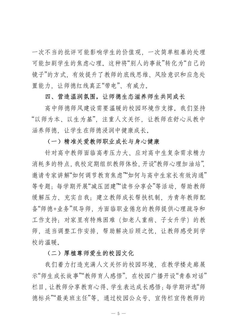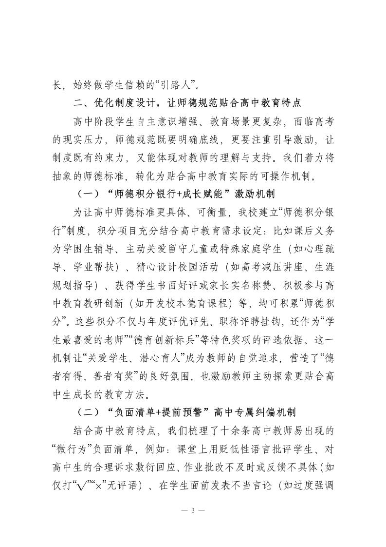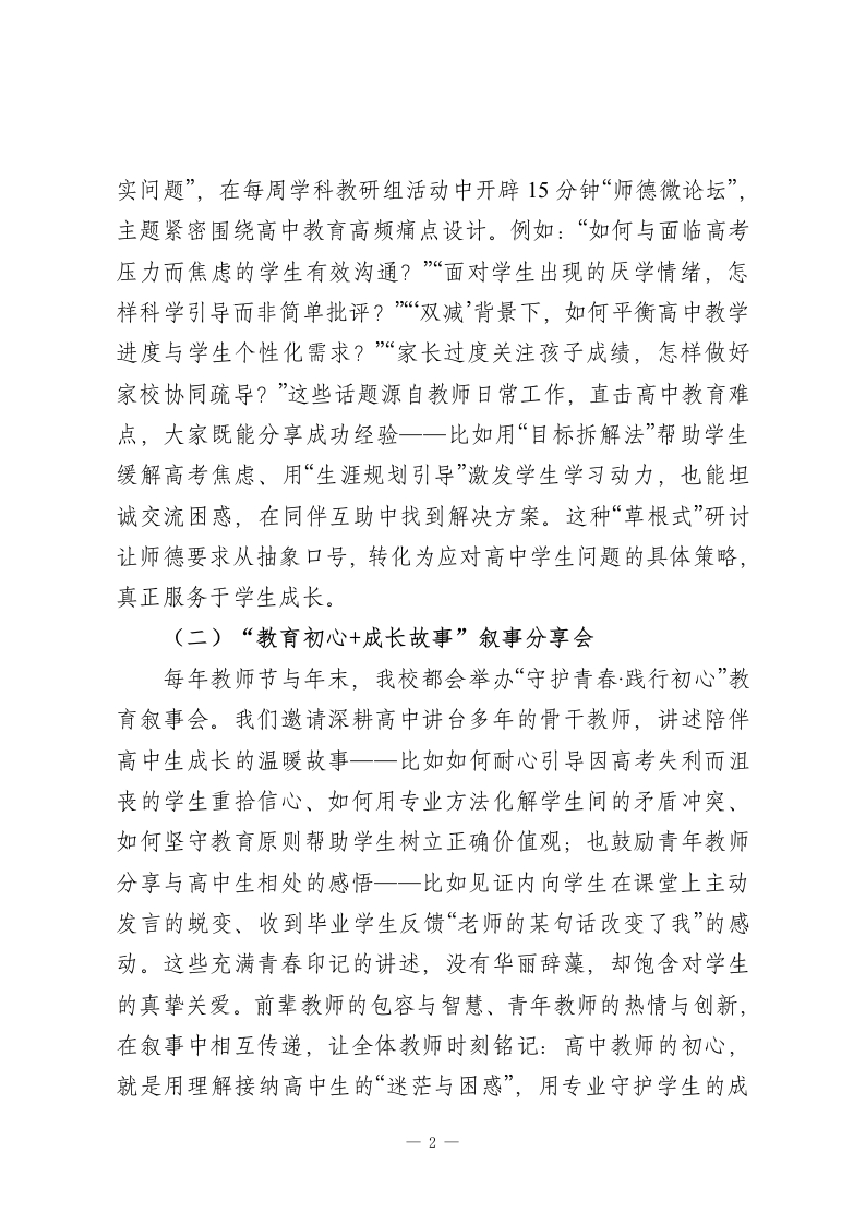 XX高中2025年师德师风建设工作总结汇报尊敬的各位领导、各位同仁:大家好!非常荣幸能在此次全区师德师风建设培训大会上,与各位交流XX高中在师德师风建设中的实践探索与思考。高中阶段是学生世界观、人生观、价值观定型的关键时期,也是学生备战高考、迈向成年的重要阶段。这一时期的教师,既是知识的传授者、学业的引路者,更是学生品格的塑造者、成长的陪伴者。基于这一认知,我校始终坚持“立足高中学情、聚焦成长需求、追求温润实效”的师德建设理念,着力破解“形式化、空泛化”难题,让师德师风建设真正融入教育教学日常、触及教师心灵深处。现将我校2025年师德师风建设工作具体做法汇报如下,恳请各位批评指正。一、创新学习载体,让师德理念扎根高中教育实践高中教师面临的是即将成年的学生群体,他们有独立的思想、强烈的自我意识,也承受着高考的压力。传统“读文件、学理论”的师德学习模式难以引发共鸣。我们坚持“从学情出发、从问题入手”,让师德学习与高中教育场景深度绑定,让教师在解决实际困惑中深化认知、提升素养。(一)“微论坛+高中教育痛点”嵌入式教研我们打破集中学习的传统模式,将师德教育拆解为“小切口、1
