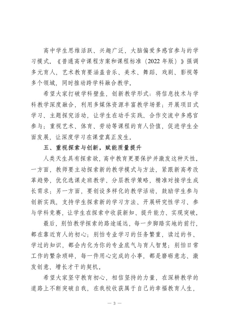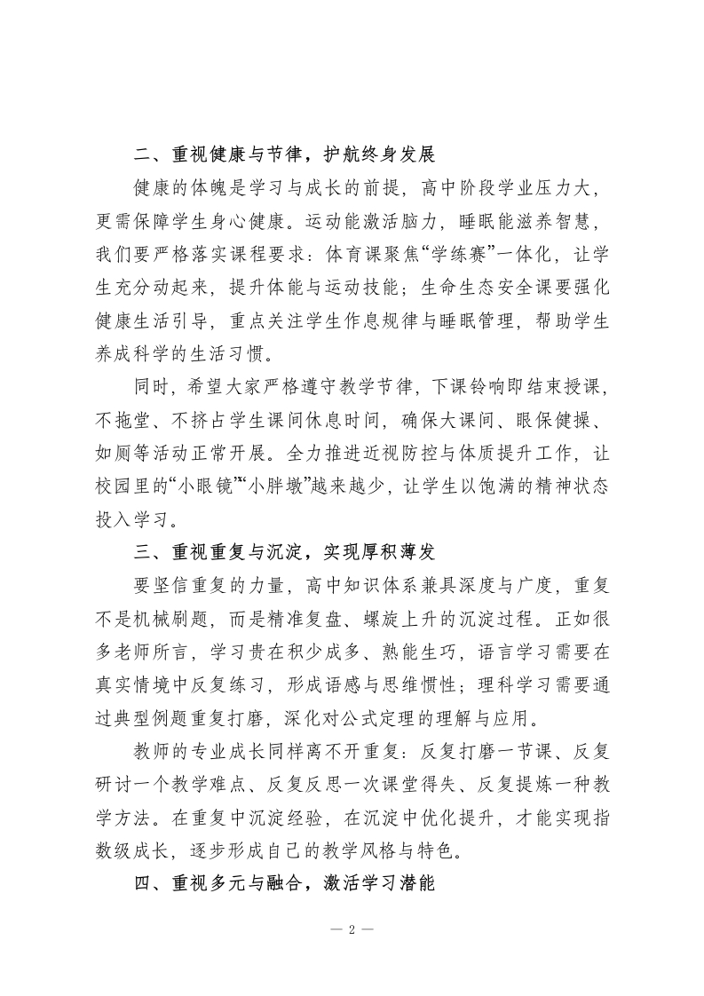 XX高中教学工作总结会校长讲话:守正创新育新苗深耕教学攀新高各位老师:大家好!“诗文随世运,无日不趋新”,教育教学更需紧跟时代步伐、回应改革要求。今天参加教学节总结会,我深感欣慰与感动:青年教师潜心钻研,历经5次、7次磨课打磨精品课堂;老教师甘当人梯,带着年轻教师听课研讨、传经送宝。大家的发言紧扣《普通高中课程方案和课程标准(2022年版)》的新理念、新要求,展现了我校教师深耕教学的责任与担当。结合高中教育特点与新高考改革方向,我想提醒大家重视五个方面,与各位共勉:一、重视素养与习惯,筑牢成长根基《普通高中课程方案和课程标准(2022年版)》明确提出,要有机融入社会主义先进文化、革命文化和中华优秀传统文化,培养“有理想、有本领、有担当”的时代新人,强化课程思想性。高中阶段是学生价值观定型与核心素养培育的关键期,我们既要抓知识传授,更要抓习惯养成与品德塑造。课堂上,要注重培养学生专注听讲、规范表达、合作探究的学习习惯;日常教学中,要引导学生养成自主规划、及时复盘、严谨治学的思维习惯。德行是个人发展的根本,只有筑牢品德根基,学生的智力发展、能力提升才能行稳致远。希望大家始终坚守立德树人初心,将德育融入教学全过程,为学生成长把好方向。1