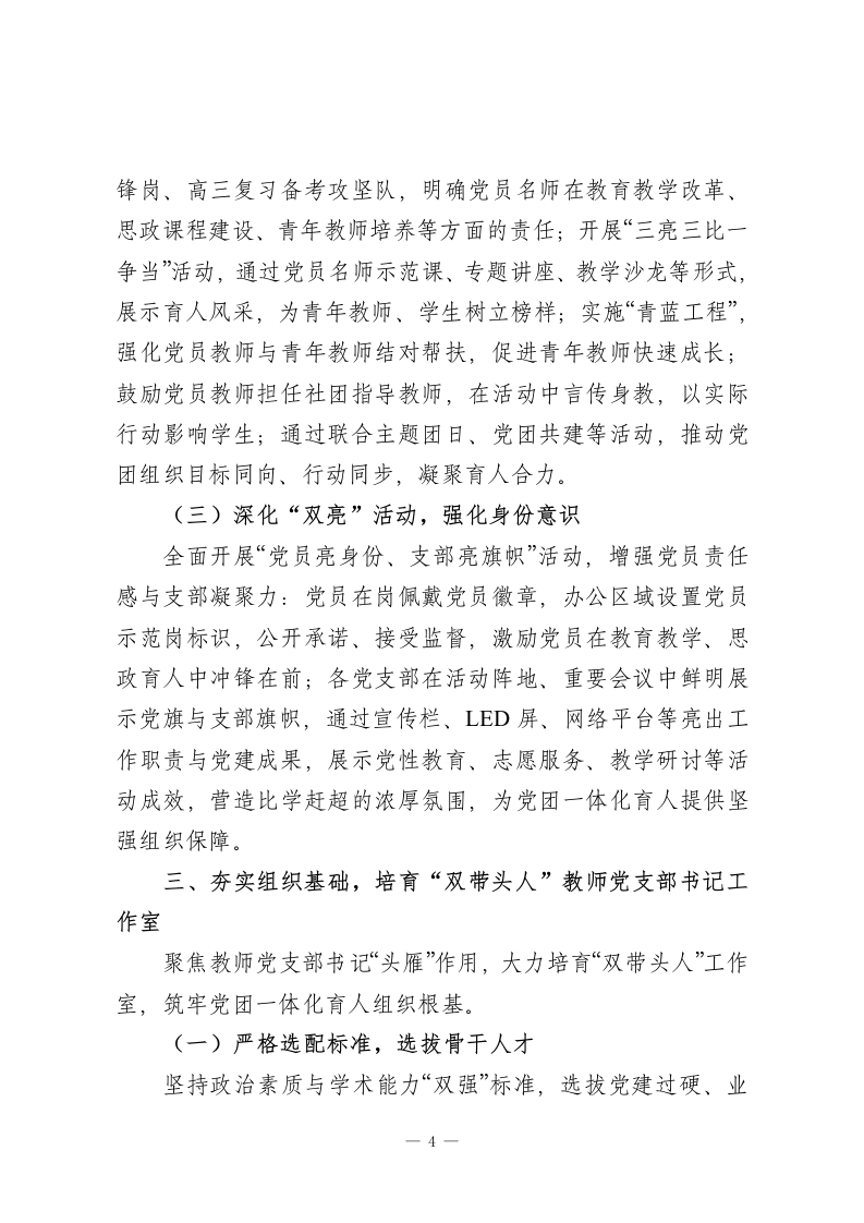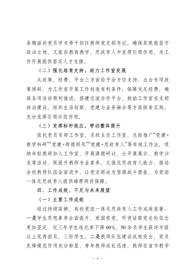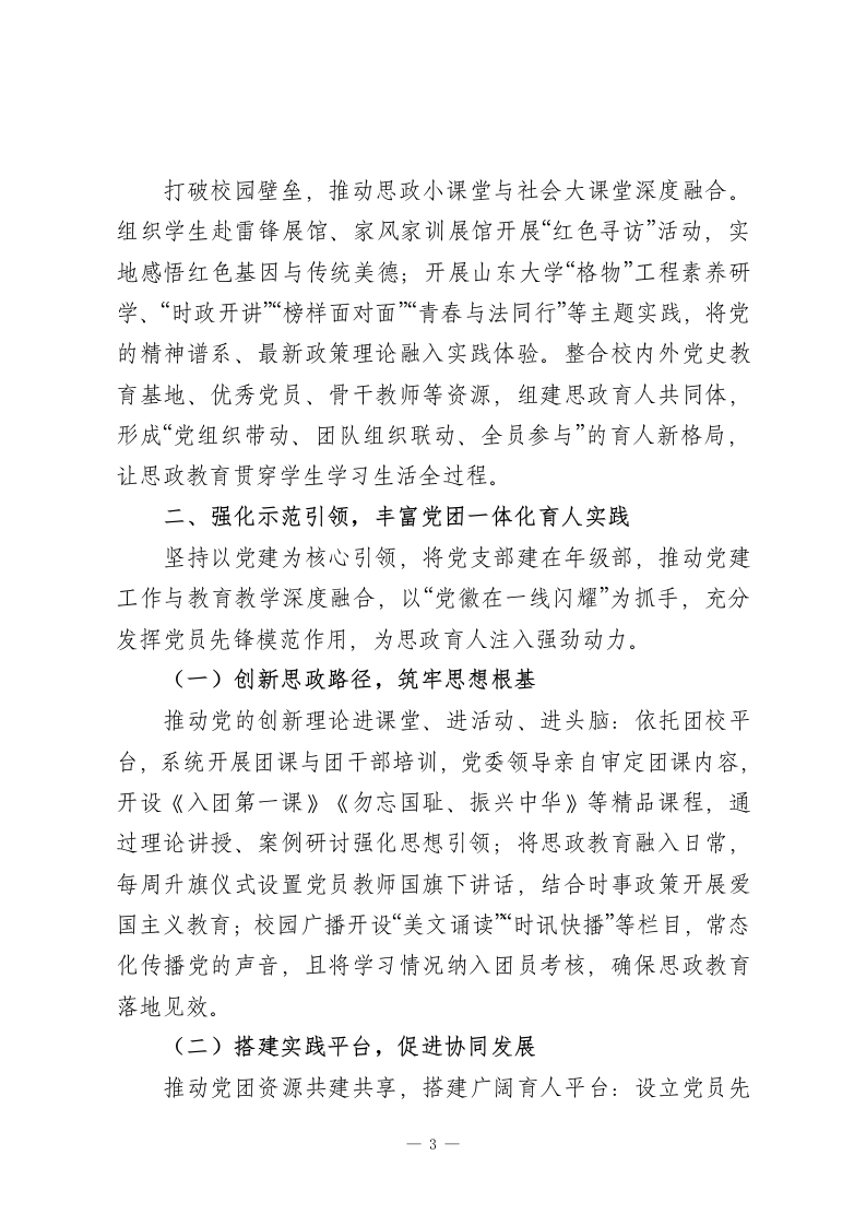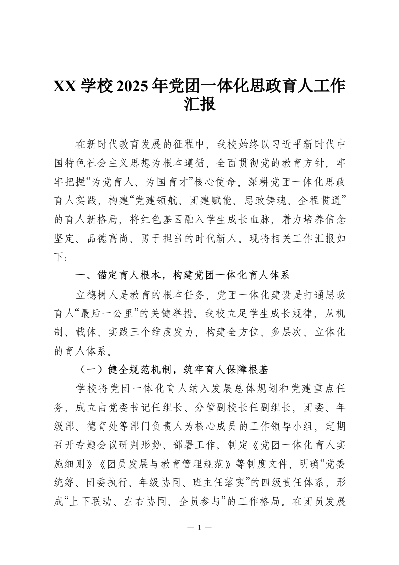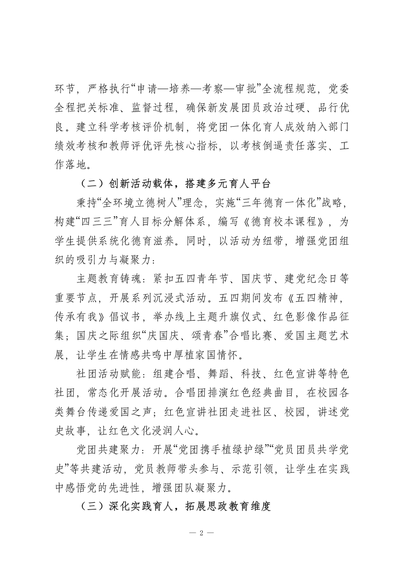 XX学校2025年党团一体化思政育人工作汇报在新时代教育发展的征程中,我校始终以习近平新时代中国特色社会主义思想为根本遵循,全面贯彻党的教育方针,牢牢把握“为党育人、为国育才”核心使命,深耕党团一体化思政育人实践,构建“党建领航、团建赋能、思政铸魂、全程贯通”的育人新格局,将红色基因融入学生成长血脉,着力培养信念坚定、品德高尚、勇于担当的时代新人。现将相关工作汇报如下:一、锚定育人根本,构建党团一体化育人体系立德树人是教育的根本任务,党团一体化建设是打通思政育人“最后一公里”的关键举措。我校立足学生成长规律,从机制、载体、实践三个维度发力,构建全方位、多层次、立体化的育人体系。(一)健全规范机制,筑牢育人保障根基学校将党团一体化育人纳入发展总体规划和党建重点任务,成立由党委书记任组长、分管副校长任副组长,团委、年级部、德育处等部门负责人为核心成员的工作领导小组,定期召开专题会议研判形势、部署工作。制定《党团一体化育人实施细则》《团员发展与教育管理规范》等制度文件,明确“党委统筹、团委执行、年级协同、班主任落实”的四级责任体系,形成“上下联动、左右协同、全员参与”的工作格局。在团员发展1