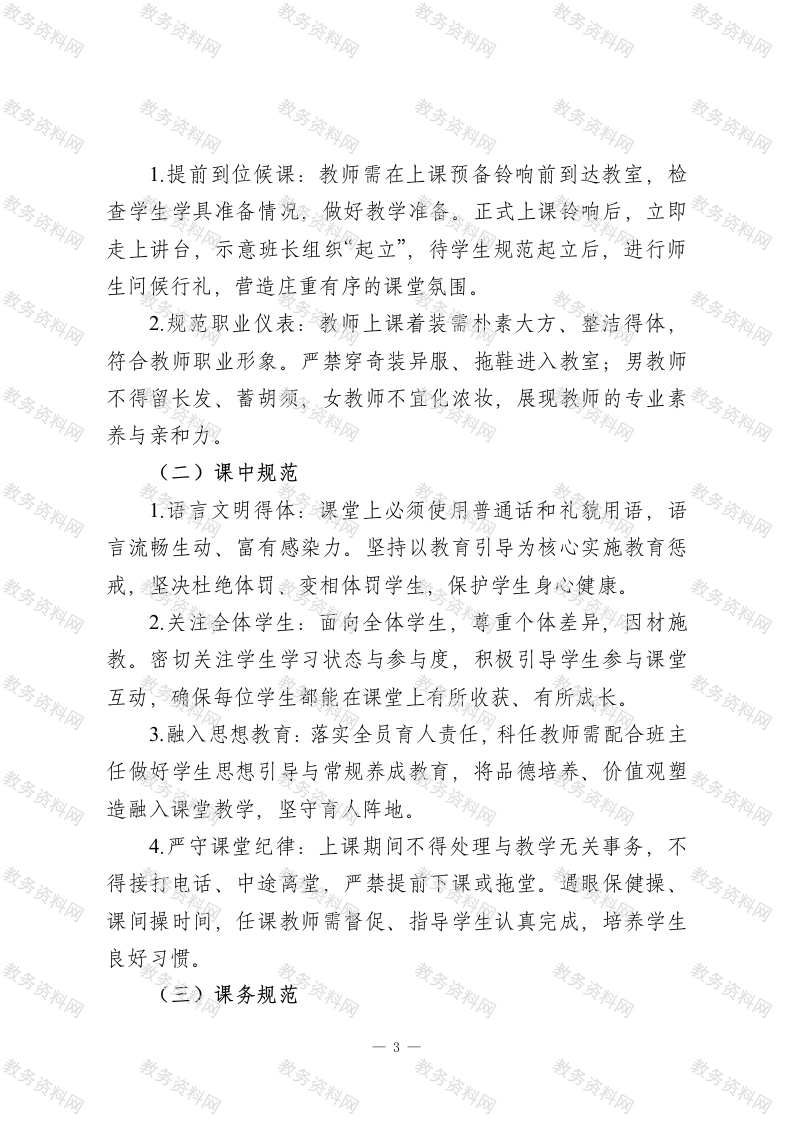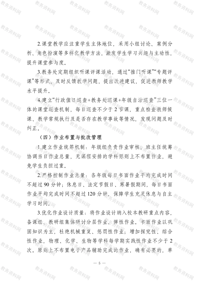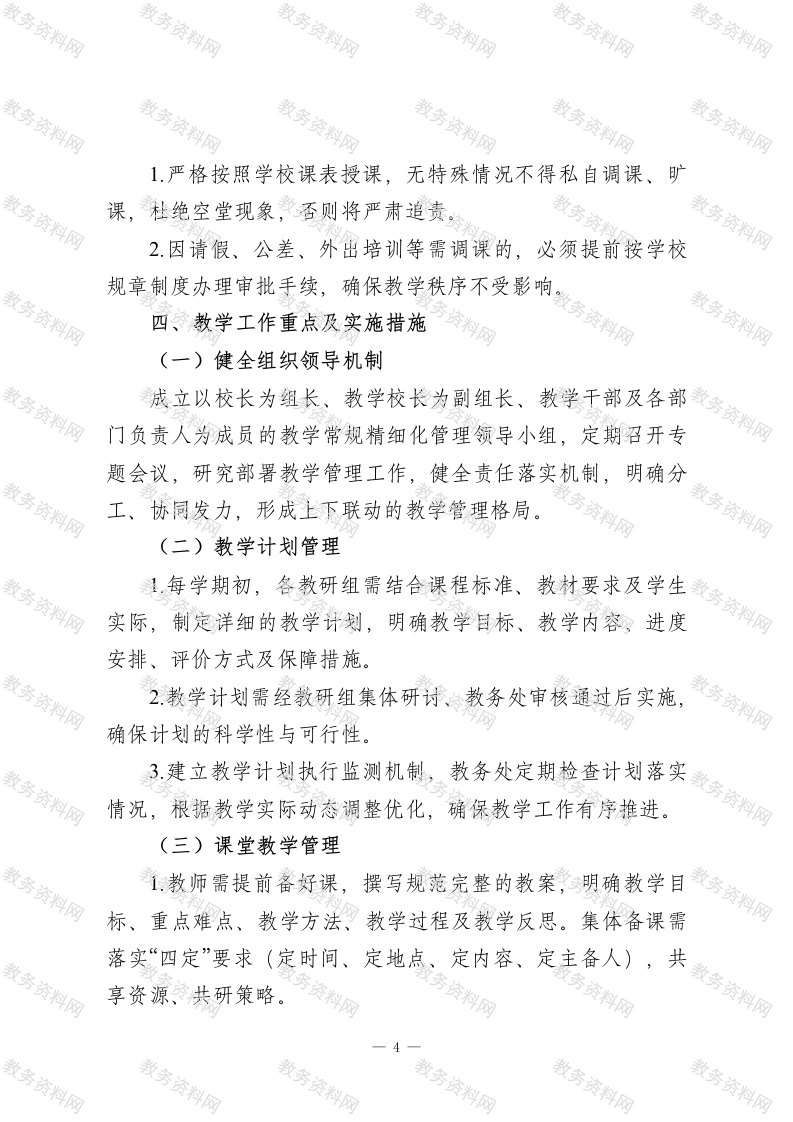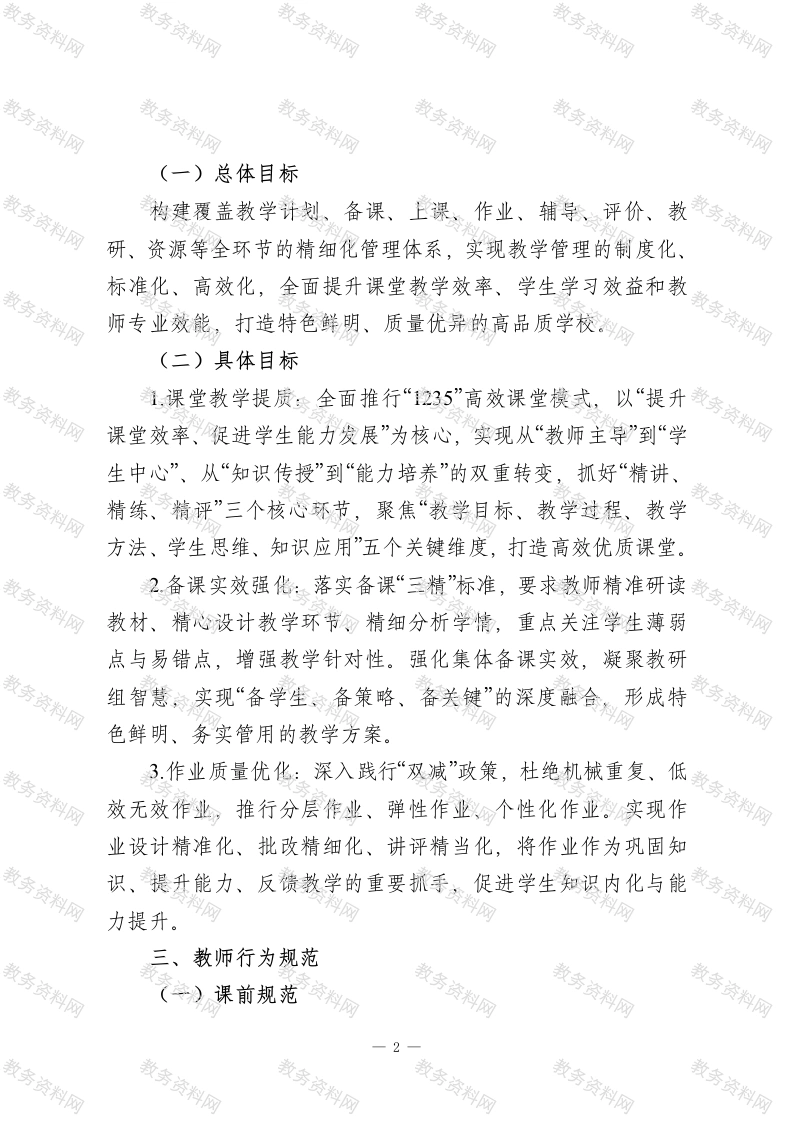 XX学校教学常规精细化管理实施细则一、指导思想与基本原则(一)指导思想以习近平新时代中国特色社会主义思想为根本遵循,全面贯彻党的教育方针,坚守立德树人根本任务,树立科学教育质量观。围绕学校高质量发展核心目标,聚焦素养课堂建设、立体综合教研、教学评价牵引三大关键抓手,夯实教学专业根基,推动教学常规管理向精细化、规范化、科学化迈进,全面提升教学质量,促进学生德、智、体、美、劳全面发展,保障教学工作高效有序开展。(二)基本原则1.育人为本:始终以学生全面发展为出发点和落脚点,将育人理念贯穿教学管理全过程。2科学规范:遵循教育规律与学生成长规律,建立标准明晰、流程合理、操作可行的管理制度体系。3精细高效:明确管理责任,细化教学各环节要求,关注细节管控,追求管理效益最大化。4协同联动:强化学校领导、职能部门、教研组、年级组、备课组及全体教师的协同配合,凝聚管理合力。5.持续改进:构建动态监测、及时反馈、优化提升的闭环机制,推动教学常规管理螺旋式上升。二、工作目标一1
