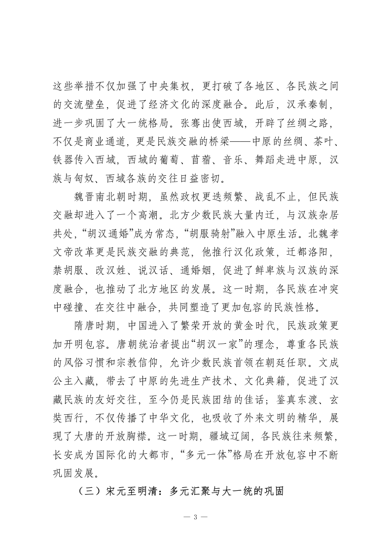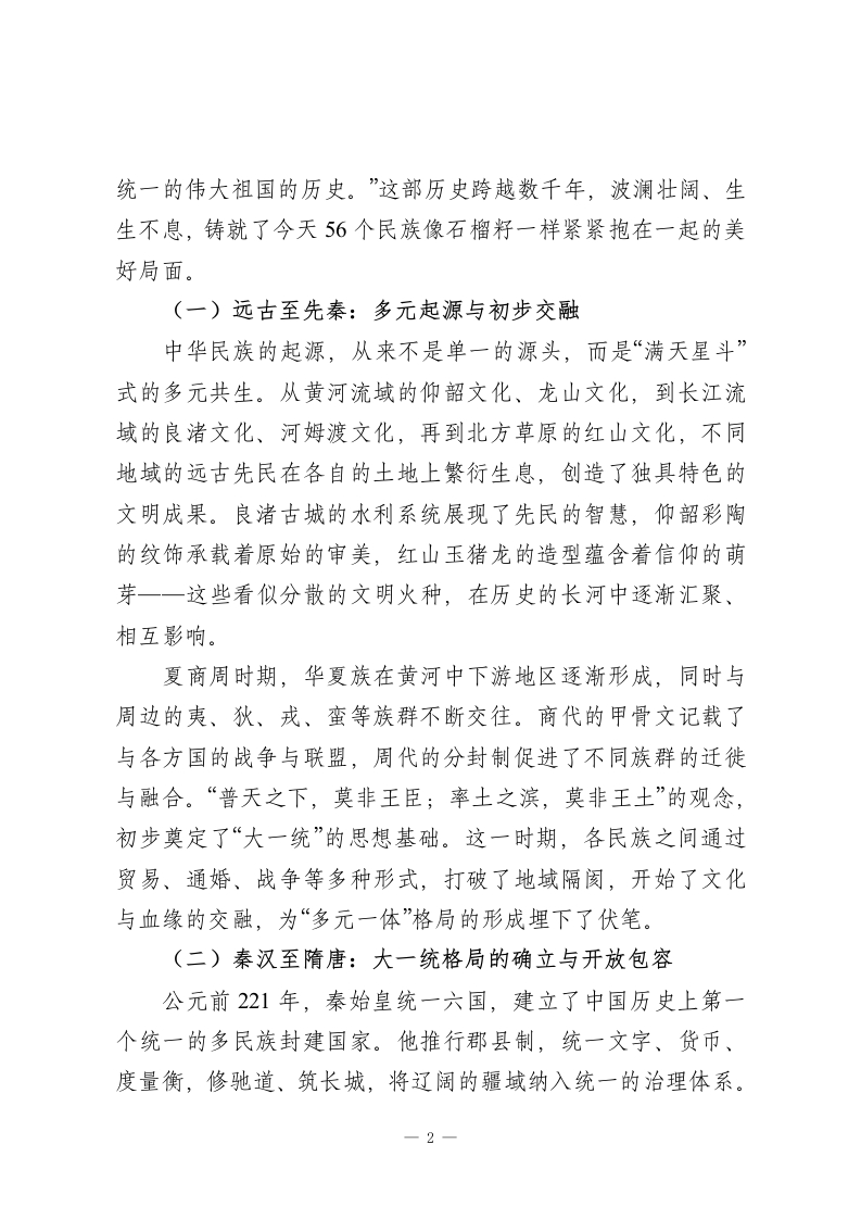 X市委常委、政法委书记在市第八中学上关于铸牢中华民族共同体意识的思政课讲稿树牢正确中华民族历史观为筑梦新时代贡献青春力量尊敬的各位老师,亲爱的同学们:大家上午好!今天,非常荣幸能够走进朝气蓬勃的XX市第八中学,与各位老师、同学们面对面交流。当看到大家青春洋溢的笑脸、眼中闪烁的理想光芒,我仿佛也回到了意气风发的少年时代。青少年是国家的未来、民族的希望,是铸牢中华民族共同体意识的关键群体。习近平总书记多次强调:“铸牢中华民族共同体意识是新时代党的民族工作的‘纲’,所有工作要向此聚焦。”今天,我以“树牢正确中华民族历史观为筑梦新时代贡献青春力量”为主题,与大家共同探讨中华民族共同体的形成根基、精神内核,以及新时代青年肩负的使命担当,希望这堂课能成为大家成长路上的一盏明灯,让民族团结的种子在心中生根发芽,让共同体意识融入血脉、化为行动。一、溯源:中华民族多元一体大家庭的形成脉络与觉醒历程要理解“中华民族共同体”,首先要读懂中华民族的历史。习近平总书记指出:“一部中国史,就是一部各民族交融汇聚成多元一体中华民族的历史,就是各民族共同缔造、发展、巩固1