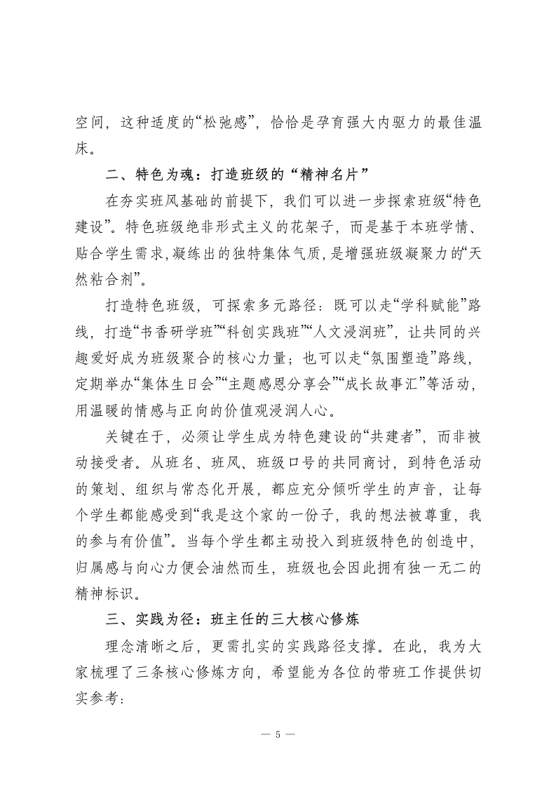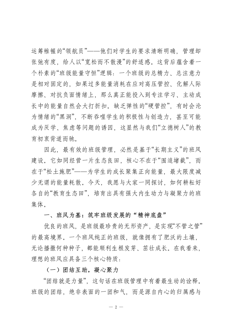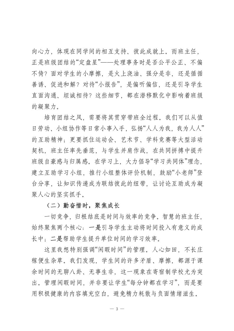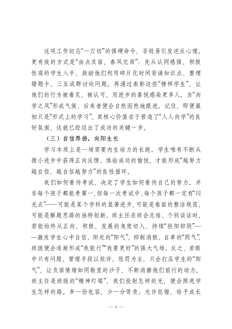班主任会议,校长讲话为什么有的班级管得越严,成绩越差尊敬的各位班主任老师:大家下午好!期中考试的尘埃渐渐落定,成绩单上的每一组数据,都镌刻着各位班主任的日夜操劳与无私付出。这段时间,大家既要埋首批改试卷、精准分析学情,又要悉心安抚学生情绪、妥善处理班级琐事,更要耐心回应家长关切,这份辛劳与坚守,全校师生有目共睹。在此,我代表学校,向每一位默默耕耘的班主任道一声:你们辛苦了!你们的坚守,是学校发展最坚实的底气;你们的付出,值得最高的敬意!今天召集大家齐聚于此,并非复盘成绩的优劣,更不是增添大家的焦虑,而是想与各位并肩同行的同仁,坦诚交流带班路上的困惑与感悟,共同探寻更科学、更温暖、更具生命力的班级管理路径。班级管理始终绕不开一个核心命题:如何让管理既守得住底线,又育得出活力,真正滋养每一个学生的成长?近期我一直在观察与思考一个值得深思的现象:为何有些班级看似管理严苛、盯防甚紧,班级成绩与整体风貌却未能如愿向好,甚至出现“越管越糟”的窘境?这绝非否定严格管理的价值,而是提醒我们重新审视“严格”的内核与实现方式。我们不难发现,那些成绩稳定、氛围和谐、后劲十足的班级,其班主任往往不是事无巨细的“监工”,而是1