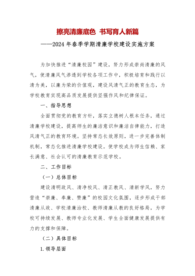 擦亮清廉底色书写育人新篇2024年春季学期清廉学校建设实施方案为加快推进“清廉校园”建设,努力形成崇尚清廉的风气,使清廉风气渗透到学校各项工作中,积极培育和践行以清为美,以廉为荣的价值观,建设风清气正的教育生态,为学校教育实现高品质发展提供坚强作风和纪律保证。一、指导思想全面贯彻党的教育方针,落实立德树人根本任务,通过清廉学校建设,提高师生的廉洁意识和廉洁自律能力,打造风清气正的教育环境。坚持常态长效原则,进一步完善体制机制,常态化推进清廉学校建设。使学校成为师生信赖、家长满意、社会认可的清廉教育示范学校。二、工作目标(一)总体目标建设清明政风、清净校风、清正教风、清新学风,努力营造“崇廉、奉廉、赞廉”的校园文化氛围,逐步形成干部清廉从政、学校清廉治校、教师清廉从教的良好格局,为学校可持续发展、教师专业化发展、学生全面健康发展提供有力的支撑和保障。(二)具体目标1.领导层面