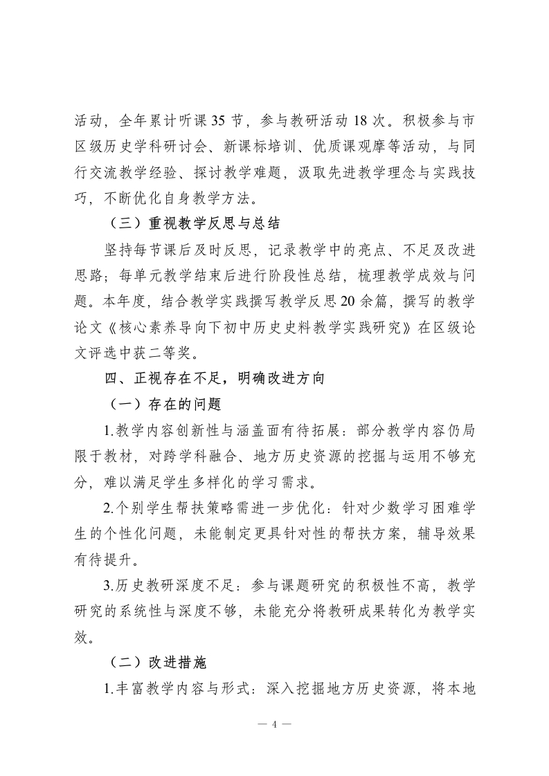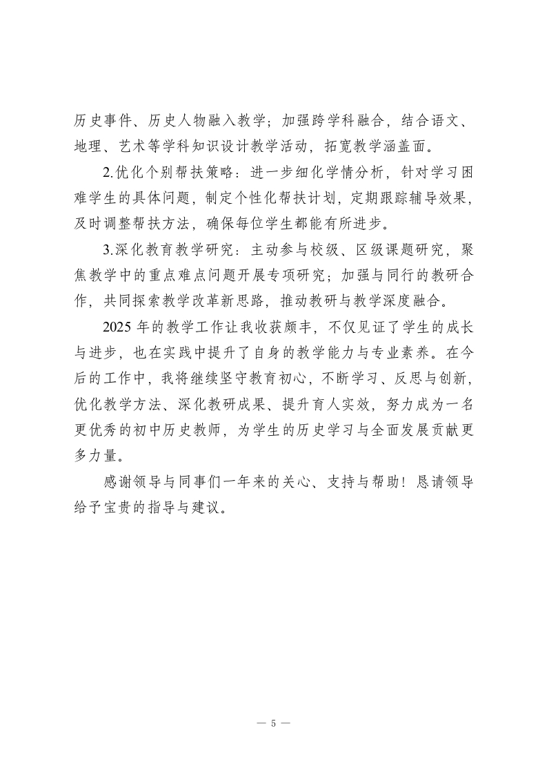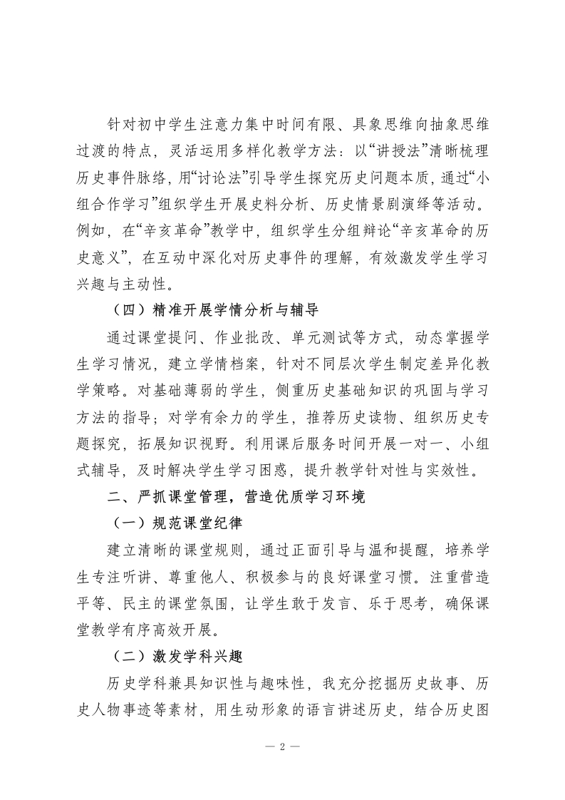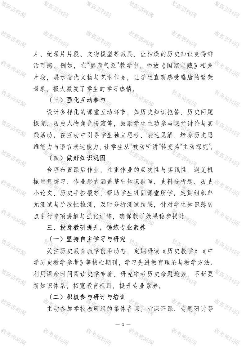 初中历史教师2025考核个人工作总结尊敬的考核领导:您们好!2025年,我始终秉持“以史育人、以文化人”的教育理念,扎根初中历史教学一线,结合新课标要求与学生认知特点,扎实推进教学、教研与育人工作。现将本年度工作情况总结如下,恳请领导批评指正。一、深耕教学实践,筑牢育人核心(一)精准定位教学目标严格贯彻《义务教育历史课程标准(2022年版)》要求,立足初中学生历史核心素养培育需求,制定“知识与技能、过程与方法、情感态度与价值观”三位一体的教学目标。课前通过学情调研、与学生谈心、家校沟通等方式,精准把握学生历史知识储备与兴趣点,确保教学目标既贴合课程要求,又符合学生实际。(二)精心做好教学准备深入研读教材与课标,梳理历史知识脉络,挖掘教材中的家国情怀、民族精神、历史智慧等德育元素。结合初中历史阶段性特点,制定科学合理的教学计划,精心撰写每一份教案,注重教学环节的逻辑性与趣味性。同时,广泛搜集史料、历史图片、纪录片片段等教学资源,制作图文并茂的课件,为课堂教学奠定坚实基础。(三)创新优化教学方法一1