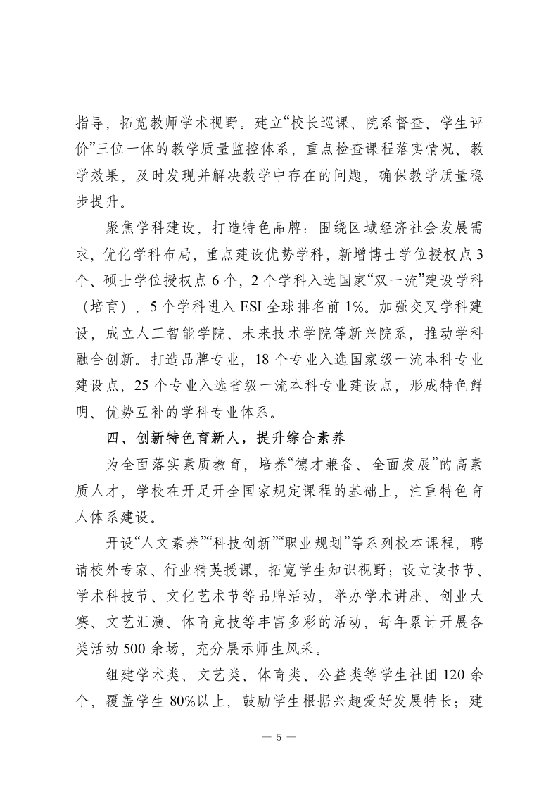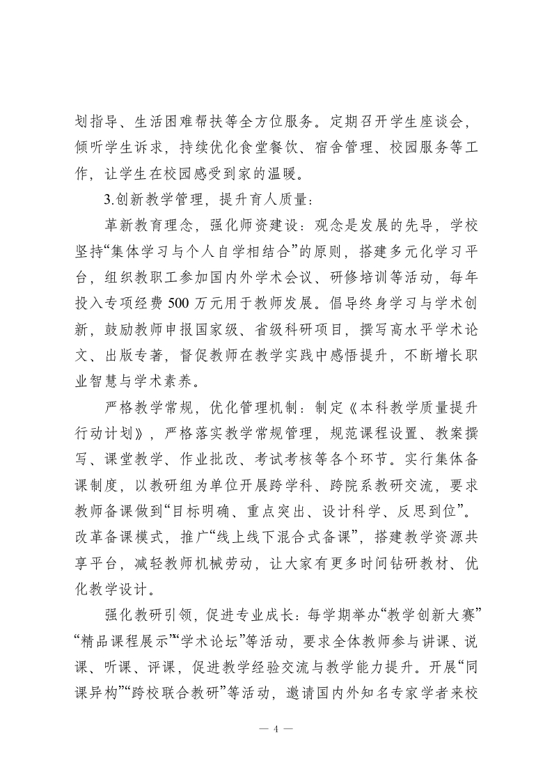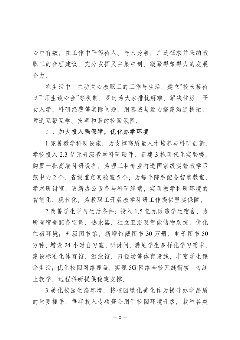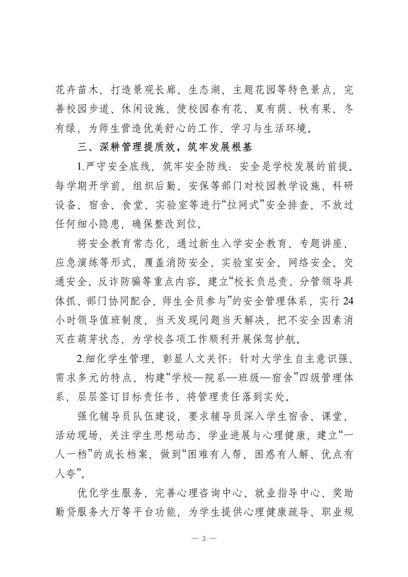 大学校长2025年度个人工作汇报:深耕育人沃土,共筑一流学府尊敬的各位领导、各位同仁:大家好!我校作为一所涵盖多个学科门类、拥有全日制在校生12000余名、教职工800余名的综合性大学,肩负着为国家培养高素质人才、推动科技创新与社会服务的重要使命。任职以来,我始终以“建设特色鲜明、国内知名的高水平大学”为目标,坚守“立德树人”根本任务,致力于改善办学条件、提升育人质量、优化管理效能。如今,学校办学实力稳步增强,学科建设成效显著,校园环境和谐优美,社会声誉持续提升。现将近年来履行校长岗位职责的工作情况汇报如下:一、以身作则作表率,凝聚发展合力一所大学的发展,校长的引领作用至关重要。我始终秉持“堂堂正正做人、踏踏实实做事”的理念,以坦诚的态度、务实的作风为全体教职工树立榜样。坚持与师生同学习、共进步,深入学习党的教育方针、高等教育发展规律与前沿学术动态,积极投身教育教学改革,每年深入课堂听课评课不少于30节,与教师共同探讨学科建设、课程改革等核心问题,以先进教育理念指导学校发展。严格遵守工作纪律,坚持每天提前到校,巡查教学科研场所、了解师生需求,全程参与学校重要活动,对各项工作做到1