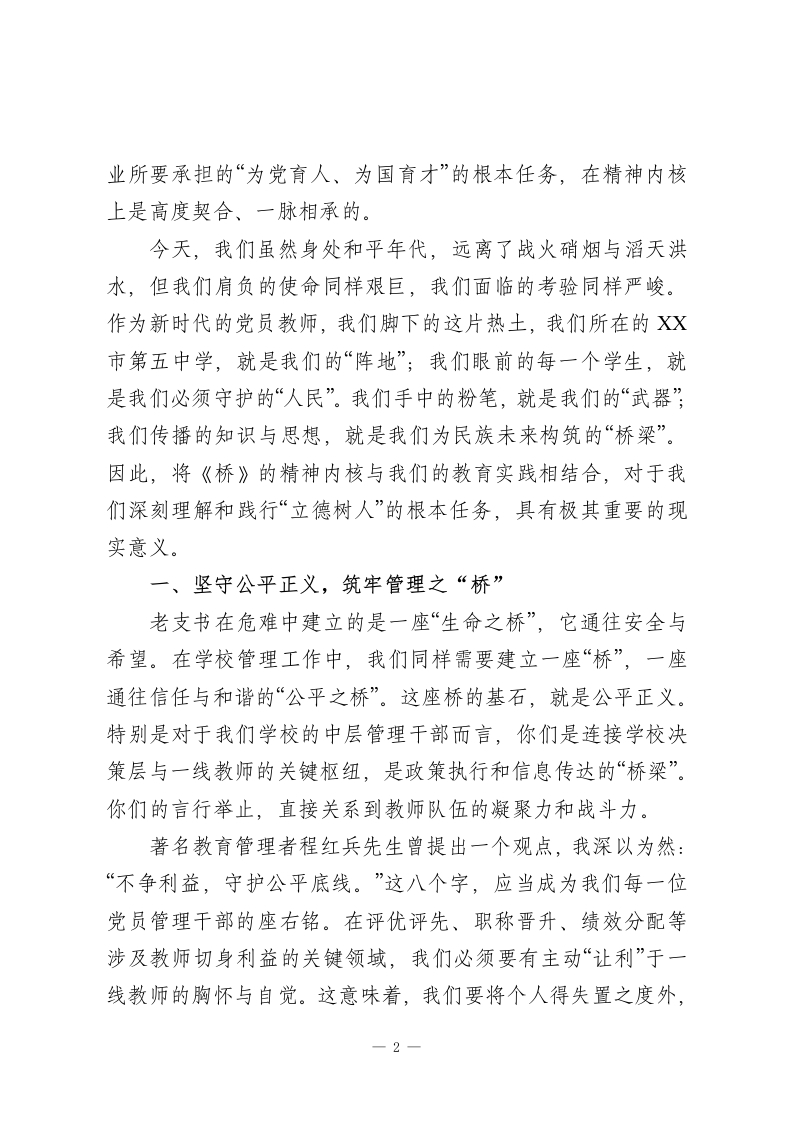 党课:牢记教师使命,不忘育人初心同志们:今天,我们齐聚一堂,共同探讨一个对我们每位教育工作者而言,既庄严又深刻的时代命题一“牢记教师使命,不忘育人初心”。作为一名党员教师,我们的初心是什么?我们的使命又在何方?我想,答案既蕴含在党的根本宗旨之中,也镌刻在我们每天面对的莘莘学子和三尺讲台之上。开宗明义,我想从一篇我们许多同志都耳熟能详的课文谈起一一《桥》。这篇课文讲述了一个惊心动魄的故事:山洪暴发,一位老共产党员,村里的党支部书记,在生死关头,以他那沙哑却无比坚定的声音指挥着全村人撤离。面对咆哮而至的洪魔,他没有丝毫的犹豫和退缩,而是将自己化身为一座坚不可摧的桥梁,一座用生命和信仰铸就的桥梁。他把生的希望留给了群众,把死的危险毅然决然地留给了自己。当木桥最终被洪水吞没时,一座无形而伟大的“桥”却在幸存者的心中,也在我们每一个读者的心中巍然矗立。这座“桥”,是什么?它就是共产党人“我将无我,不负人民”的崇高境界,是“随时准备为党和人民牺牲一切”的铮铮誓言,是危难时刻挺身而出、恪尽职守的责任担当。课文中的老支书,正是千千万万优秀共产党员的缩影。他的形象,深刻诠释了什么是初心,什么是使命。他的行动,与党的二十大报告中强调的“江山就是人民,人民就是江山”的核心理念,与我们教育事1-
