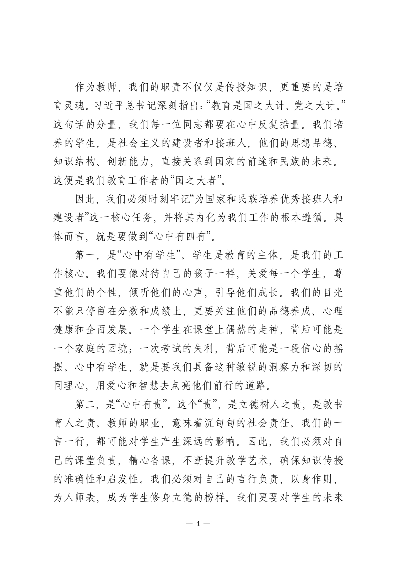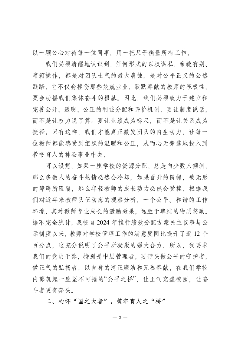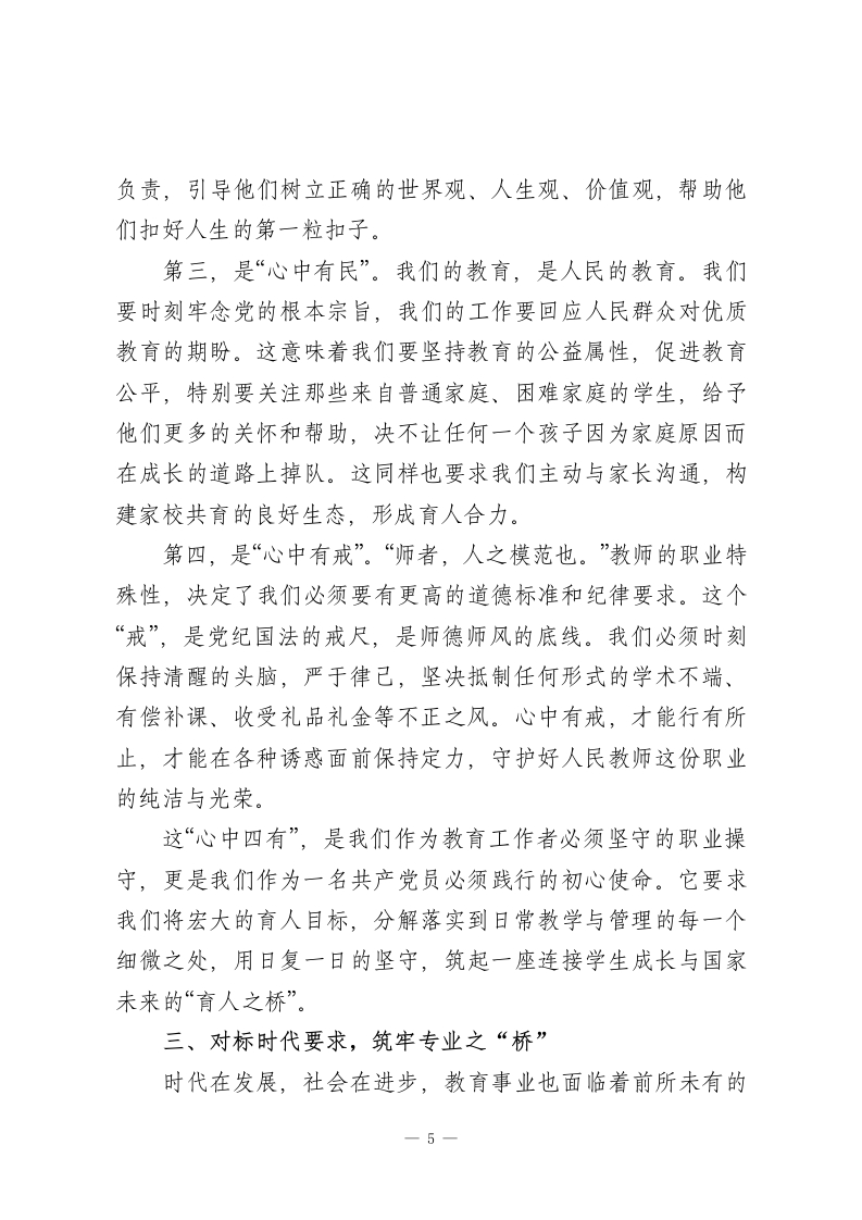 党课:牢记教师使命,不忘育人初心同志们:今天,我们齐聚一堂,共同探讨一个对我们每位教育工作者而言,既庄严又深刻的时代命题一“牢记教师使命,不忘育人初心”。作为一名党员教师,我们的初心是什么?我们的使命又在何方?我想,答案既蕴含在党的根本宗旨之中,也镌刻在我们每天面对的莘莘学子和三尺讲台之上。开宗明义,我想从一篇我们许多同志都耳熟能详的课文谈起一一《桥》。这篇课文讲述了一个惊心动魄的故事:山洪暴发,一位老共产党员,村里的党支部书记,在生死关头,以他那沙哑却无比坚定的声音指挥着全村人撤离。面对咆哮而至的洪魔,他没有丝毫的犹豫和退缩,而是将自己化身为一座坚不可摧的桥梁,一座用生命和信仰铸就的桥梁。他把生的希望留给了群众,把死的危险毅然决然地留给了自己。当木桥最终被洪水吞没时,一座无形而伟大的“桥”却在幸存者的心中,也在我们每一个读者的心中巍然矗立。这座“桥”,是什么?它就是共产党人“我将无我,不负人民”的崇高境界,是“随时准备为党和人民牺牲一切”的铮铮誓言,是危难时刻挺身而出、恪尽职守的责任担当。课文中的老支书,正是千千万万优秀共产党员的缩影。他的形象,深刻诠释了什么是初心,什么是使命。他的行动,与党的二十大报告中强调的“江山就是人民,人民就是江山”的核心理念,与我们教育事1-
