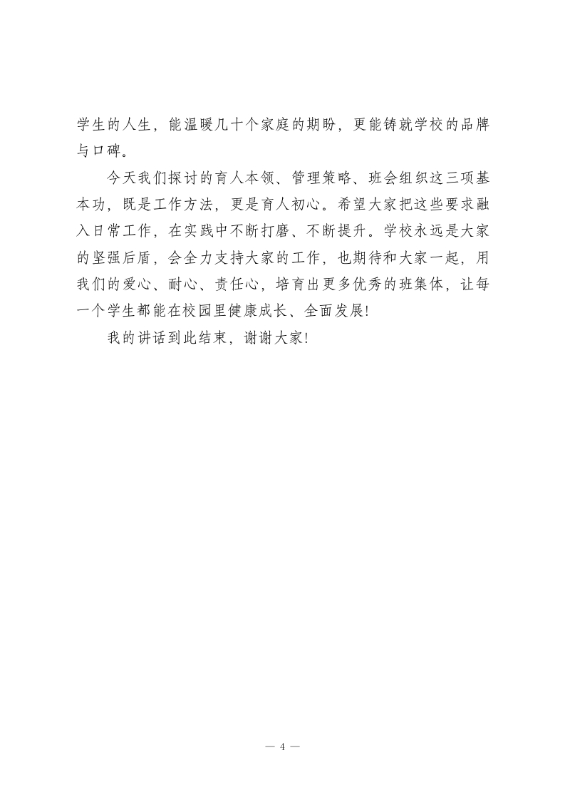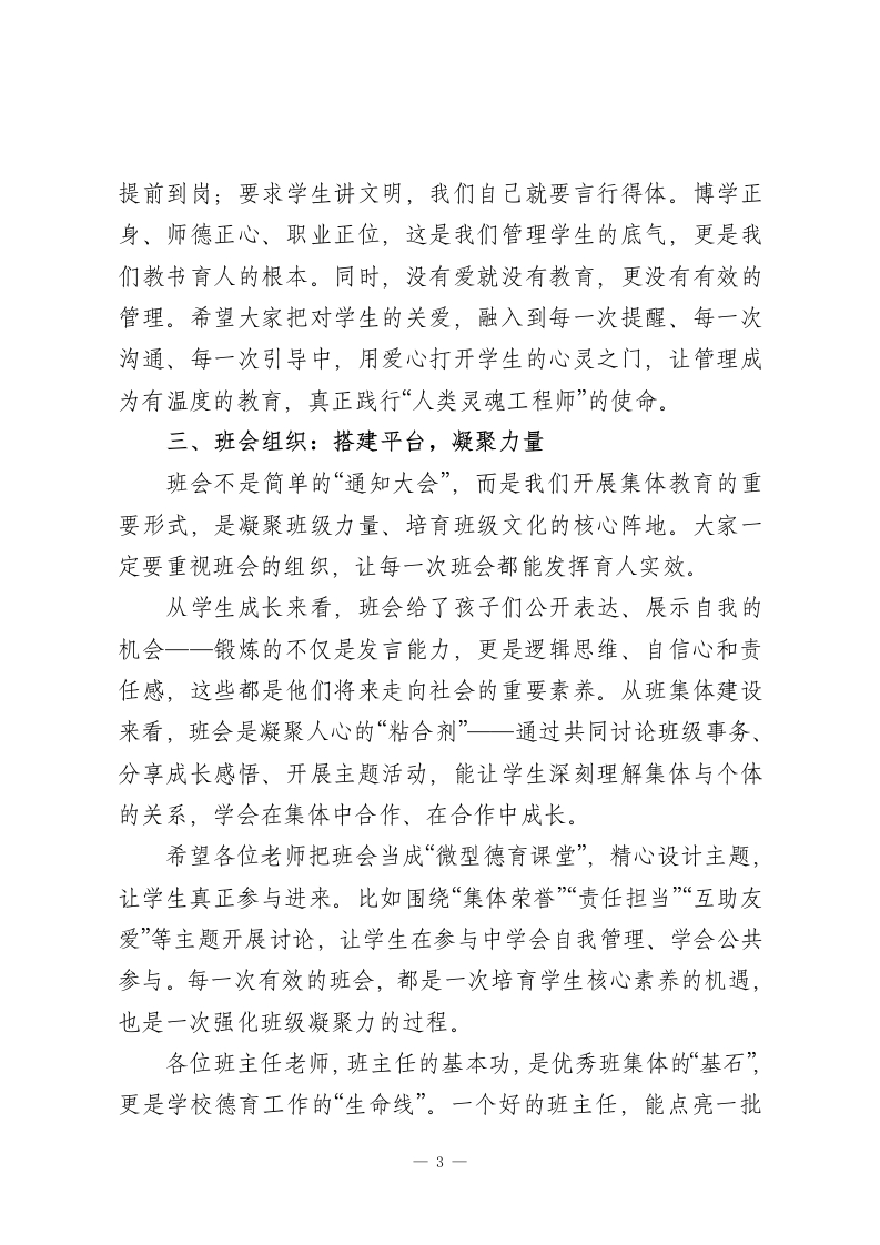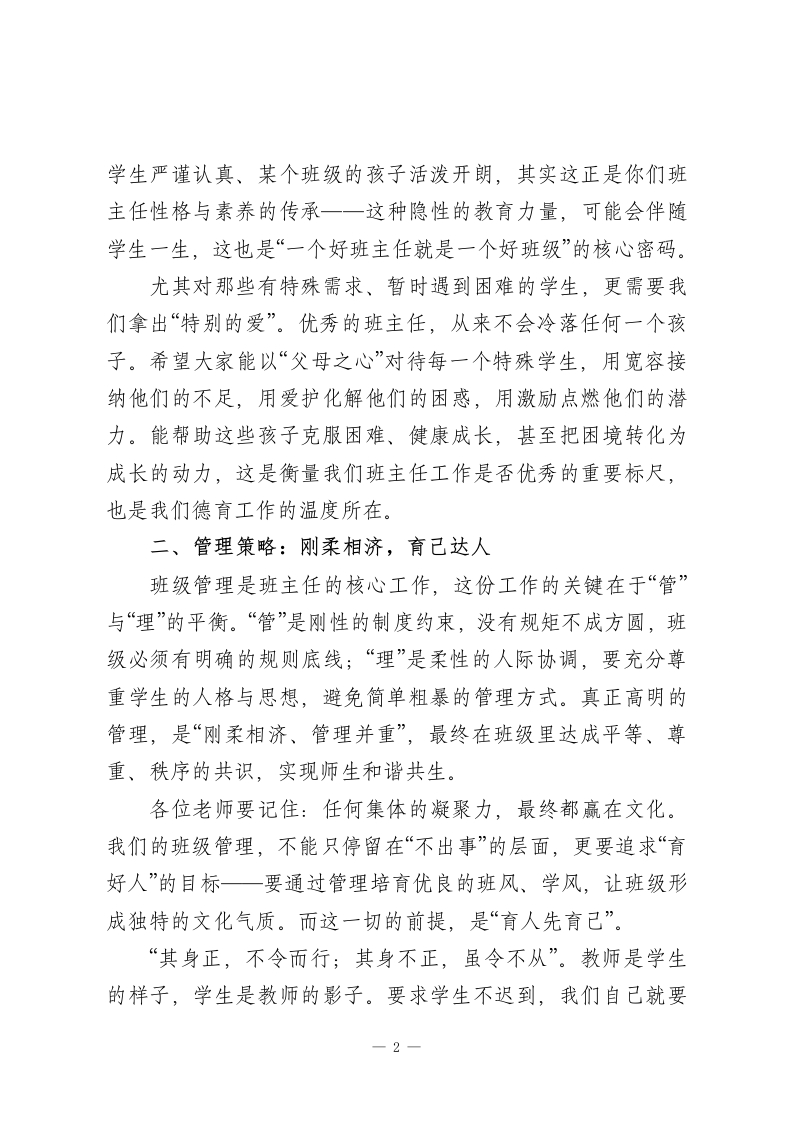 德育副校长在班主任提升培训会上讲话:一个好的班主任就是一个好的班级各位班主任老师:大家下午好!今天我们齐聚这里,开展班主任工作专题培训,核心是想和大家深入探讨一个核心命题一一班主任的基本功,究竟如何成为优秀班集体成长的坚实保障,如何让“一个好的班主任就是一个好的班级”这句话,真正落地为学生的幸运、家庭的幸福、学校的品牌。我们常说,班主任是“世界上权力最小、责任最大的主任”。大家管理的不是简单的集体,而是几十个鲜活的生命,是几十个家庭的期盼。这份工作的复杂性、重要性,决定了我们必须筑牢三项核心基本功,接下来我们逐一交流:一、育人本领:以爱为基,润心无声班主任的第一身份是“育人者”,班级就是我们的“育人阵地。几十个孩子组成的班集体,就像一个大家庭,大家既是管理者,更是这个家庭的“大家长”。我们的核心责任,是让每个孩子都能“在班如家、爱班如家”,在集体中养成正确的世界观、人生观、价值观。各位老师,学生的“向师性”远比我们想象的更深刻。你们的言谈举止、处事风格、待人接物的态度,会像春雨般“润物细无声”,悄悄烙印在学生的成长轨迹里。我们常评价某个班级的1