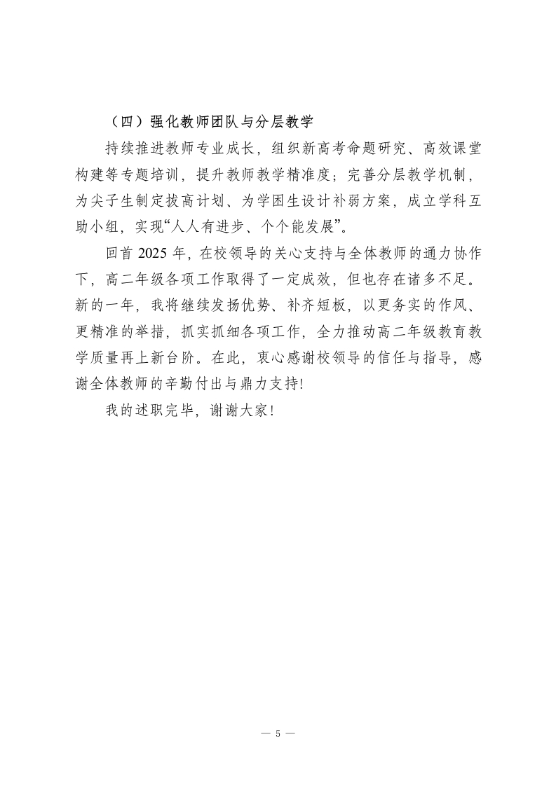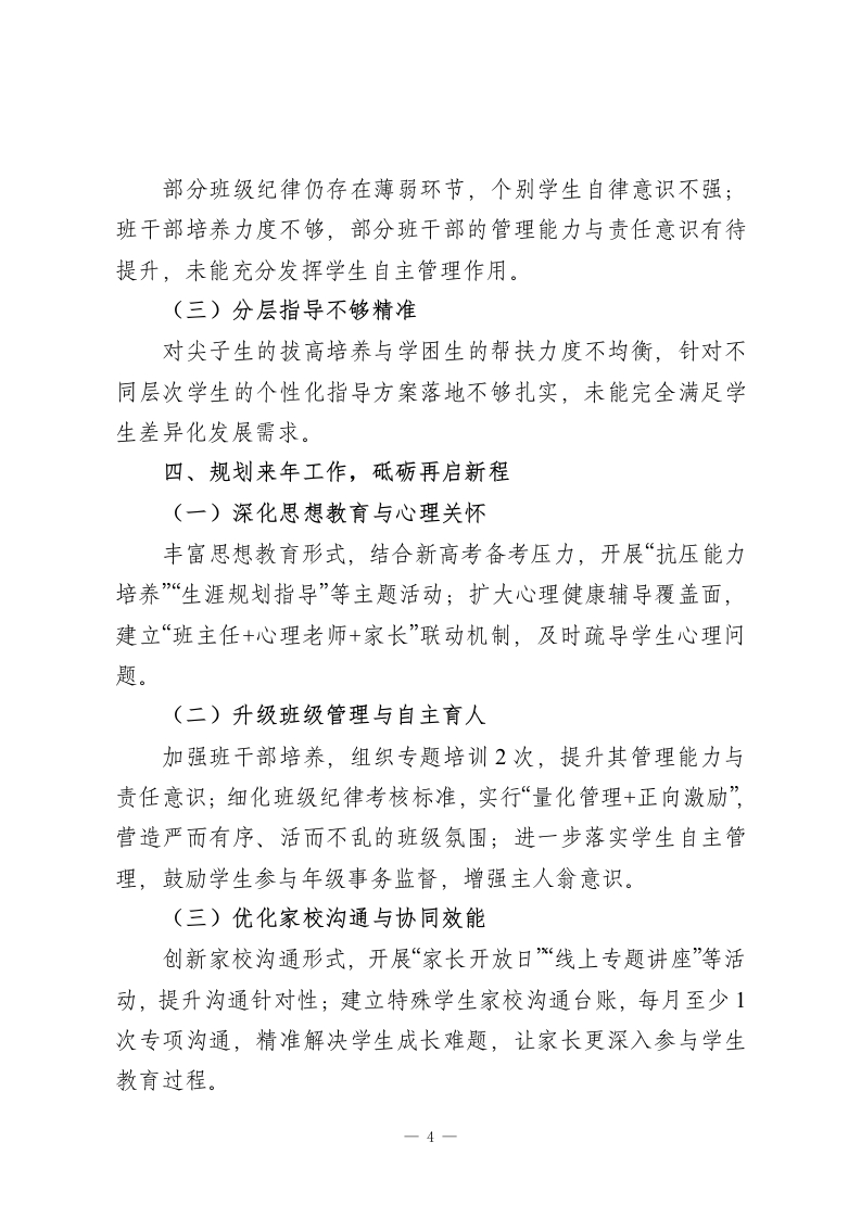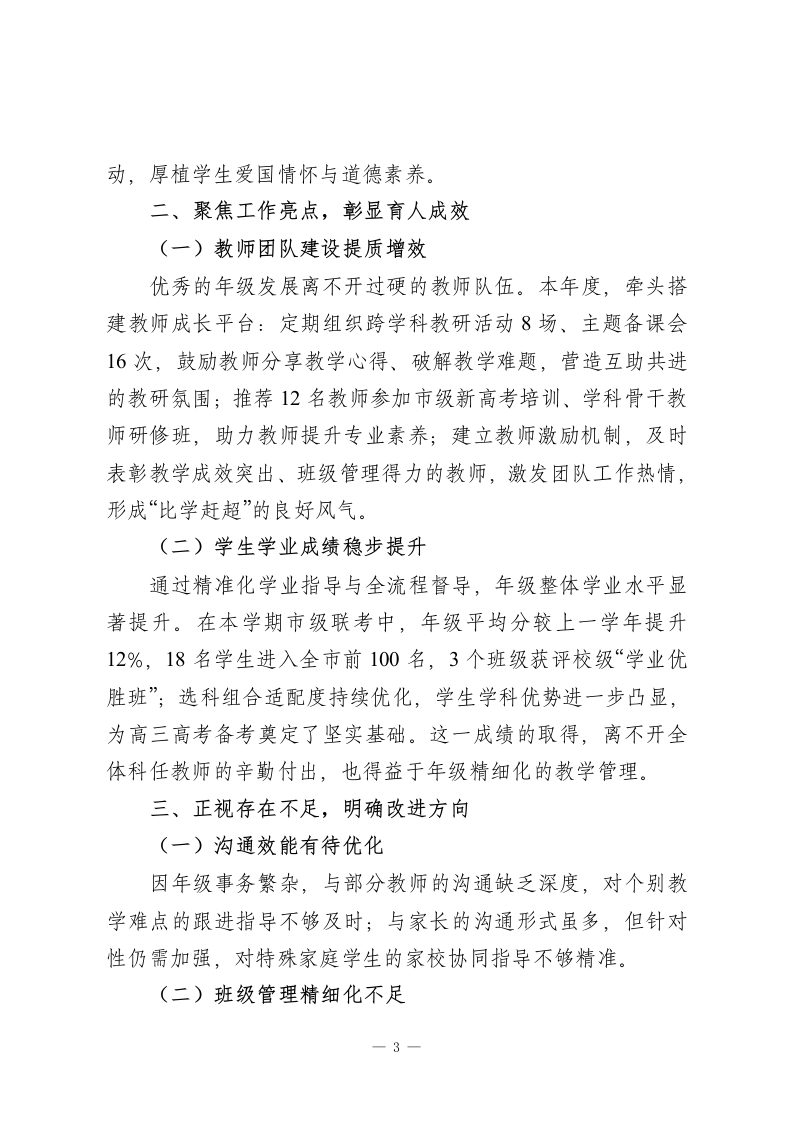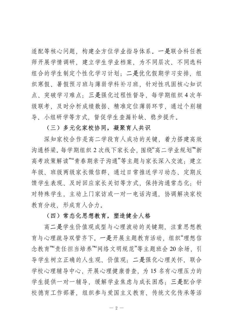 高二班主任2025个人述职报告:凝心聚力促发展,砥砺奋进再提质尊敬的校领导、各位老师:大家好!我是XX中学高二年级主任。2025年,是高二年级承上启下、夯实新高考备考基础的关键一年。作为年级主任,我始终秉持“立德树人、务实笃行”的工作理念,直面学段特点带来的挑战,与全体科任教师凝心聚力、协同奋进,稳步推进各项工作。现将本年度工作情况向各位领导、老师作详细汇报,请予评议。一、深耕核心工作,筑牢育人根基(一)精细化班级管理,凝聚成长合力坚持“以生为本”的管理理念,聚焦高二学生身心发展特点与班级建设需求,筑牢管理根基。一是建立常态化沟通机制,每周组织班主任例会,及时梳理班级管理中的问题、分享育人经验,动态掌握学生学习生活状况;二是丰富班级活动载体,组织“学风建设主题班会“班级凝聚力拓展活动”等12场,营造团结向上的班级氛围;三是推动实践育人,牵头组织志愿服务、社区调研等社会实践活动4次,培养学生社会责任感与团队协作能力。(二)精准化学业指导,提升备考实效针对高二学科难度加深、知识体系繁杂、新高考选课走班-1