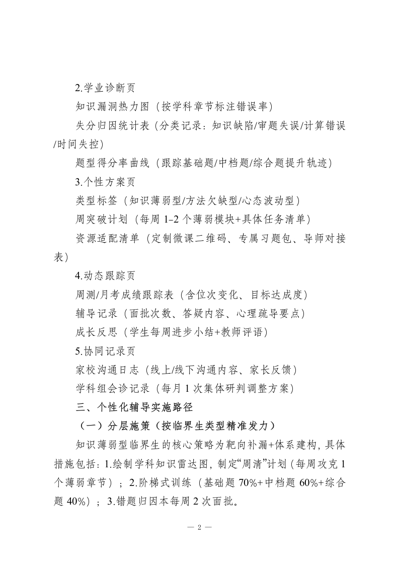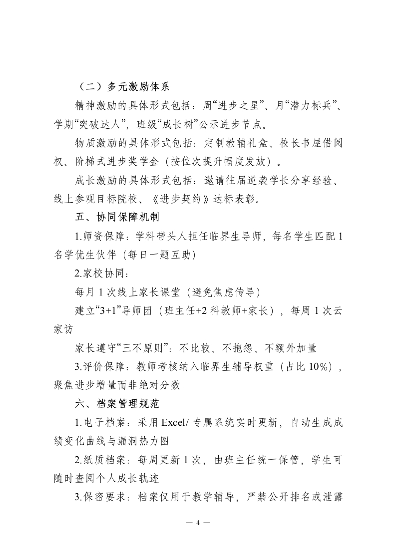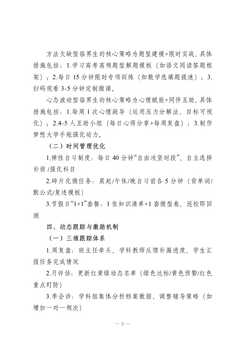 高三临界生“一生一档”精准培育实施方案一、方案目标1.精准定位临界生(成绩距本科线/重点线±20-30分区间)的知识漏洞、方法缺陷与心理卡点2.实现一人一策个性化辅导,80%临界生达成“保底线稳进、冲刺线上探”目标3构建教师-学生-家长-学科组协同生态,形成可持续的临界生转化机制二、临界生识别与档案建立(一)精准识别三维标准学业维度的识别指标包括:近3次模考成绩波动曲线、学科均衡度(偏科差值≥15分)、中档题得分率(低于60%)。行为维度的识别指标包括:课堂专注度、作业订正及时性、错题重复率、主动提问频次。心理维度的识别指标包括:压力自评指数(≥7分10分)、成绩波动引发的情绪变化、目标清晰度。(二)档案核心模块(一生一档电子+纸质双档案)1.基础信息页学生基本信息(性格特征、生物钟类型、家庭支持情况)目标契约书(保底/冲刺/梦想三线目标+签名确认,班主任/家长见证)一1