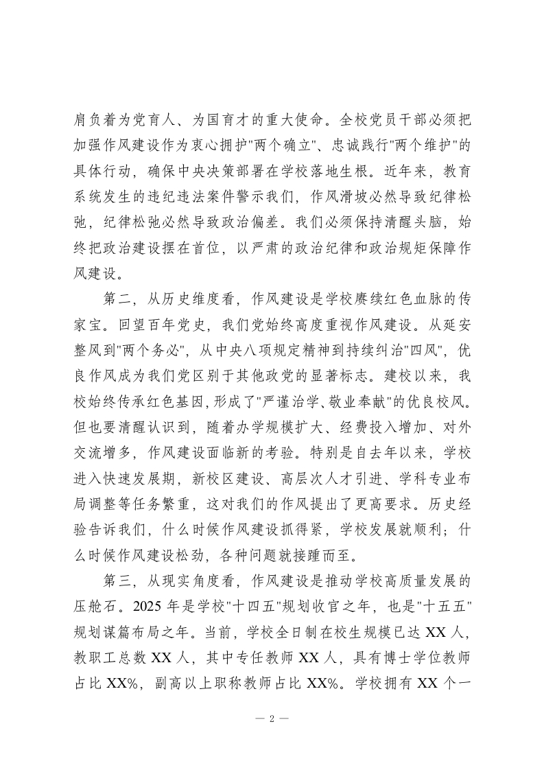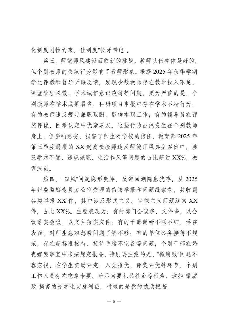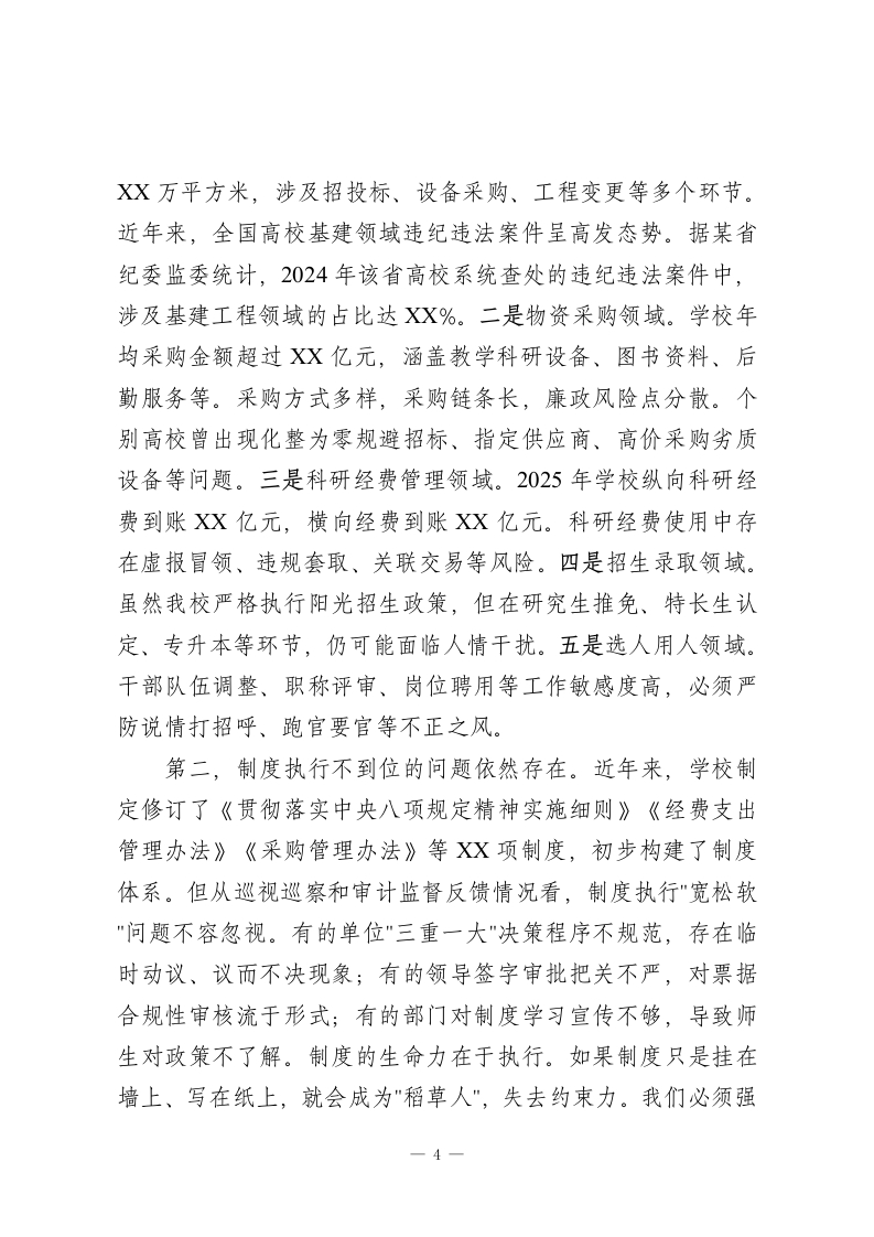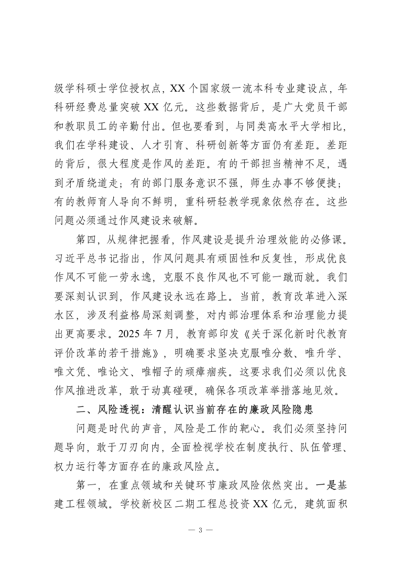高校党委书记讲授廉政专题党课讲稿:作风建设谋实效聚力发展创新局同志们:今天,我们在这里召开廉政专题党课,主题是"作风建设谋实效聚力发展创新局”。这既是一次深入学习贯彻党的二十届四中全会精神、中央纪委四次全会精神的具体行动,更是我校在新发展阶段筑牢廉政防线、夯实发展根基的必然要求。当前,学校正处于加快建设高水平应用型大学的关键时期,作风建设直接关系到办学方向、育人质量和发展成效。我们必须从政治高度深刻认识加强作风建设的极端重要性和现实紧迫性,以优良作风为学校事业高质量发展保驾护航。下面,我从"时代叩问、风险透视、清廉育人、共赴新程”四个维度,与大家共同学习交流。一、时代叩问:深刻把握新时代作风建设的内涵要求作风建设是党的建设的永恒课题。习近平总书记强调,党的作风就是党的形象,关系人心向背,关系党的生死存亡。新时代新征程,我们必须准确把握作风建设的政治内涵和实践要求。第一,从政治高度看,作风建设是践行"两个维护"的试金石。党的二十届四中全会明确指出,要健全全面从严治党体系,推进作风建设常态化长效化。这为我们指明了方向。作风问题本质上是党性问题,是政治问题。高校作为意识形态前沿阵地,-1