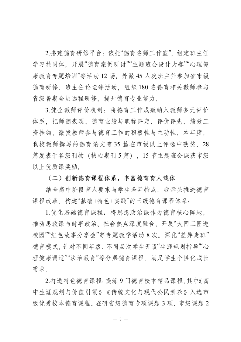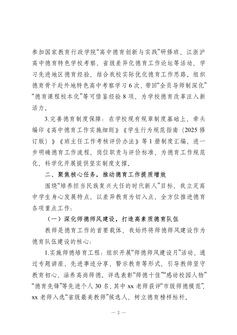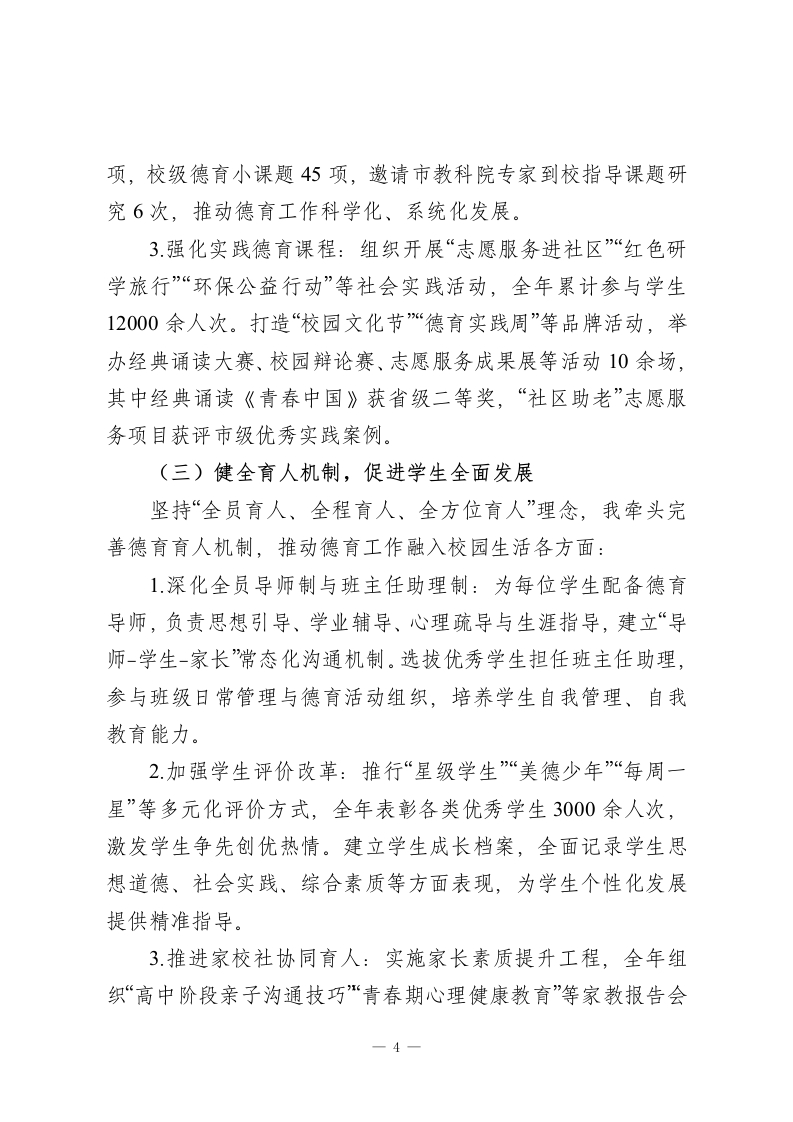 高中德育校长2025年度述职述廉报告:深耕德育阵地,创新育人路径,筑牢学生成长根基2025年,在教育局的正确领导下,在学校党总支的统筹引领下,在全体师生的协同发力下,我始终坚守“立德树人”根本任务,以高中德育工作为核心职责,立足学校“差异教育”办学特色,秉持“科研引领、创新驱动、家校联动”的德育工作策略,深耕德育课程建设、学生素养培育、师德师风塑造等关键领域,推动学校德育工作实现突破性进展,学生思想道德素质、综合素养显著提升,德育工作社会认可度与家长满意度持续提高。现将本年度工作情况汇报如下,请各位领导、同仁批评指正。一、强化理论武装,筑牢德育工作思想根基作为高中德育校长,我深知思想引领是德育工作的灵魂。一年来,我始终将思想政治建设摆在首位,以理论学习为抓手,凝聚德育工作共识:1.深化政策理论学习:深入学习贯彻党的二十大及二十届历次全会精神、习近平总书记关于教育的重要论述,聚焦高中德育改革新要求,先后组织召开“师德师风专项整治”“新时代高中生价值引领”“差异德育实施路径”等4次专题会议,推动全体德育工作者统一思想、明确方向,将“为党育人、为国育才”的使命融入德育工作全过程。2.拓宽德育工作视野:积极参与高水平德育研修活动,先后1