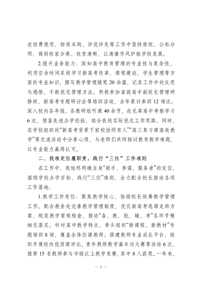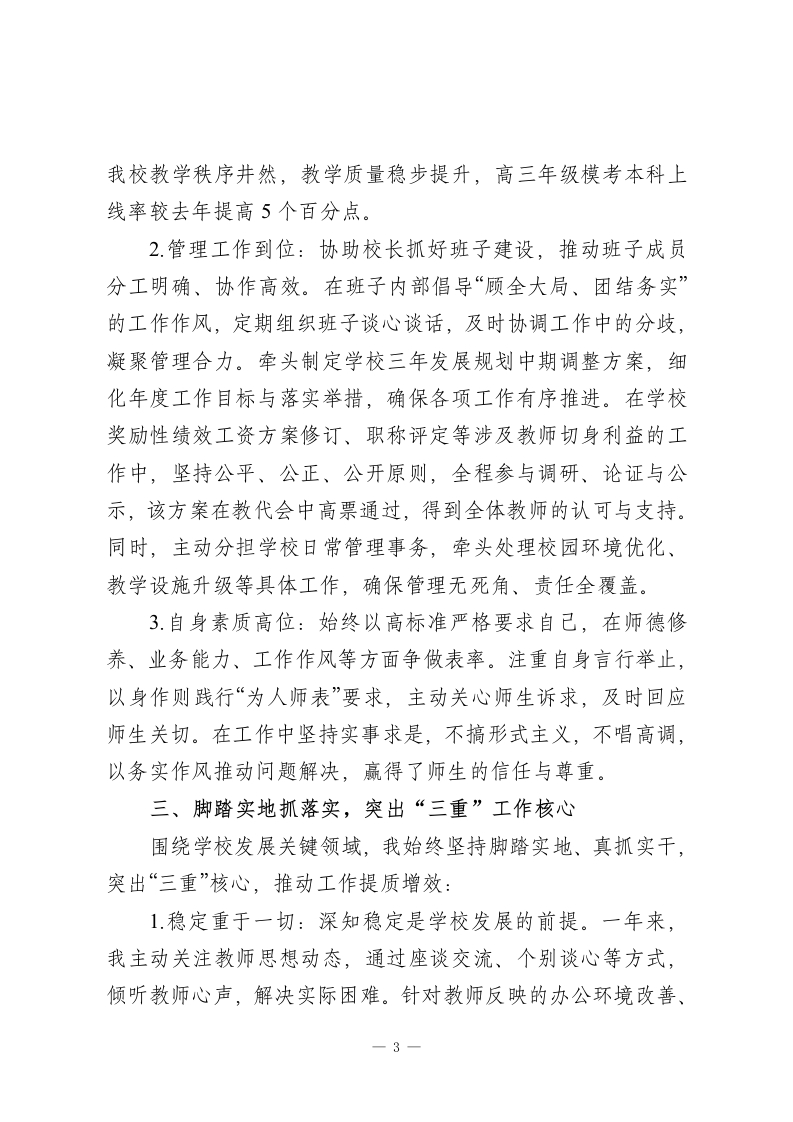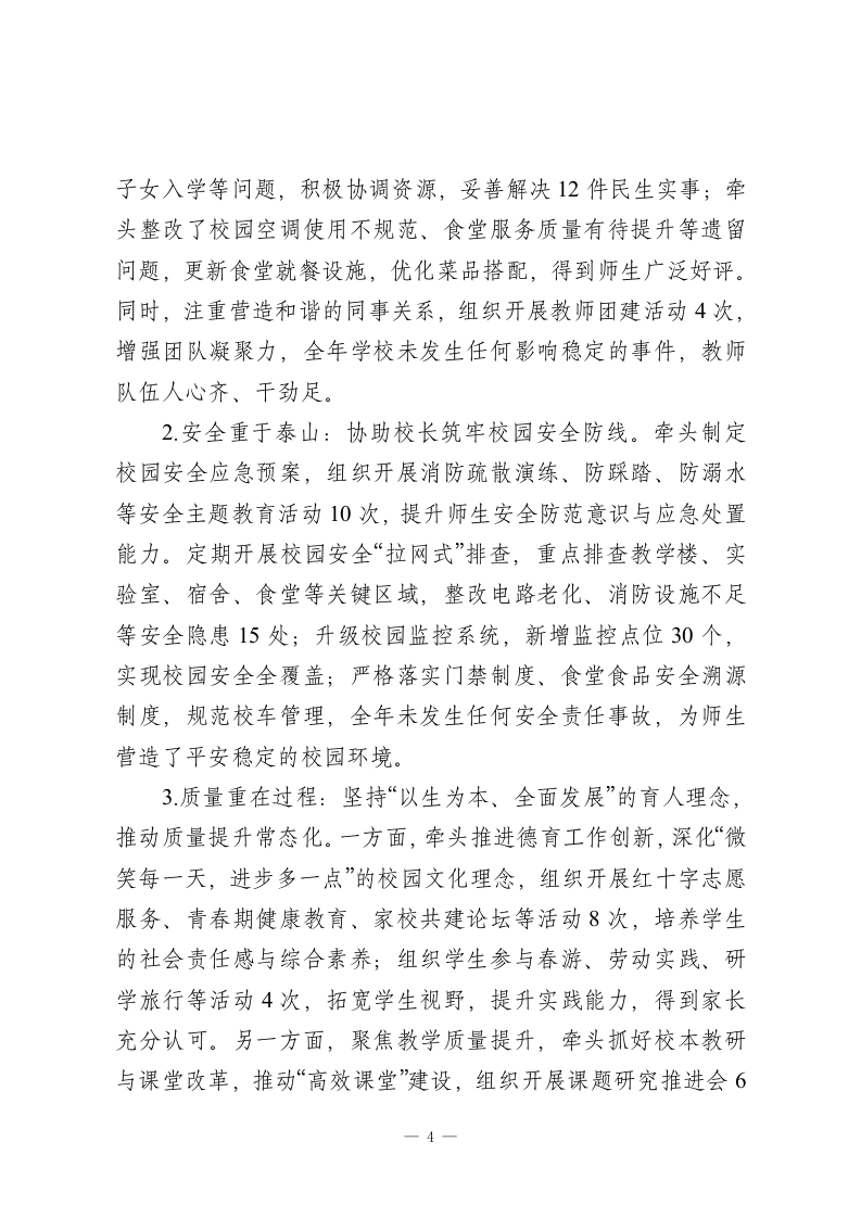 高中副校长2025年度述职报告:履职尽责践初心,凝心聚力促发展尊敬的各位领导、各位老师:大家好!2025年已圆满收官,回望这一年的工作历程,在教育局的正确领导下,在校长的统筹引领下,在班子成员的协作支持下,在全体教职工的并肩奋斗中,我始终坚守“做真人、做真事、尽真责”的初心,立足副校长岗位职责,聚焦学校发展大局,为教师专业成长搭台、为学生终身发展筑基、为学校持续进步赋能,在履职实践中收获了团队协作的温暖与事业成长的喜悦。现将本年度工作情况汇报如下,恳请各位批评指正。一、勤学善思强素养,坚守“三清”立身之本作为学校管理团队的一员,我深知自身素质直接影响履职效能。一年来,我始终将学习作为立身之本、成事之基,持续提升思想境界与业务能力:1.筑牢思想根基:深入学习党的教育方针、新时代教育理念及高中教育改革政策,主动参与各类政治理论学习与师德师风建设活动,坚定教育初心,牢记育人使命。在工作中坚守“三清”准则:清高不随波逐流,始终坚守教育底线,聚焦主责主业,不做与教育教学无关的表面文章;清爽有激情,始终保持饱满的工作热情,以积极心态面对各项任务,不推诿、不拖沓,高效推进工作落实;清廉不糊涂,严格恪守廉洁自律各项规定,1