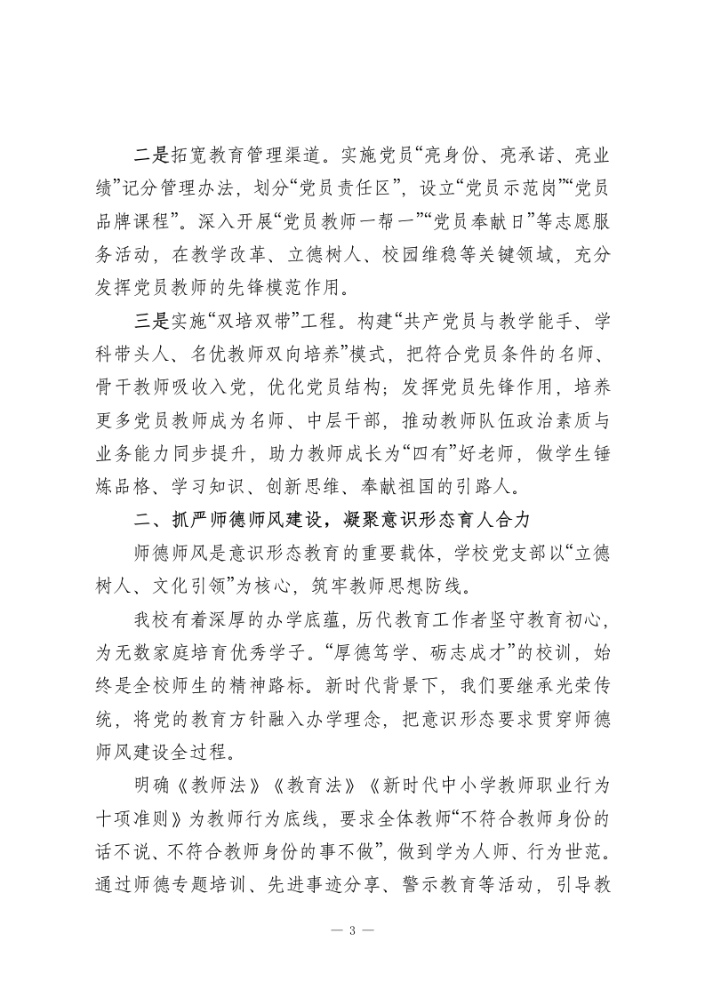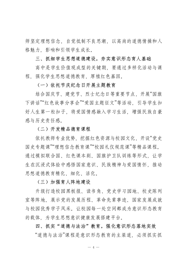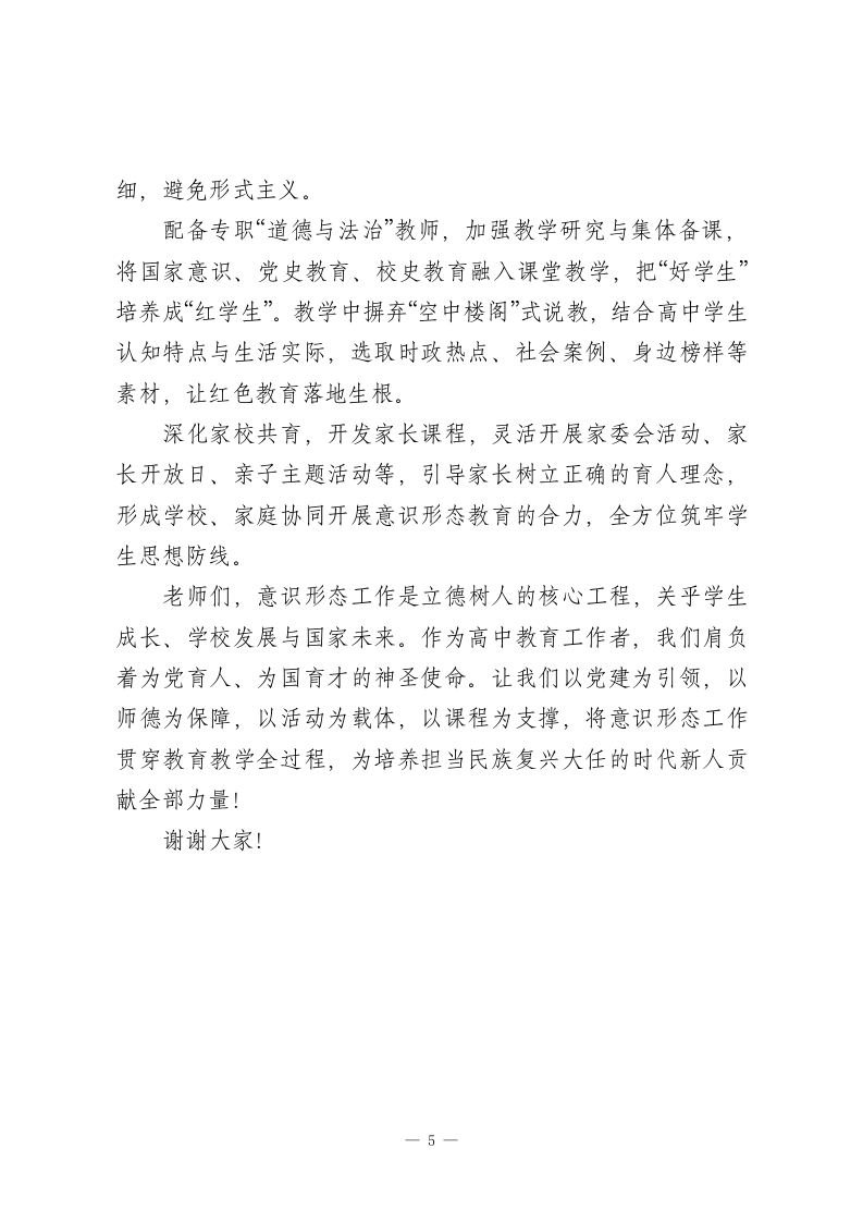 高中校长意识形态专题党课:强化思想引领,落实立德树人根本任务各位领导、老师们:非常荣幸能与大家围绕“加强意识形态工作、落实立德树人任务”这一核心主题交流探讨。建设一所优质高中,最根本的遵循就是认真落实党的教育方针,坚定不移执行党的教育路线,在坚定学生理想信念、厚植爱国主义情怀、加强品德修养、增长知识见识、提升综合素质上下功夫,培养德智体美劳全面发展的社会主义建设者和接班人,造就能够担当民族复兴大任的时代新人。结合高中教育特点与学校实际,我从四个方面分享具体思路:一、抓实党建工作,筑牢意识形态引领根基学校党组织是意识形态工作的核心阵地,必须通过党建引领,将意识形态正面引导贯穿教育教学全过程。(一)党建+基层组织建设,强化组织保障学校党支部切实履行意识形态工作主体责任,严格落实党建工作责任制,明确党支部书记第一责任人职责,形成“书记亲自抓、班子分工负责、年级部与教研组协同落实”的工作格局。党建工作与教育教学同部署、同落实、同考核,实现管业务与抓党建两不误、两促进。推进党建基础设施规范化建设,升级改造党员活动室,配齐党员电教设备与学习资料,保障党性教育经费与活动场所到1
