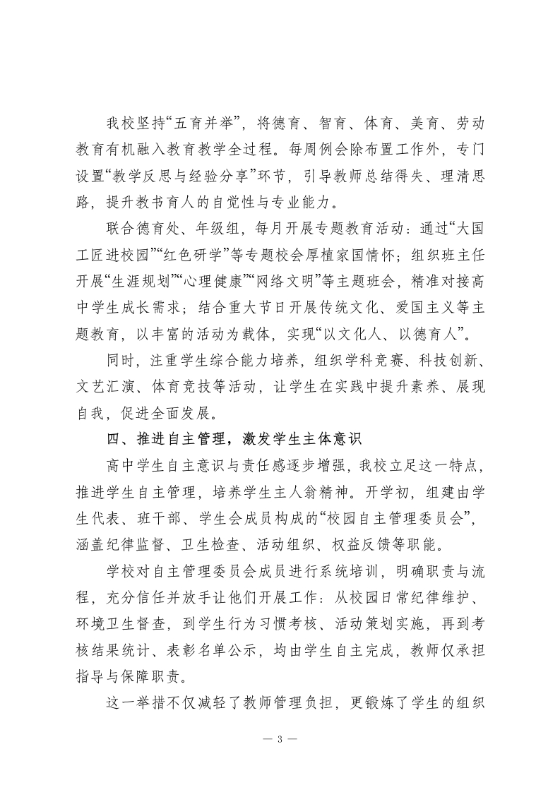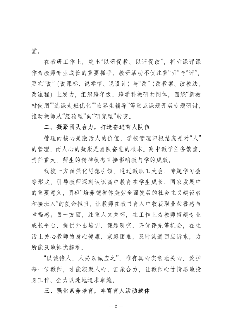 高中校长在2025年度高中教育教学管理工作交流会上的发言尊敬的各位领导、各位同仁:大家下午好!光阴似箭,时序更替,2025学年已近尾声。xx高中在上一学年取得了阶段性成效,这离不开上级领导的悉心指导、学校班子的团结协作、全体师生的奋力拼搏以及广大家长的鼎力支持。今天,借此次交流契机,我梳理我校教育教学管理的实践与思考,也希望通过与兄弟学校的交流,找准差距、补齐短板,谋求更高质量发展。现将我校的一些做法与大家分享,不当之处恳请批评指正。一、深耕教学常规,激活校本教研效能学校的核心任务是立德树人,而教学工作是落实这一任务的核心载体,课堂则是育人的主阵地。我校始终坚持“常规为基、教研为翼”,推动教学质量稳步提升。领导班子带头深耕一线,坚持“课前到班巡查、课时推门听课、课间师生座谈、课后校园走访”的工作机制,及时发现教学亮点并推广,排查问题并督促整改。通过常态化的细节管理,持续优化校风、教风和学风。在常规管理上,严格落实“备、教、辅、批、考、评”全流程规范,重点聚焦新高考背景下的课堂效率提升,要求教师精准把握课标、学情与考情,打造“高效、互动、探究”的优质课1
