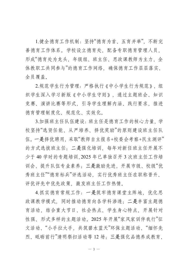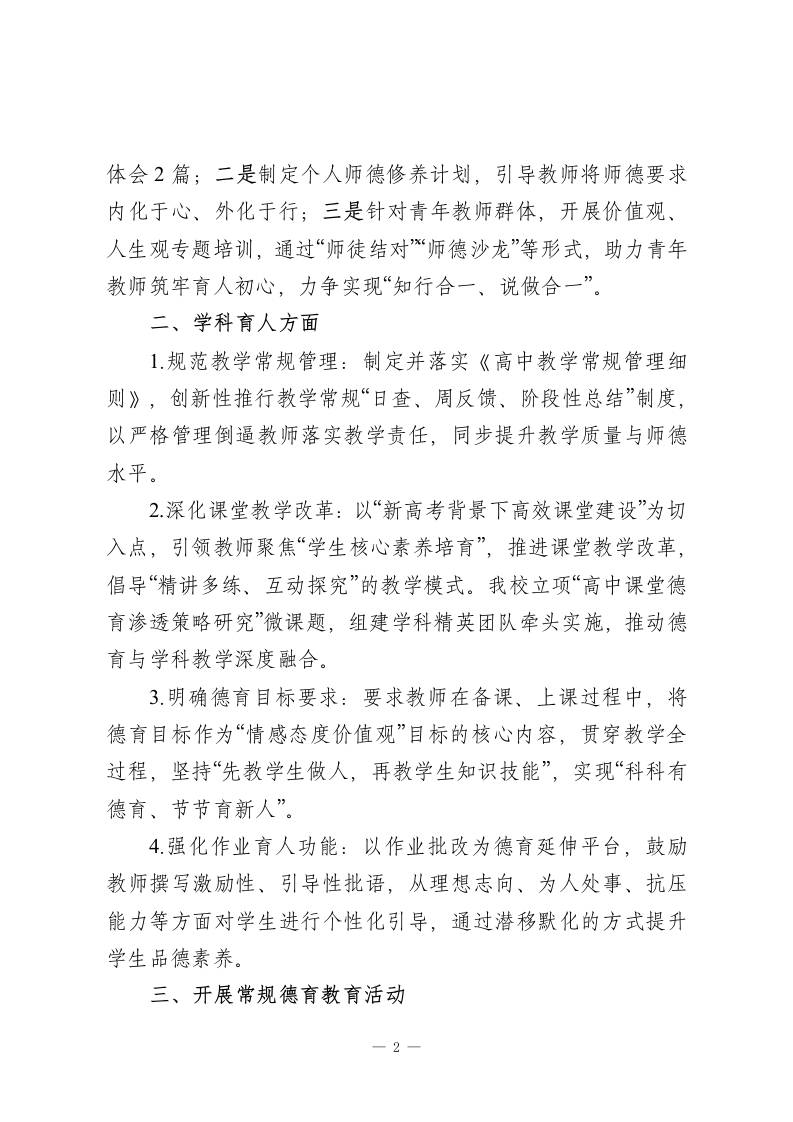 高中学校2025年度德育工作调研汇报各位领导:根据上级教育主管部门《关于开展中小学德育工作调研的通知》要求,结合我校高中阶段德育工作实际开展情况,从德育队伍建设、学科育人、常规德育活动、养成教育、文化育人、活动育人课程建设及家庭教育七个方面进行系统梳理,现将调研情况汇报如下:一、德育队伍建设方面1.健全组织领导体系:学校成立以校长为组长、党支部书记为副组长、德育副校长牵头负责的师德建设领导小组,明确职责分工,建章立制、统筹推进师德建设各项工作,形成“校长统筹、支部引领、德育处落实、全员参与”的德育工作格局。2.完善考核激励机制:逐步建立健全师德师风激励、考核、监督三位一体机制,突出教书育人实绩,将职业道德状况、教学态度、育人效果作为核心考核指标,与教师职务评聘、评优评先、绩效工资直接挂钩。修订并通过《xx高中师德考核办法(2025版)》,实现师德考核“有章可依、公平公正”,得到全体教师一致认可。3.强化德育培训实践:组织教师常态化开展德育专题教育活动,营造良好师德氛围。一是深化理论学习,组织教师深入学习党的二十大报告、习近平总书记关于教育的重要论述及先进师德事迹,要求每位教师撰写学习笔记不少于5000字、心得1
