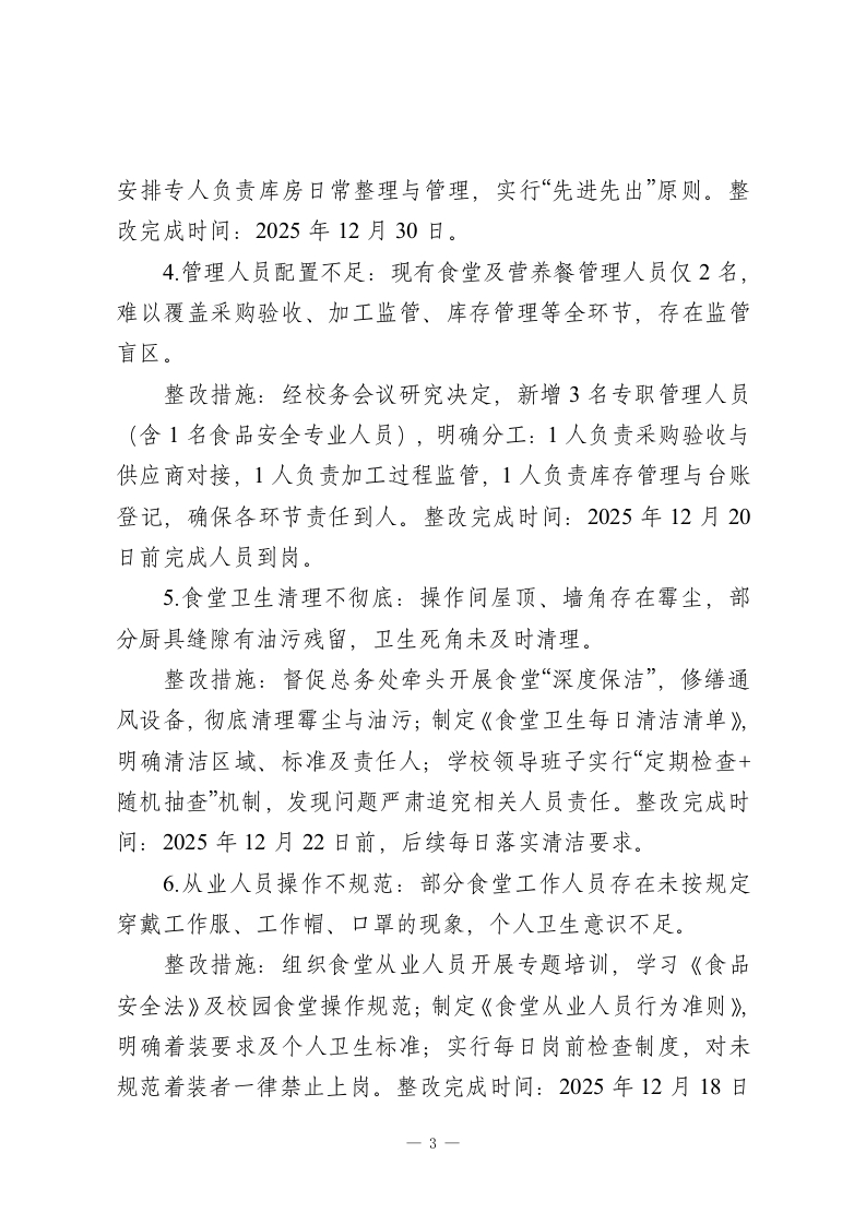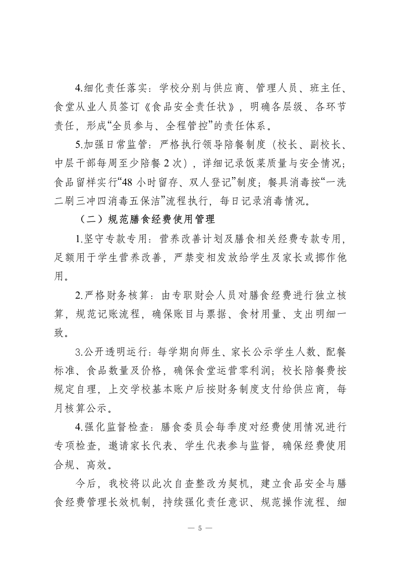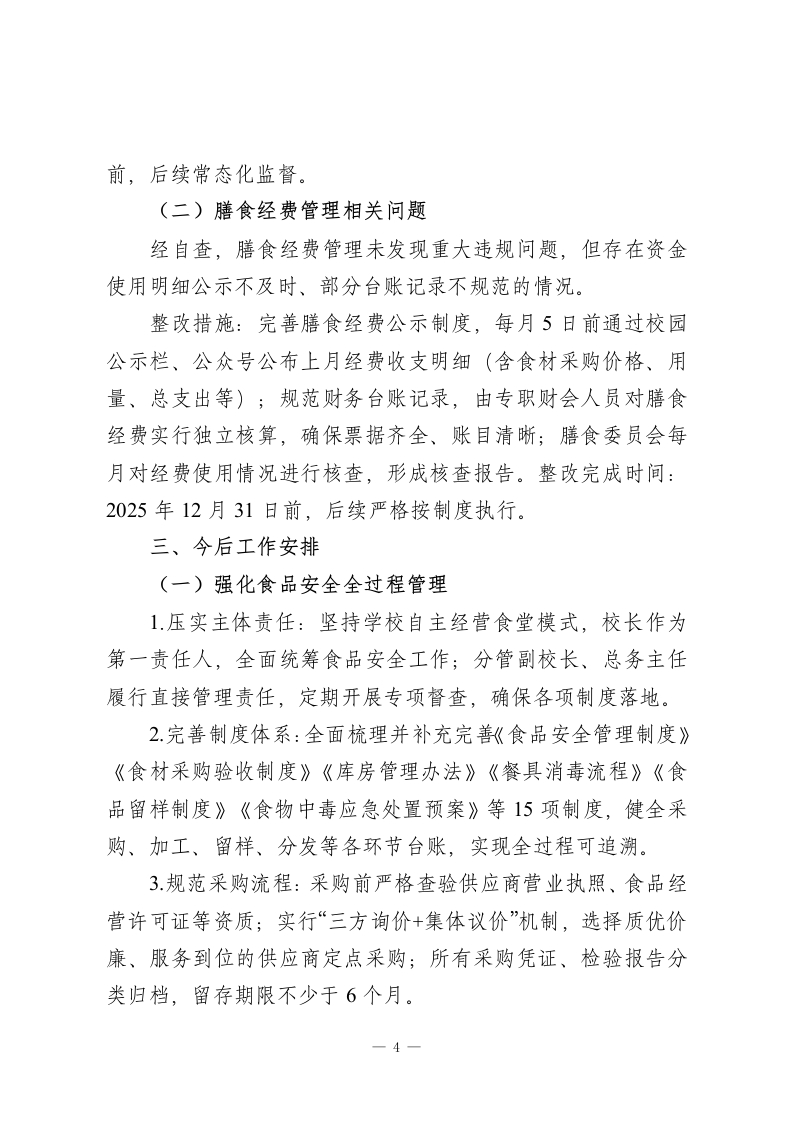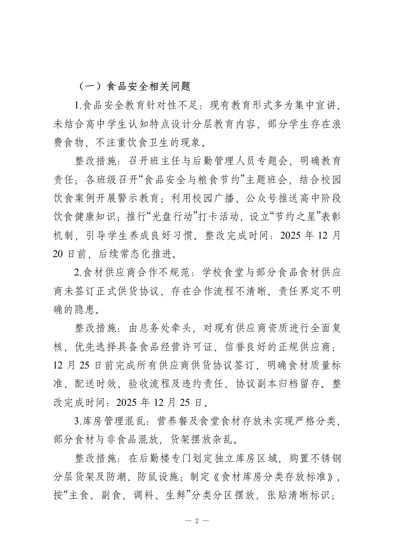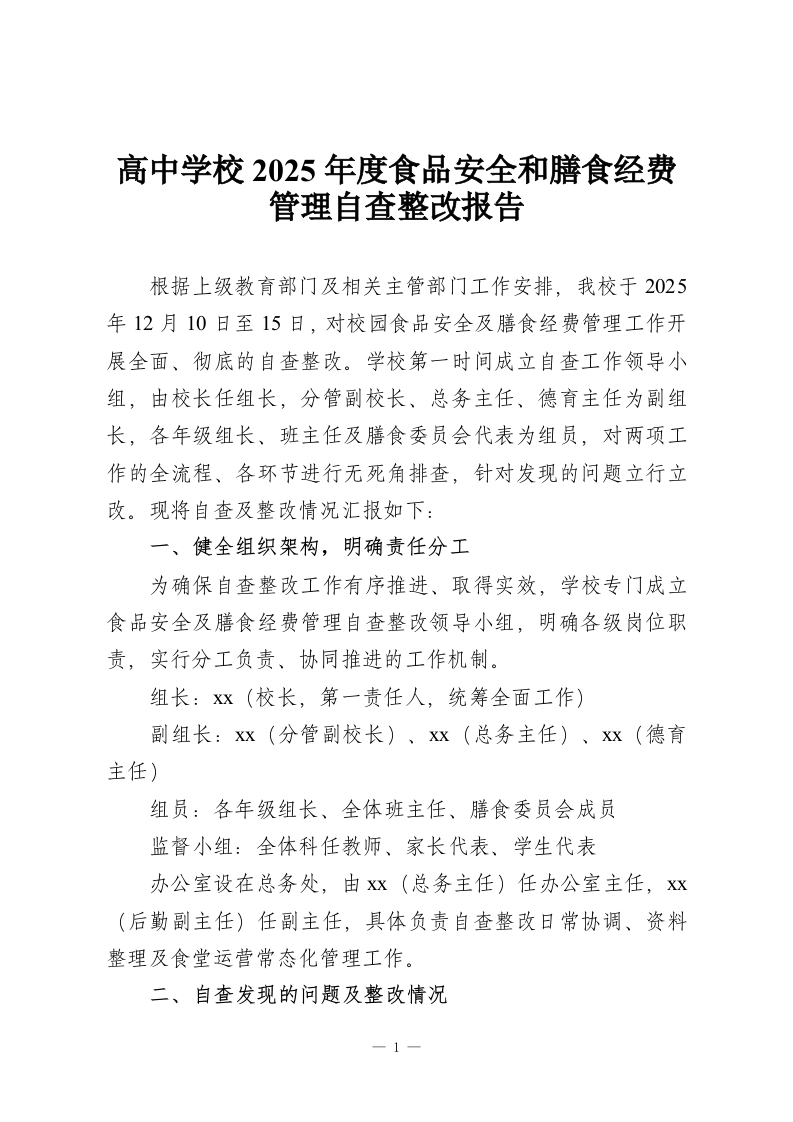 高中学校2025年度食品安全和膳食经费管理自查整改报告根据上级教育部门及相关主管部门工作安排,我校于2025年12月10日至15日,对校园食品安全及膳食经费管理工作开展全面、彻底的自查整改。学校第一时间成立自查工作领导小组,由校长任组长,分管副校长、总务主任、德育主任为副组长,各年级组长、班主任及膳食委员会代表为组员,对两项工作的全流程、各环节进行无死角排查,针对发现的问题立行立改。现将自查及整改情况汇报如下:一、健全组织架构,明确责任分工为确保自查整改工作有序推进、取得实效,学校专门成立食品安全及膳食经费管理自查整改领导小组,明确各级岗位职责,实行分工负责、协同推进的工作机制。组长:xx(校长,第一责任人,统筹全面工作)副组长:Xx(分管副校长)、x(总务主任)、xx(德育主任)组员:各年级组长、全体班主任、膳食委员会成员监督小组:全体科任教师、家长代表、学生代表办公室设在总务处,由x(总务主任)任办公室主任,x(后勤副主任)任副主任,具体负责自查整改日常协调、资料整理及食堂运营常态化管理工作。二、自查发现的问题及整改情况一1
