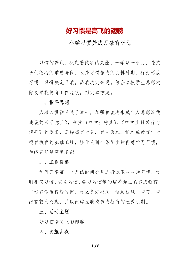 好习惯是高飞的翅膀一一小学习惯养成月教育计划习惯的养成,决定着做事的效能。开学第一个月,是孩子们收心的重要阶段,也是习惯养成的关键时期。行为形成习惯,习惯决定品质,品质决定命运。结合本校学生思想实际及学校德育工作现状,拟定本方案。一、指导思想为深入贯彻《关于进一步加强和改进未成年人思想道德建设的若干意见》,落实《中学生守则》、《中学生日常行为规范》的要求,坚持德育为首,育人为本,把养成教育作为德育教育的基础工程,强化巩固全体学生的良好学习习惯,为终身发展奠定基础。二、工作目标利用开学第一个月的时间分别进行以卫生生活习惯、文明礼仪习惯、安全习惯、学习习惯等的培养为主的养成教育,以培养学生良好习惯,树立良好校风,做到校风、校容、校纪有较大改观,并以此建立我校养成教育的长效机制。三、活动主题好习惯是高飞的翅膀四、实施步骤1/8