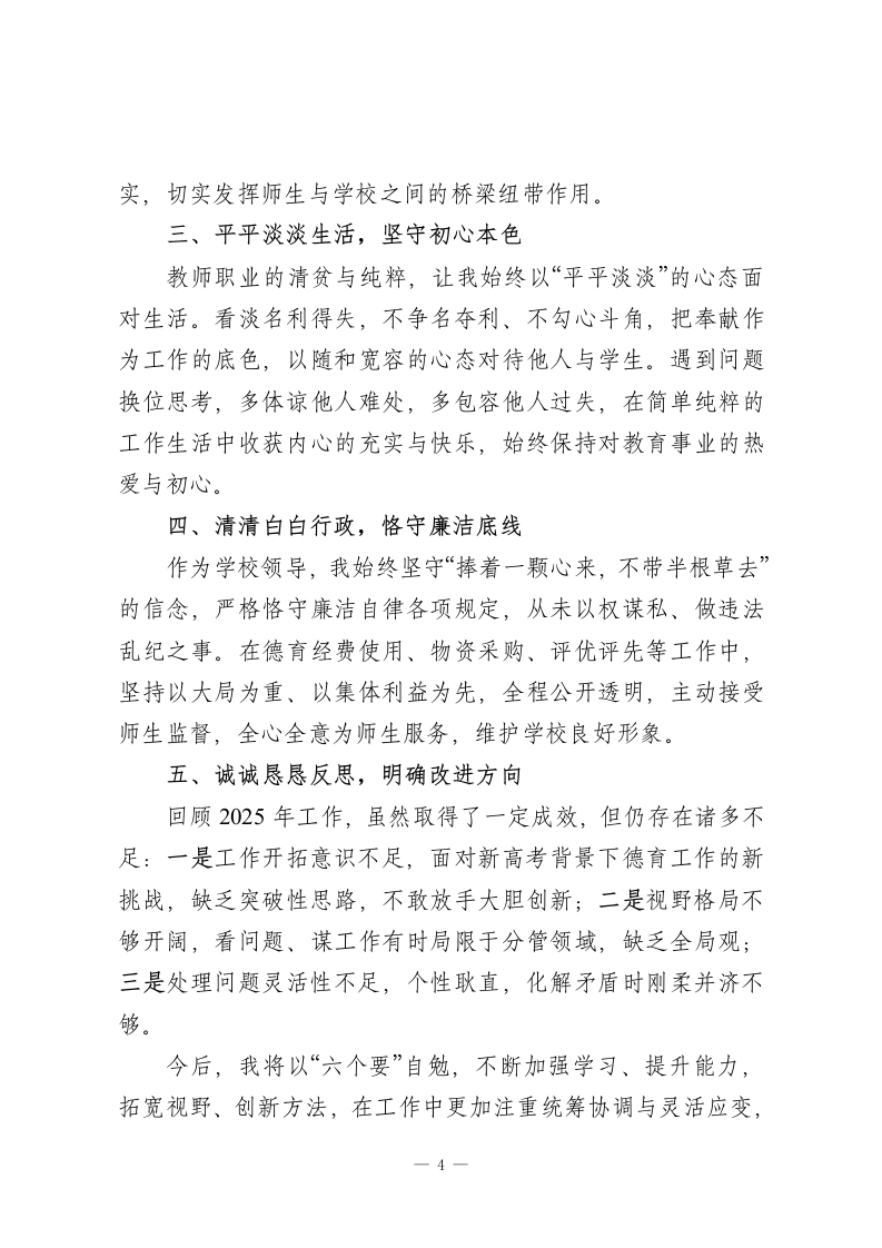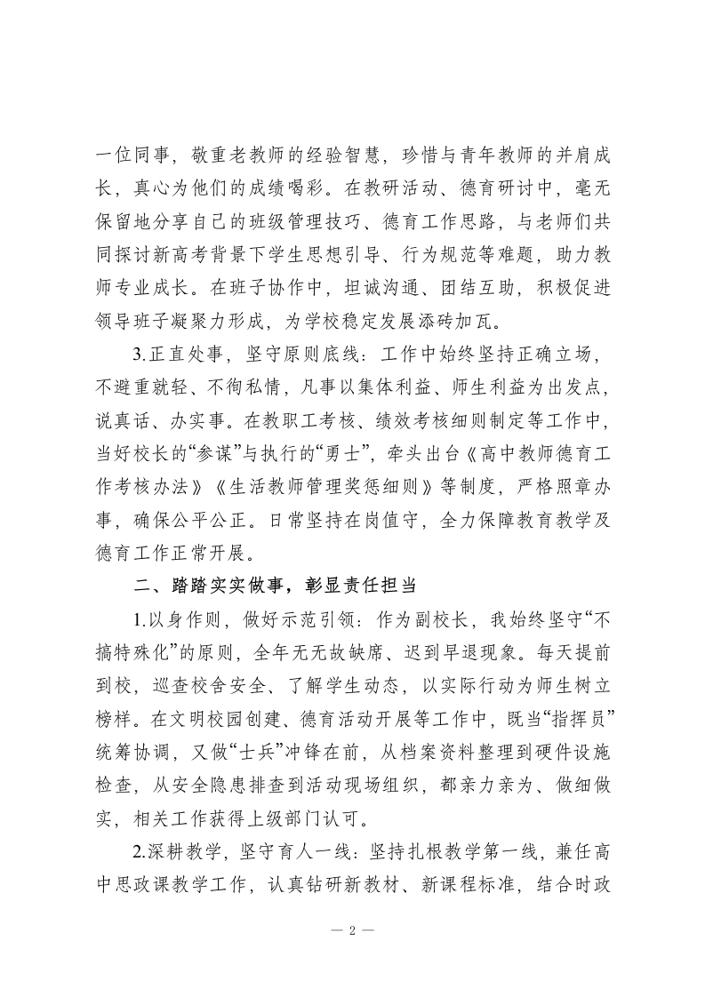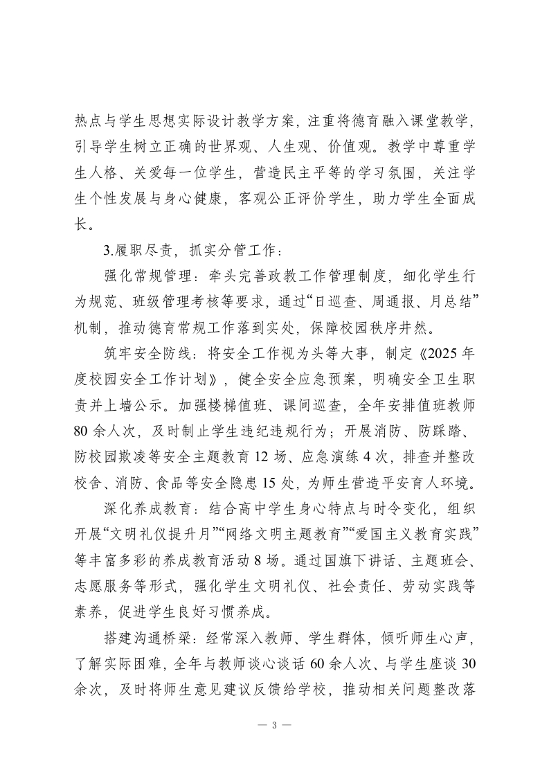 高中政教副校长2025年度述职报告:守责践德育新人,凝心聚力促发展各位领导、老师们:大家好!2025年已圆满收官,作为分管学校政教工作的副校长,我始终秉持“做人要讲德,做事要讲责,学校要发展,师生要关心,学习要坚持,心胸要宽广”的工作信条,在上级教育部门的指导下,在校长的统筹带领下,在班子成员的协作支持下,在全体教职工的热情帮扶下,稳步推进德育管理、学生发展、安全稳定等各项工作,基本完成了年度分管任务。一年来,我既欣慰于身处团结和谐、充满温情的集体,更惭愧于自身能力有限,为大家、为学校付出尚显不足。现将本年度工作从以下几个方面汇报如下,恳请各位批评指正。一、老老实实做人,筑牢履职根基1勤学善思,坚定政治立场:深知政教工作事关学生成长、校园稳定,我始终在政治思想上严格要求自己,深入学习党的二十大精神、习近平总书记关于教育的重要论述及高中德育工作新政策,不断提升政治理论素养。在思想作风上实事求是、表里如一,工作作风上认真严谨、讲求实效,始终以“为党育人、为国育才”的使命担当投入工作,努力在言行举止、师德修养上为师生做好表率。2.真诚待人,凝聚团队合力:我始终以真诚之心对待身边每1