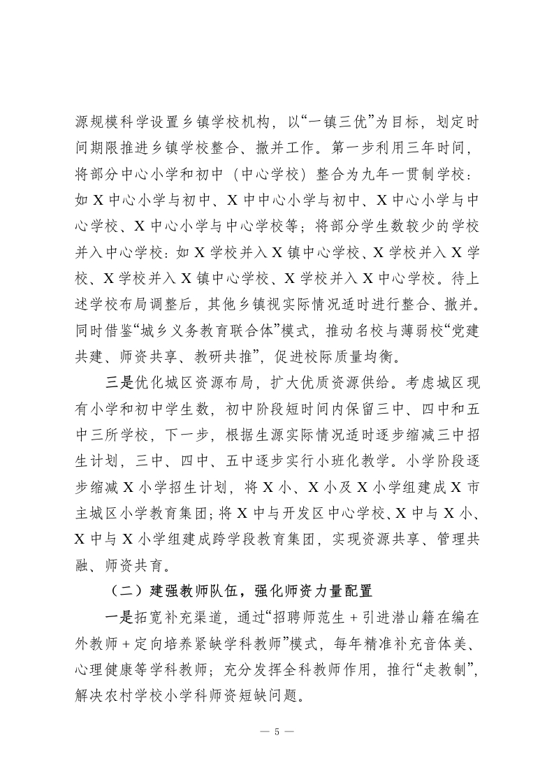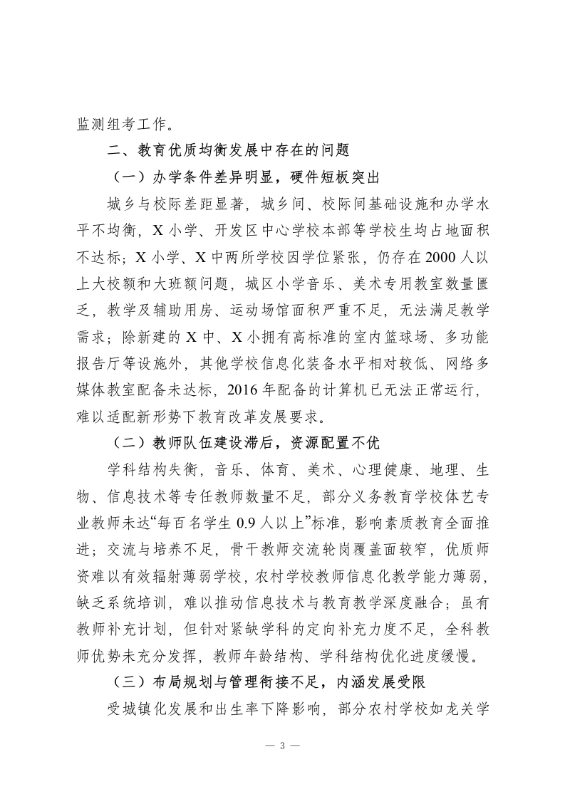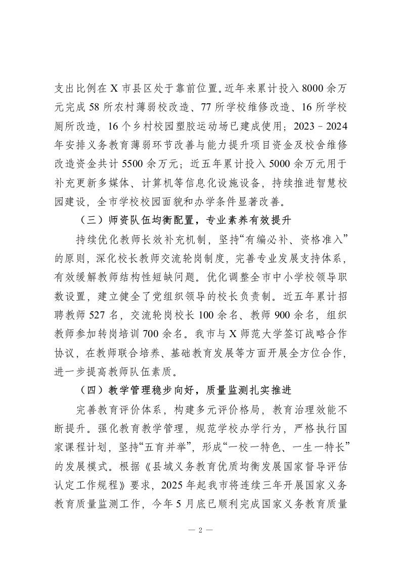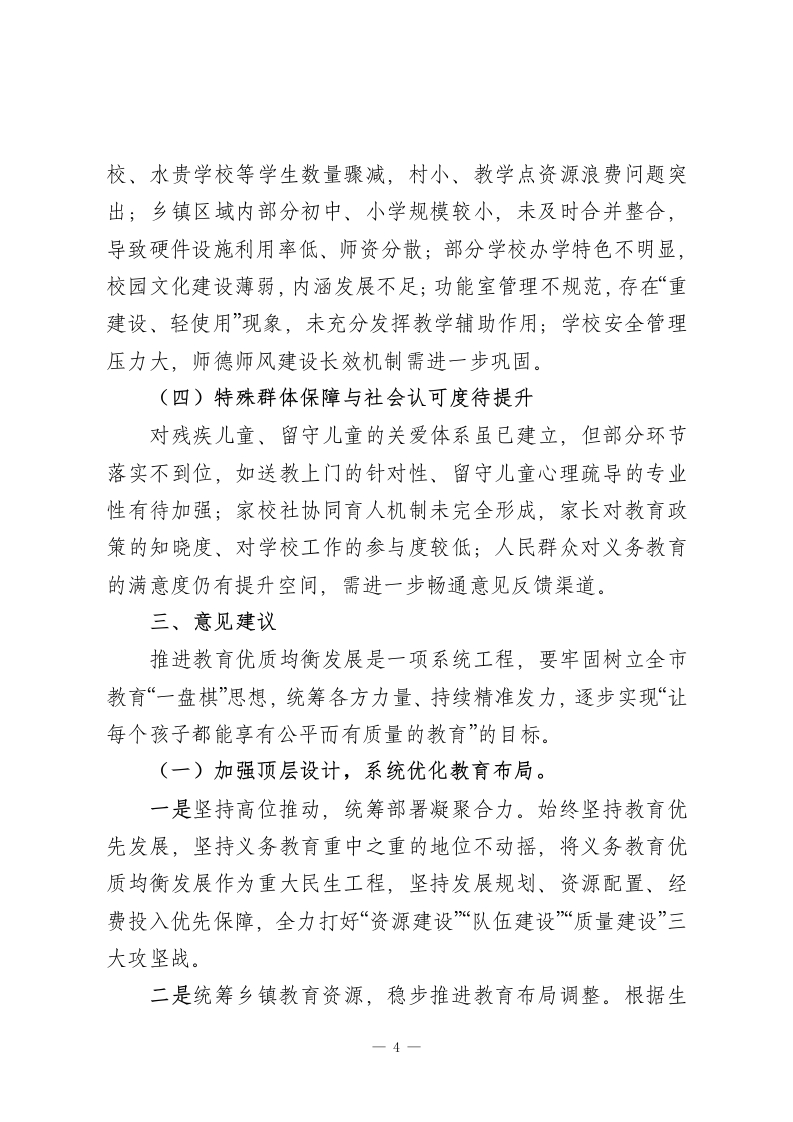 关于推进义务教育优质均衡发展的专题协商报告教科卫体委为全面掌握和了解我市义务教育优质均衡发展开展情况及现状,找准存在问题、明确改进方向,市政协教科卫体委组织委员围绕“推进教育优质均衡发展”开展专题调研,通过实地考察、召开座谈会等方式,深入了解工作推进情况,现将调研结果报告如下:一、我市义务教育优质均衡发展基本情况《教育强国建设规划纲要(2024一2035年)》指出要“办好必要的乡村小规模学校”,近年来,市委市政府坚持教育优先发展战略,统筹城乡义务教育布局,大力改善农村学校办学条件,在提升义务教育整体质量水平、促进优质教育资源城乡共享等方面做了大量扎实有效的工作。(一)学校布局持续优化,城区扩容与乡镇整合并进新建扩建X小学、X小学、X小学、X中、X小学,增加城区义务教育阶段学位供给,有效缓解城区学校学位紧张导致的“大班额”“大校额”问题。同时顺利完成X、X、X等乡镇6所中小学校撤并和资源整合工作,整合后义务教育布局更合理。(二)资金投入持续加大,硬件设施与教育装备并抓我市教育经费支出按照“两个只增不减”要求,逐年增加,2024年我市教育支出达到11.1亿元,占整个财政预算支出22%,1