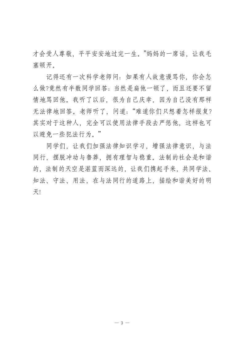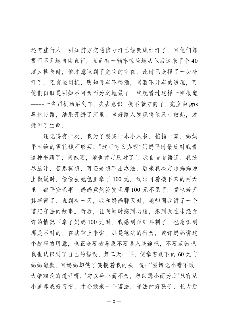 国家宪法日,校长在国旗下讲话让我们加强法律知识学习,增强法律意识,与法同行各位老师、各位同学,大家好!俗话说:国有国法,家有家规。是呀,法是治国之本。法将社会变得秩序井然,让我们安居乐业,把国家变成一个和平美好的地方。所以,生活离不开法。我们的日常生活、工作中都离不开法律。每个人都要养成学法、知法、用法、守法、护法的行为习惯。同时应该学会用法律来保护自己,使自己不受到伤害。法无处不在,但不要将它变成生活的负担,而要将它作为生活的准则来规范和约束自己的行为。从小到大,长辈们总会在我们身边教导:在学校,要遵守学校的规章制度;在家里,要遵守家里的规矩;而在社会中,更要遵守人民规则,而这个人民规则便是“遵纪守法”了。以前我一直以为法离我们相隔“十万八千里”,可直到现在,我才明白了:其实法一直都在我们身边。虽然我们非常遵守法,但是,在我们周围的人群中,总是有些人为了自己的利益而不遵守法律,比如在交通法规方面,人们违法的事情特别多,他们常常目无法律,显得很不在乎。有的人骑着小单车,为了贪求速度,竟骑上了人行横道,且偶尔还与机动车玩抢道竞技;1