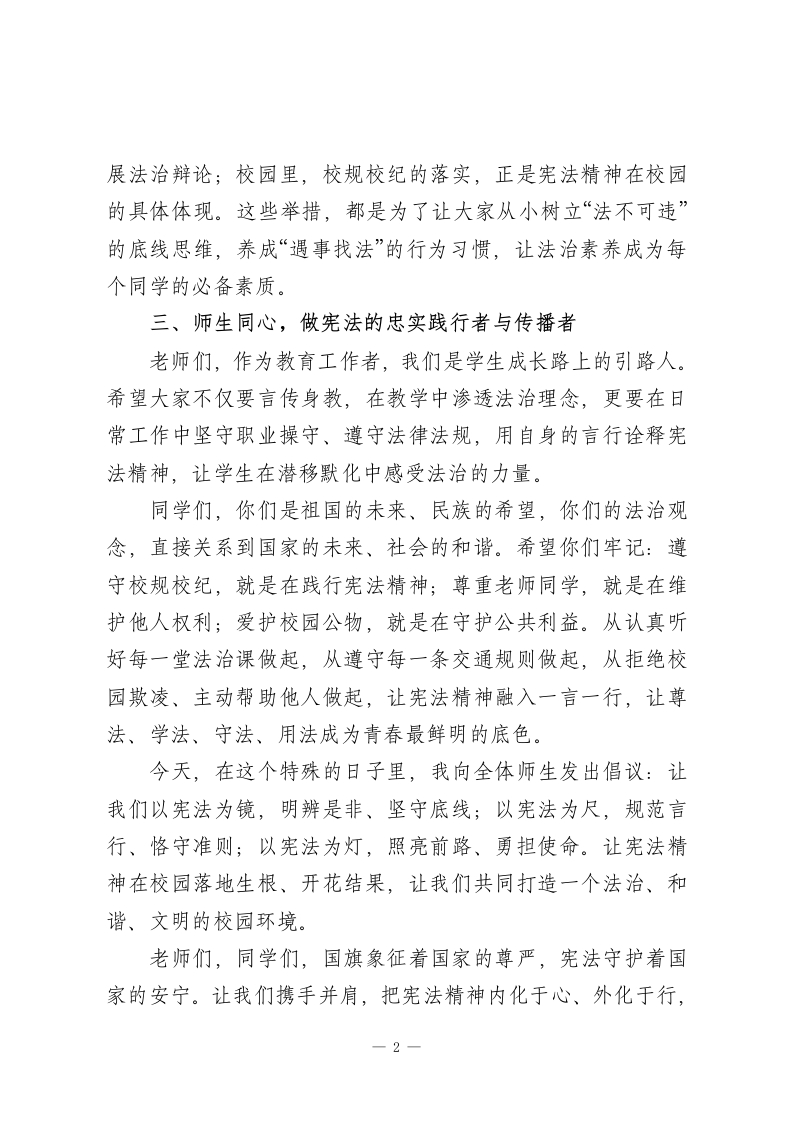 弘扬宪法精神,培育时代新人2025年12月4日国家宪法日校长国旗下讲话稿尊敬的各位老师,亲爱的同学们:大家早上好!迎着朝阳,国旗舒展;伴着清风,初心如磐。今天,我们再次齐聚这庄严的五星红旗下,共同迎接我国第十一个国家宪法日。作为校长,站在这里,我想和大家聊聊“宪法”这两个沉甸甸的字一一它不仅是治国安邦的总章程,更是我们每个人成长路上的“指南针”,是校园里立德树人的“根本遵循”。一、宪法是国家的根基,更是我们的“权利保障书”宪法看似宏大,却与每个人的生活息息相关。从我们出生起,它就赋予了我们平等的生命权、发展权;走进校园,它保障我们享有受教育的权利,让我们能在课堂上汲取知识、在校园里自由成长;走出校门,它守护我们的人格尊严、财产安全,让我们在法治的阳光下安心生活。它不是冰冷的条文,而是温暖的守护,是国家对每个公民最坚实的承诺,更是我们安身立命的根本保障。二、学校是法治教育的阵地,培育法治素养是育人的核心“国无常强,无常弱。奉法者强则国强,奉法者弱则国弱。”教育的本质,不仅是传授知识,更是培育健全的人格、塑造合格的公民。多年来,我们学校始终把法治教育融入日常教学:课堂上,老师讲解法律常识;主题活动中,我们模拟法庭、开1