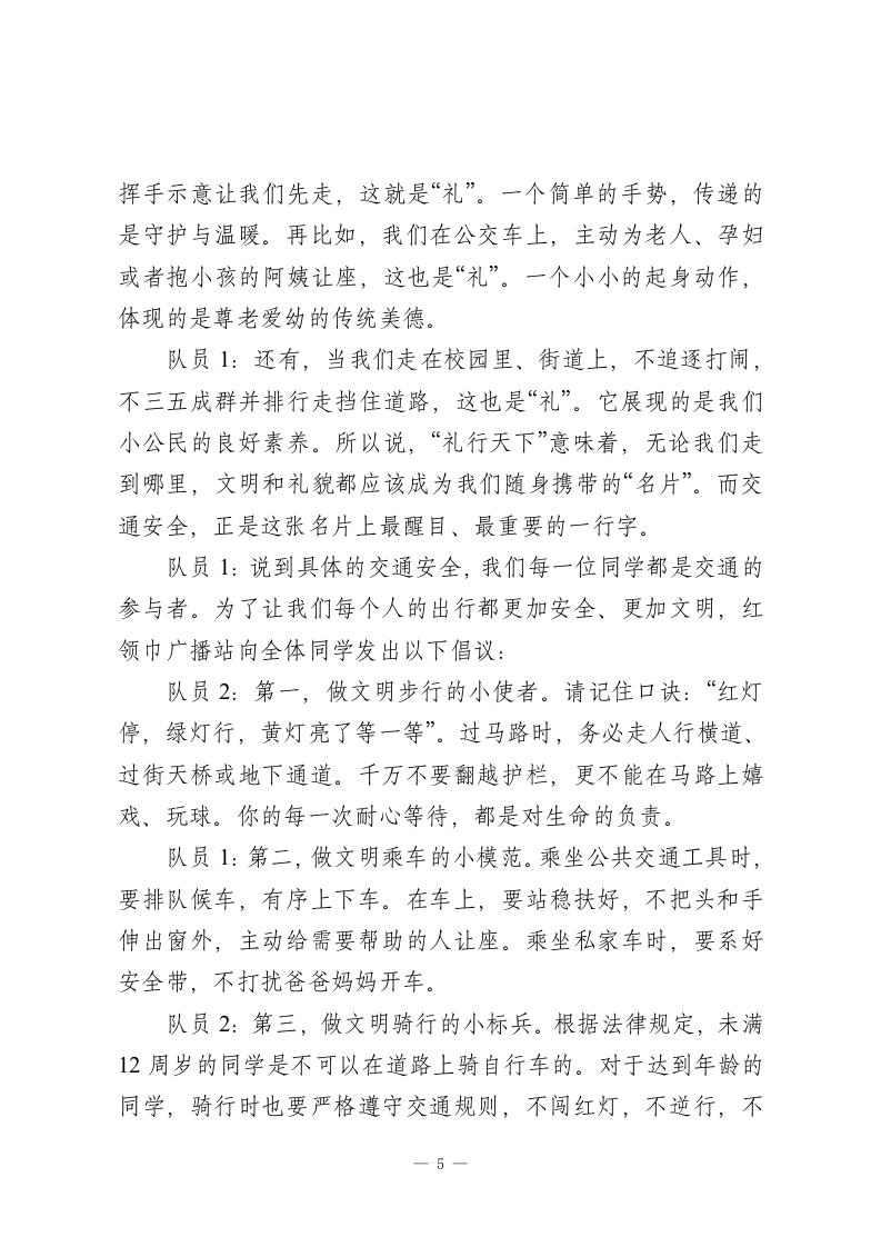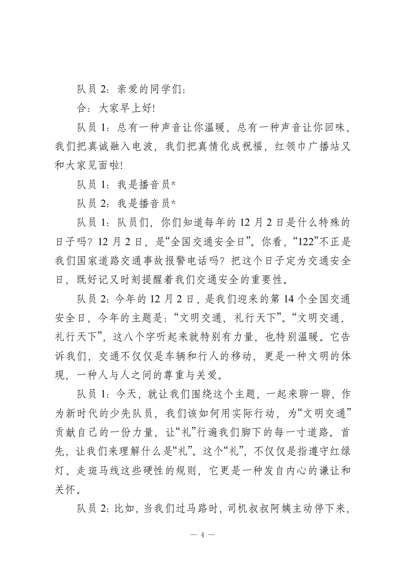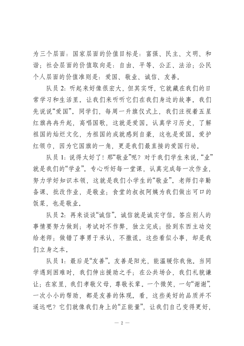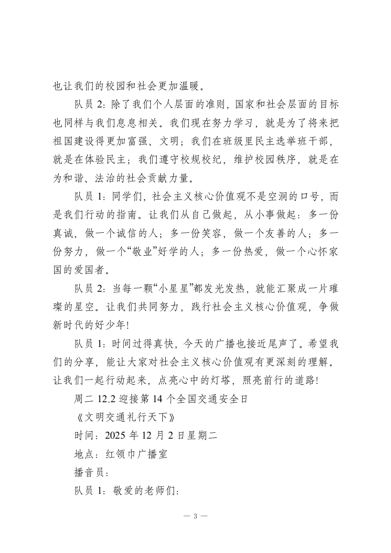 红领巾广播站2025年秋季学期第14周广播稿(12.1-12.5)周一12.1践行社会主义核心价值观《争做闪闪“小红星”》时间:2025年12月1日星期一地点:红领巾广播室播音员:队员1:敬爱的老师们:队员2:亲爱的同学们:合:大家早上好!队员2:唤醒你的耳朵,触摸你的心灵,用电波传递温暖,用声音传播正能量,红领巾广播站与你相约。让我们一起在广播中绽放光彩,书写美好校园篇章。队员1:我是播音员*队员2:我是播音员*队员1:在我们的校园里,在电视新闻中,我们常常听到一个词一一“社会主义核心价值观”。它就像一座明亮的灯塔,指引着我们国家前进的方向。队员2:没错,它也像一颗颗闪闪发光的种子,播种在我们每个人的心田。今天,就让我们一起走近这24个字,了解它的深刻含义,看看我们少先队员该如何去践行它。队员1:首先,让我们一起来重温这24个字的箴言,它分1