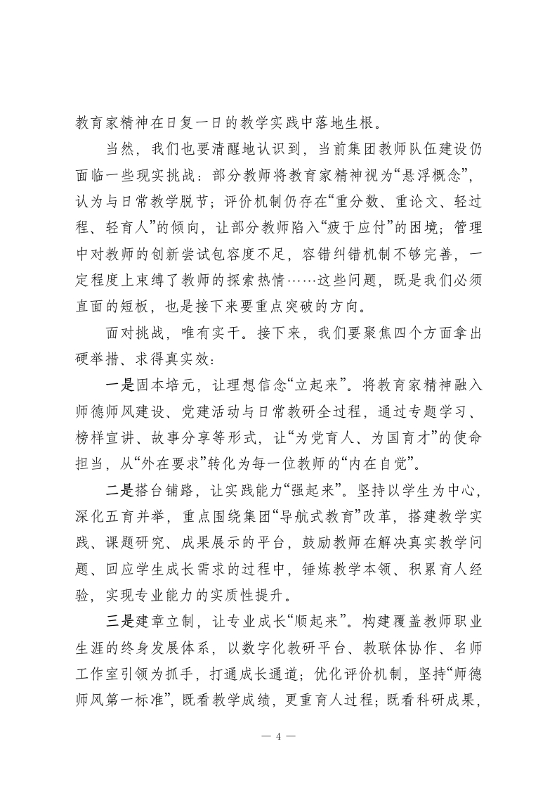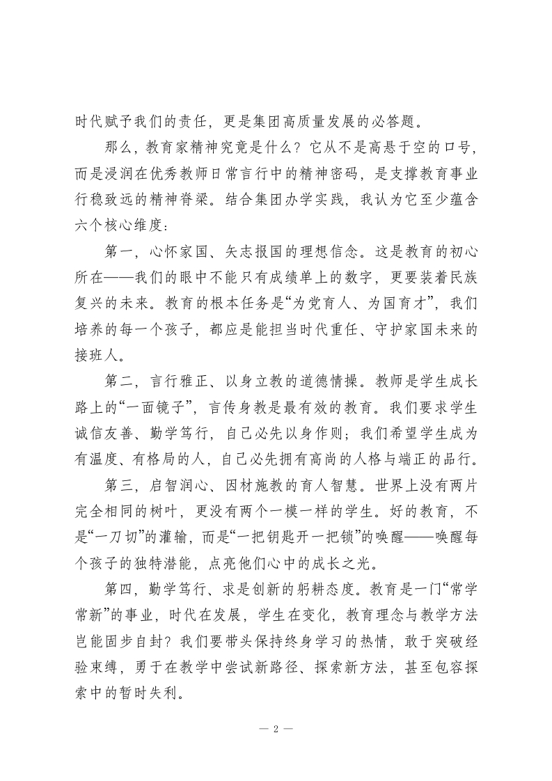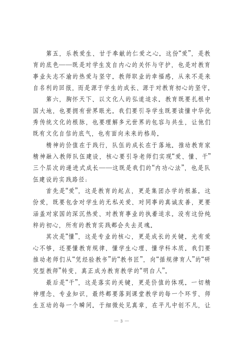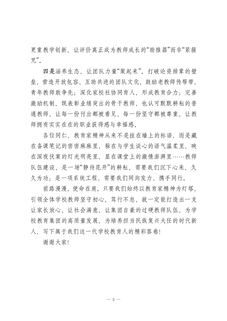 集团总校长在校务会议上的发言:深耕教育家精神实践,聚力集团教师队伍“强基提质”各位同仁:大家下午好!在座的每一位,都是学校教育集团各学部、校区的领航者与中坚力量。我们深知一个朴素而深刻的道理:一所学校的办学品质,核心在教师;教师队伍的精神风貌与专业素养,正是我们办学治校的“根”与“魂”。学校教育集团规模宏大、学部校区遍布、教师队伍来源多元,既有经验丰富的资深教师,也有充满活力的青年力量,人员结构与思想观念的多样性,既为集团发展注入了活力,也对队伍凝聚提出了更高要求一一正如古语所云“船大更需航向明”,教师队伍建设这根弦,容不得片刻松懈。我们必须以坚定的方向引领、科学的机制保障,让这支庞大的队伍始终沿着正确的教育航道稳健前行,避免陷入“积重难返”的被动局面。作为校长,我们既是教育家精神的践行者,更应是传播者与引领者。我们不仅要自身学深悟透教育家精神的内涵精髓,更要思考如何打破“文件文字”与“日常实践”的壁垒,让抽象的精神理念转化为老师们教书育人的具体行动、融入三尺讲台的每一个瞬间。说到底,我们的核心使命,就是打造一支政治坚定、师德高尚、业务精湛、充满爱心的“四有”好老师队伍一一这是1