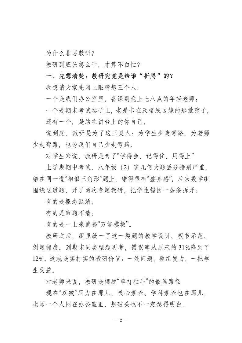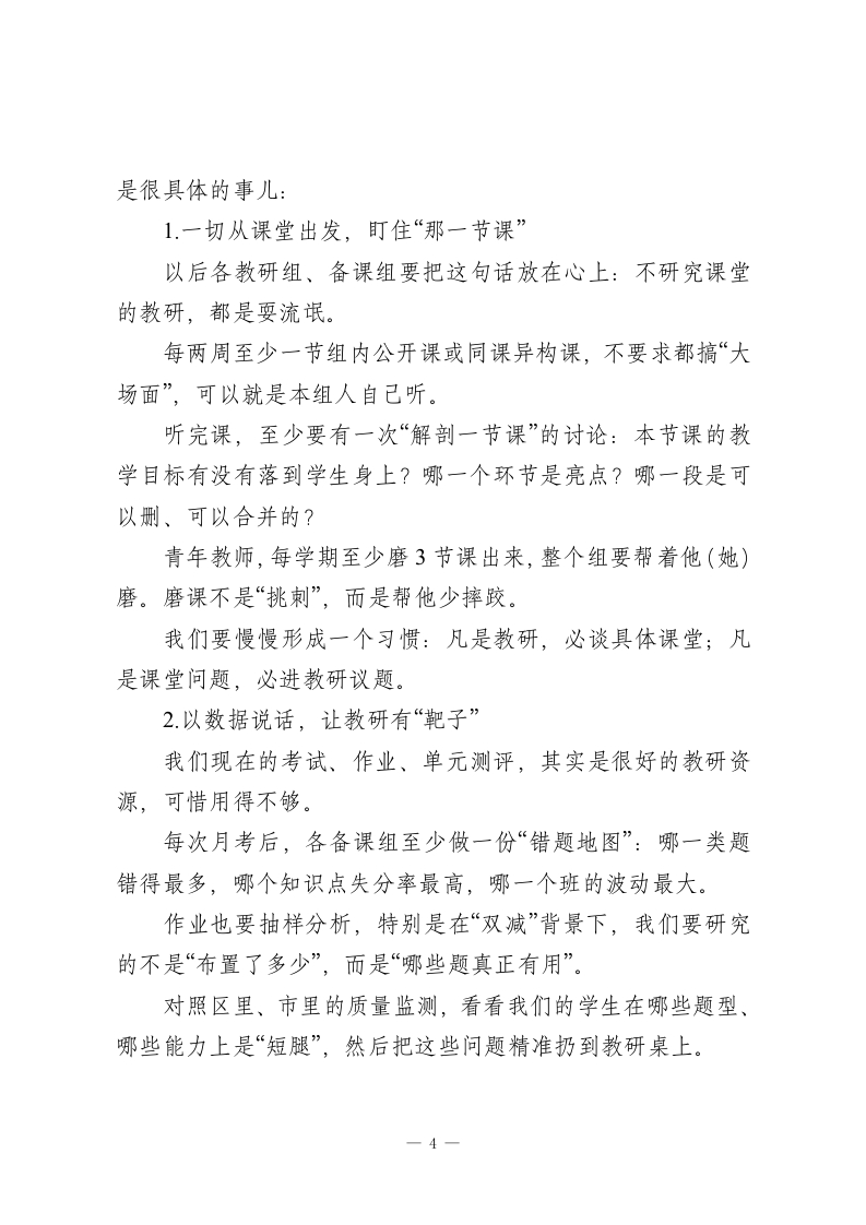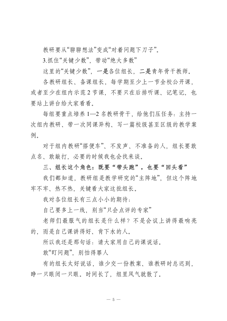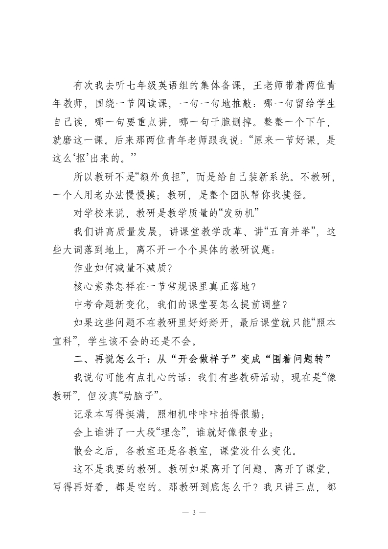 教研备课组长会议上,校长讲话:在一节课里看格局,在一份教案里见水平!各位教研组长、备课组长:下午好!刚才从三楼走过来,路过九年级语文组,看到你们办公室的白板上还写着“说明文阅读专题研讨(二)”,旁边用红笔圈了几个词:“概括能力”“审题失误”“答题模板”。我特意停了一分钟,看了看,又想了想一一我们今天这个会,核心就想围着一件事说清楚:教研到底在忙什么?忙给谁看?说实话,这几年,我们的教研活动次数一点不少:本学期截至现在,各学科组共开展教研活动46次;公开课、同课异构一共做了18节;纸面材料、照片、记录也一摞一摞。但是,另外一组数据也摆在那儿:上学期期末,全校语文、数学、英语三科平均分比全区平均还低了2.3分;七年级有3个班的数学基础题错误率超过25%;八年级历史选择题“时间轴”一类的题,错了一大片。这些数字告诉我们一个很现实的事情:教研动静不小,但离课堂、离学生,还有距离。今天我不打算讲大道理,就围着两个问题,跟大家掏掏心窝子:一1