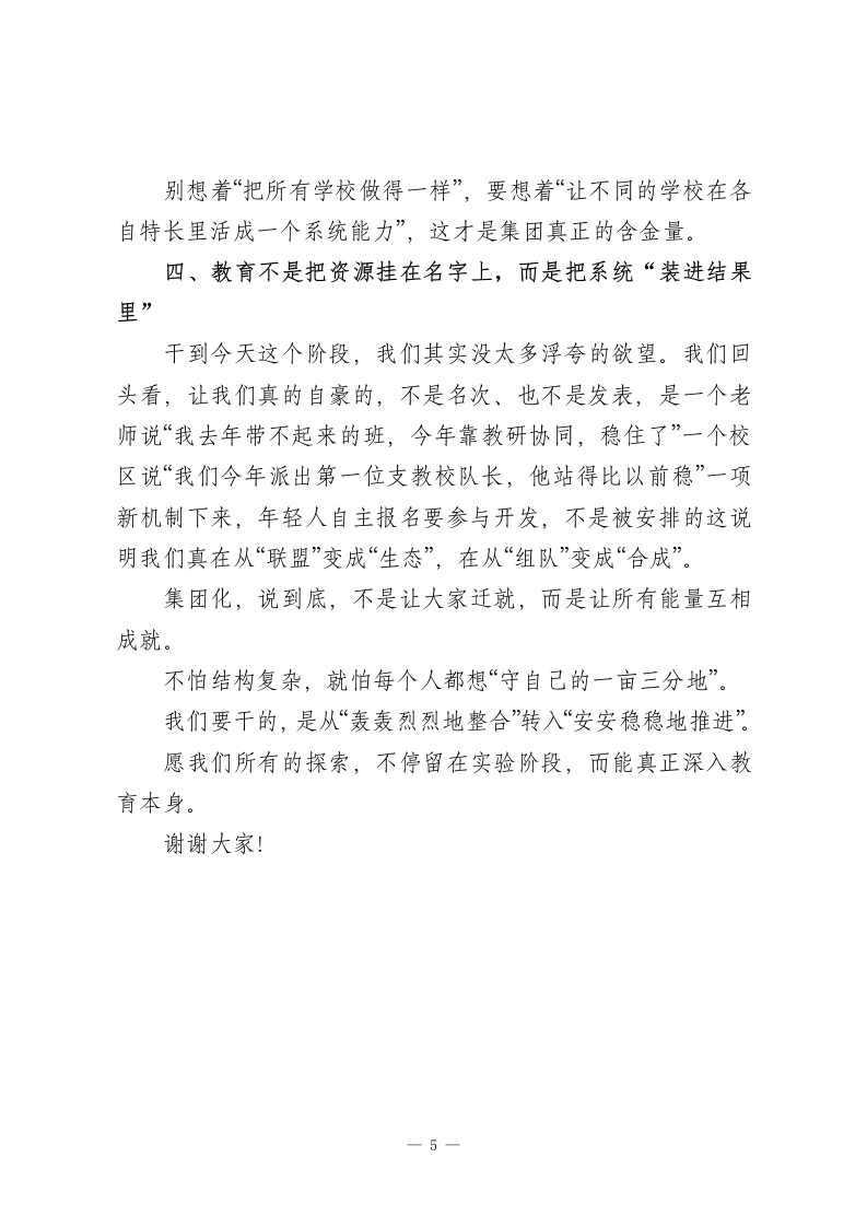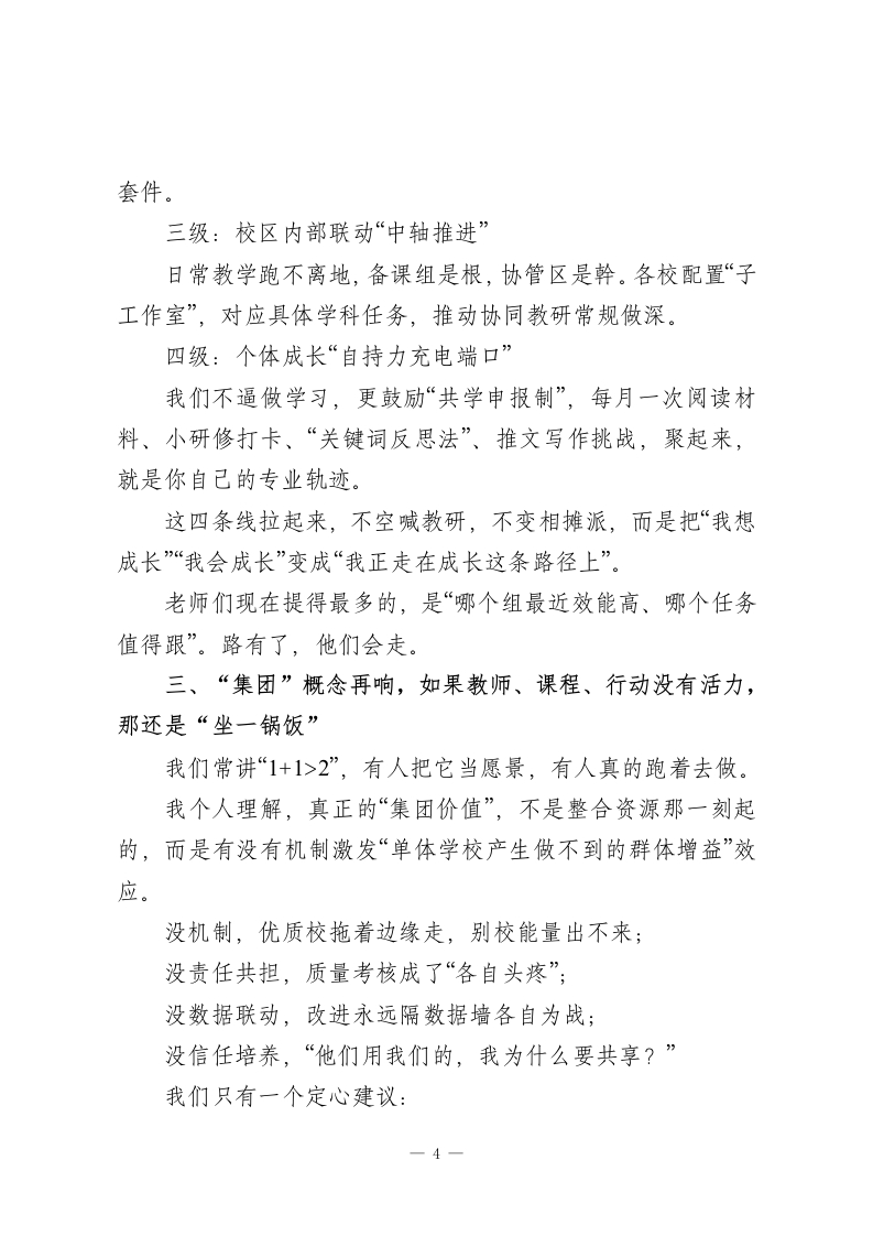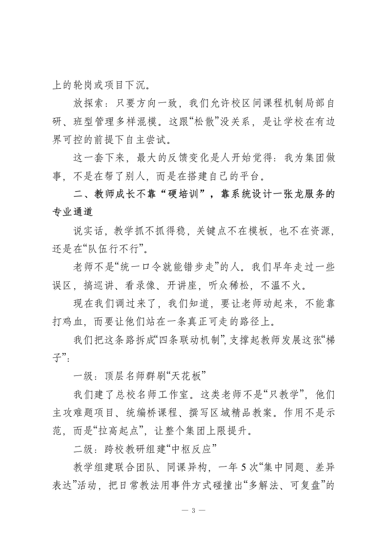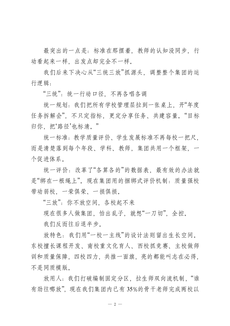 教育集团集团化办学经验,校长汇报发言:内部流出!“三统三放”的管理模式各位领导、各位专家:大家好。说实话,集团化办学这条路,我们走了几年了,从一开始把几所学校“拉过来合并挂名”,到现在基本架起了“一套体系、一个方向、一个队伍”的框架,我们亲身尝过甜,也栽过跟头。所以今天这场交流,我不想用太多术语来讲理念,想跟各位讲清楚的是:教育集团化不在“挂着联合”,而在“做得深入”。我们常听说一句话,说“一滴水只有融进大海才不会干涸”。教育也是,这几年确实不少地方都在尝试集团化、联合体、大学区,各种叫法其实逻辑是一样的把资源聚起来、把力量拧起来、让单校教育突破发展的“边界”。但讲到底,这事光讲“聚合”没用,关键是你怎么让“合”成为一个“活系统”,不是堆人、堆牌子、堆制度,而是让所有学校在这个系统中“再生长”。一、从物理整合到“情感磨合”我们是怎么把“看起来一起”变成“真正在一起”的老实讲,一开始,我们也经历过“貌合神离”的阶段。你叫大家开会,一套文件几个校区同时收,同样的活动,同样的教学指标、课时计划,但回到每个学校,干的还是“各自的节奏”。1