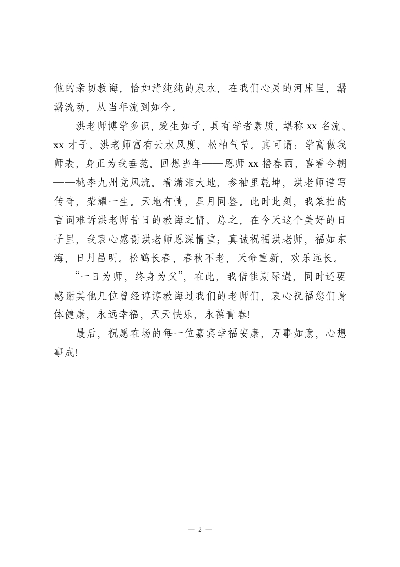 老教师生日会上,校长讲话他的生命,不仅在血气方刚时喷焰闪光,而且也在壮志年华中流霞溢彩尊敬的各位老师、亲爱的同学们,大家晚上好:时追辛卯,岁在壬申。在今天这样一个万物争荣的美好日子里,我们登岳麓山巅,聚南泥湾庄,恰良辰美景,适明月清风,听高山流水,闻天籁之音,同为洪x老师举行五十大寿庆典,此时此刻,我的心情与大家一样感到格外地激动与高兴,面对同学们久违的面孔,我仿佛又回到了xx那美好的校园之中,面对洪老师那慈祥的笑容,我感到无比地亲切与温馨,有位著名的作家说过:“在所有的称呼中,有两个最闪光、最动情的称呼:一个是母亲,一个是老师。老师的生命是一团火,老师的生活是一曲歌,老师的事业是一首诗。”那么,我们的恩师洪Xx老师的生命,更是一团燃烧的火;洪Xx老师的生活,更是一曲雄壮的歌;洪Xx老师的事业,更是一首优美的诗。洪老师在人生的旅程上,风风雨雨,历经沧桑50载,他的生命,不仅在血气方刚时喷焰闪光,而且也在壮志年华中流霞溢彩。洪老师的一生,视名利淡如水,看事业重如山。他热爱教育事业,舍不得莘莘学子,为振兴中华,在粉笔生涯中,度过了近30个春秋,宵衣旰食,呕心沥血,教我们如何学习,更教我们怎样做人。多少个日子里,洪老师与我们摸爬滚打,与我们笑谈人生,他的幽默风趣,让我们的学习生活如沐春风,1