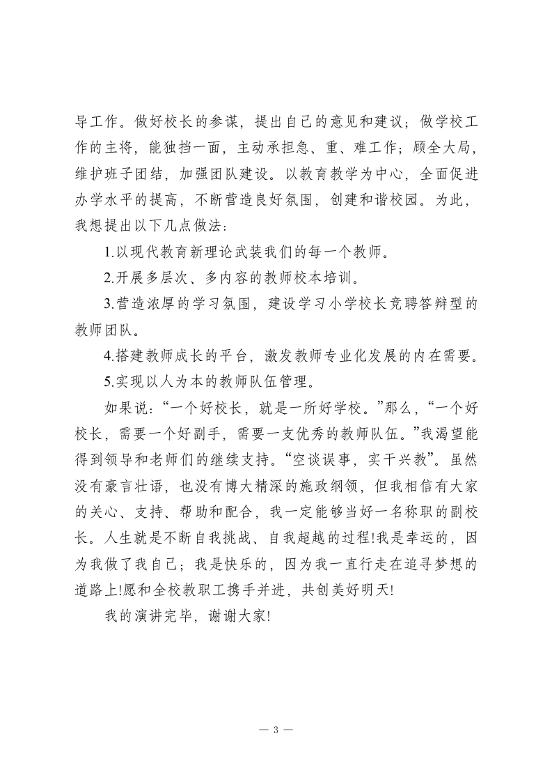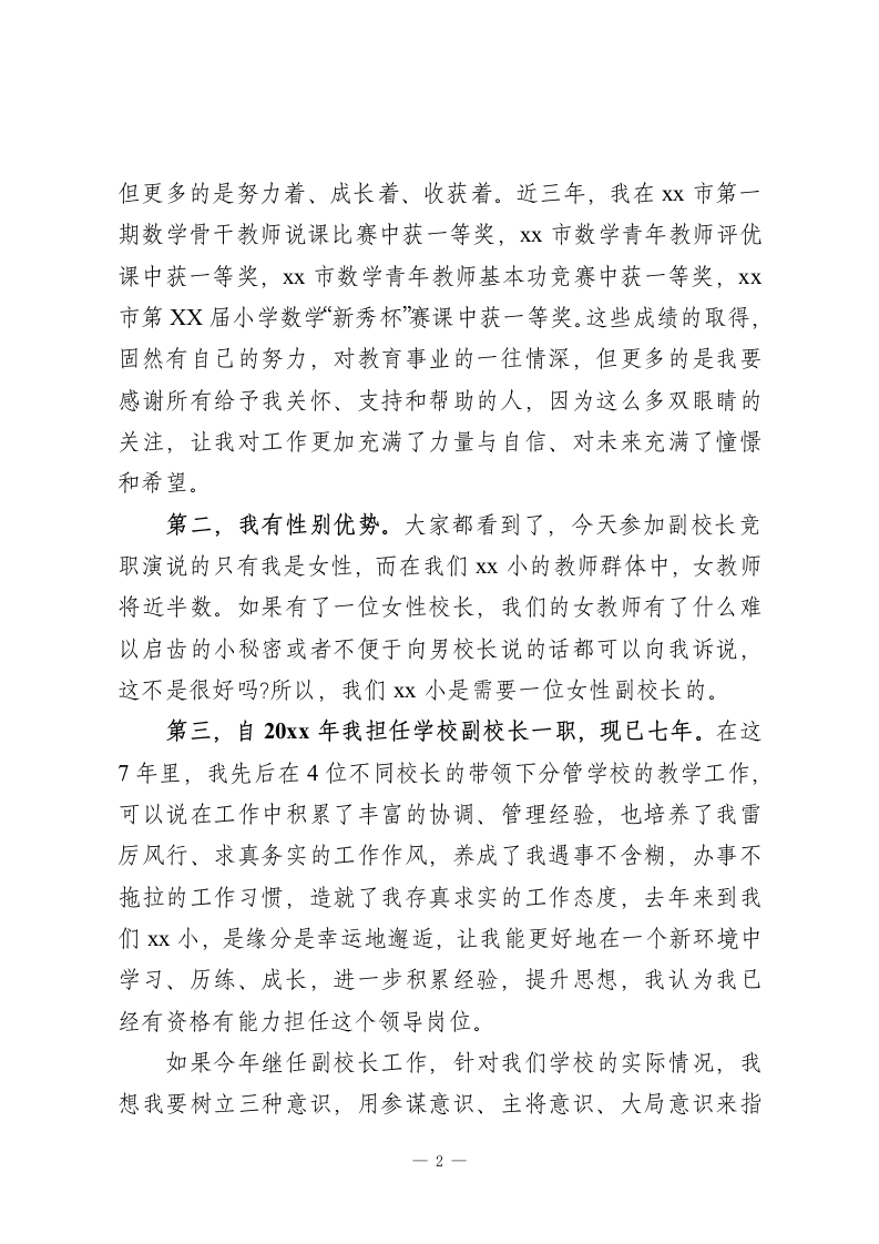 女副校长竞聘演讲如果有了一位女性校长,我们的女教师有了什么难以启齿的小秘密或者不便于向男校长说的话都可以向我诉说尊敬的各位领导、老师们:大家上午好!这是我第三次站在副校长的竞职演讲台上,时光流逝之快有时让我不敢回首凝望。20xx年8月,第一次站在Xx中心小学副校长的竞职演讲台上,紧张、激动、期待的心情犹如昨天,今天再一次站在这样的演讲台上,心里更多的则是冷静、反思、自省。还是先陈述我的竞聘理由:第一,对教育事业我有着饱满的热情和执着的信念。今年34岁的我,本科学历,中共党员,小学高级教师,x市第六批骨干教师,曾获“镇优秀gcdy、xx市优秀教育工作者、xx市师德先进个人、Xx市教科研先进个人”等称号。对自己所从事的专业教学,从没放弃过学习与研究,我知道不停地阅读、不停地实践、不停地反思、不停地写作是教师专业成长的必经之路。现在阅读是我享受生活的一种不可或缺的方式,课堂实践是我享受与学生生命共同成长的过程,教学反思成了我近两年持之以恒的事情,我的博客平台让我的思考更理性、更深刻、更完整。工作15年来,在专业发展之路中蹒跚过、驻足过、沮丧过,1