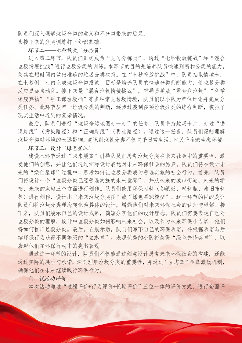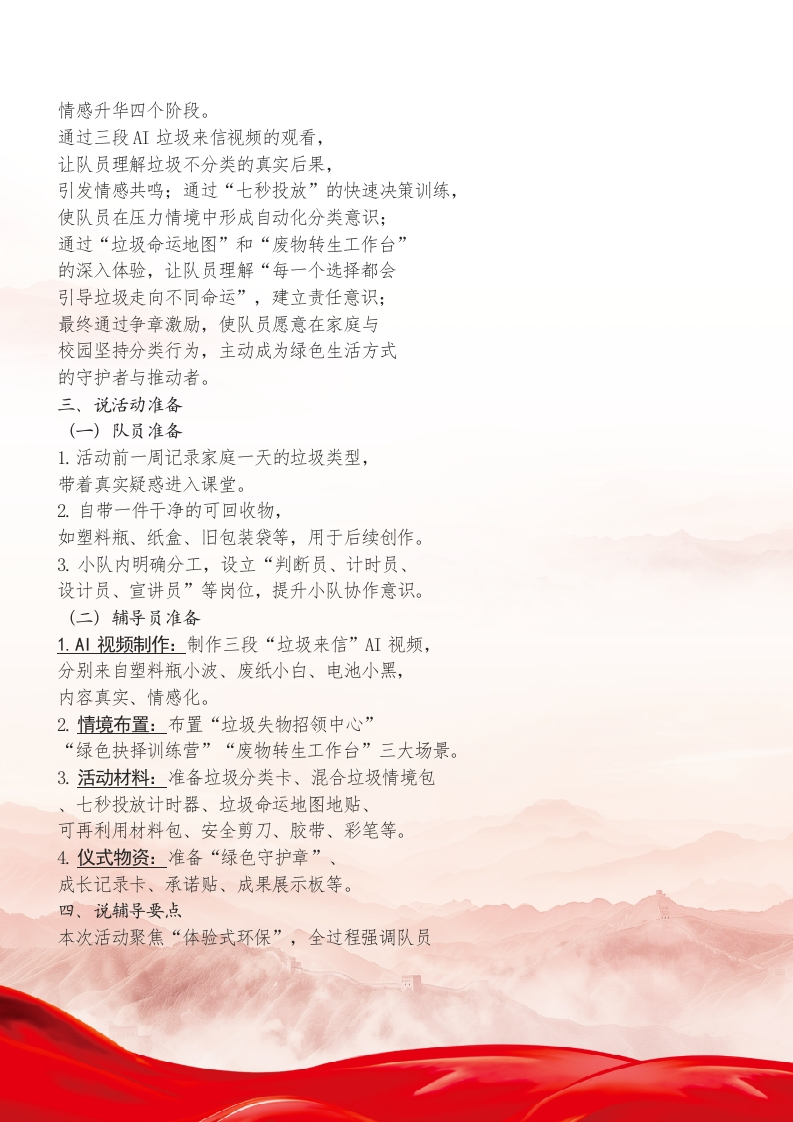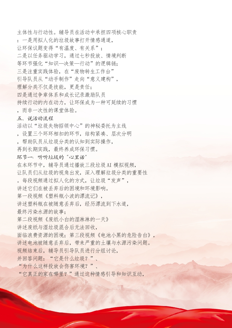 少先队辅导员活动课获奖说课稿一与垃圾“分”道扬镳尊敬的各位评委、辅导员老师们:大家好!今天的说课主题是《与垃圾“分”道扬镳》。我们以“垃圾失物招领中心”这一情境为切口,引导队员踏上一段“听判一做悟”的绿色旅程。队员们将在观看三段垃圾AI来信视频、完成七秒投放训练、为垃圾开启“第二次人生”的实践中争取“绿色守护章”,让环保意识从知识转化为习惯,从课堂流向生活。下面我将从活动背景、活动目标、活动准备、辅导要点、活动流程以及活动评价六个板块依次展开说课。一、说活动背景垃圾分类是简单却不容易做到的日常行为。许多队员知道口诀,却在真实生活中仍分不清“喝过的酸奶杯”“沾油的纸”“坏掉的玩具”“电池”等该如何处理。环保教育若仅停留在说教层面,队员很难形成真实的内部动机。因此,本次活动课程以“垃圾会说话”这一拟人化切口,设计“垃圾来信室绿色抉择训练营一废物转生工作台”三段递进式学习旅程通过沉浸式体验、情境判断、创意改造等任务,让队员在“看见问题一参与过程做出选择形成习惯”的实践链条中实现环保意识的真实生长。课程紧扣《少先队活动课程指导纲要(2021年版)》中提出的“贴近生活、倡导实践、强化责任”要求,并融入“红领巾争章”体系,使环保教育从知识层面跃升为行动品格。二、说活动目标本次活动旨在以任务串联的方式,让队员经历情境认知、快速判断、动手创造与